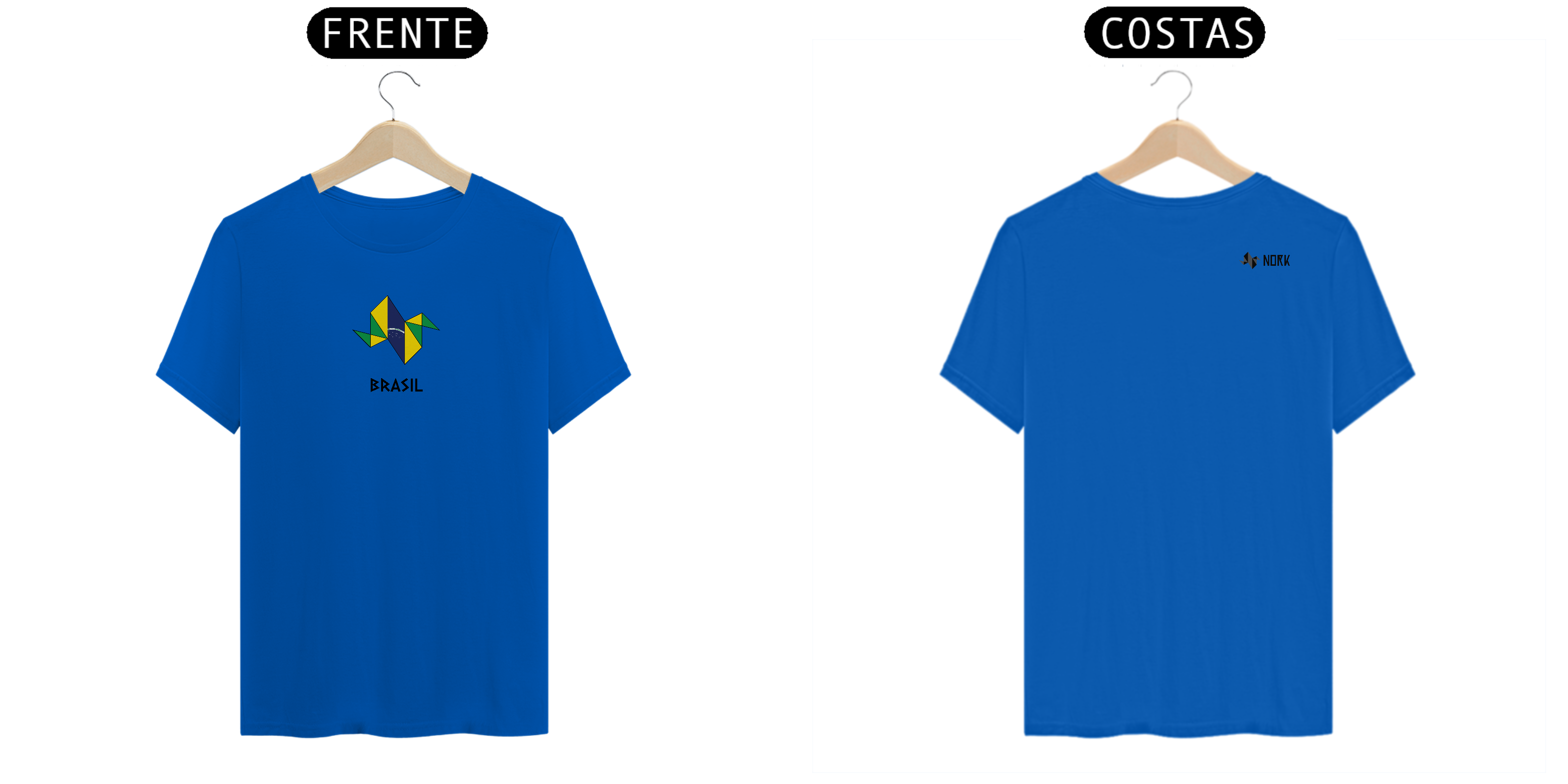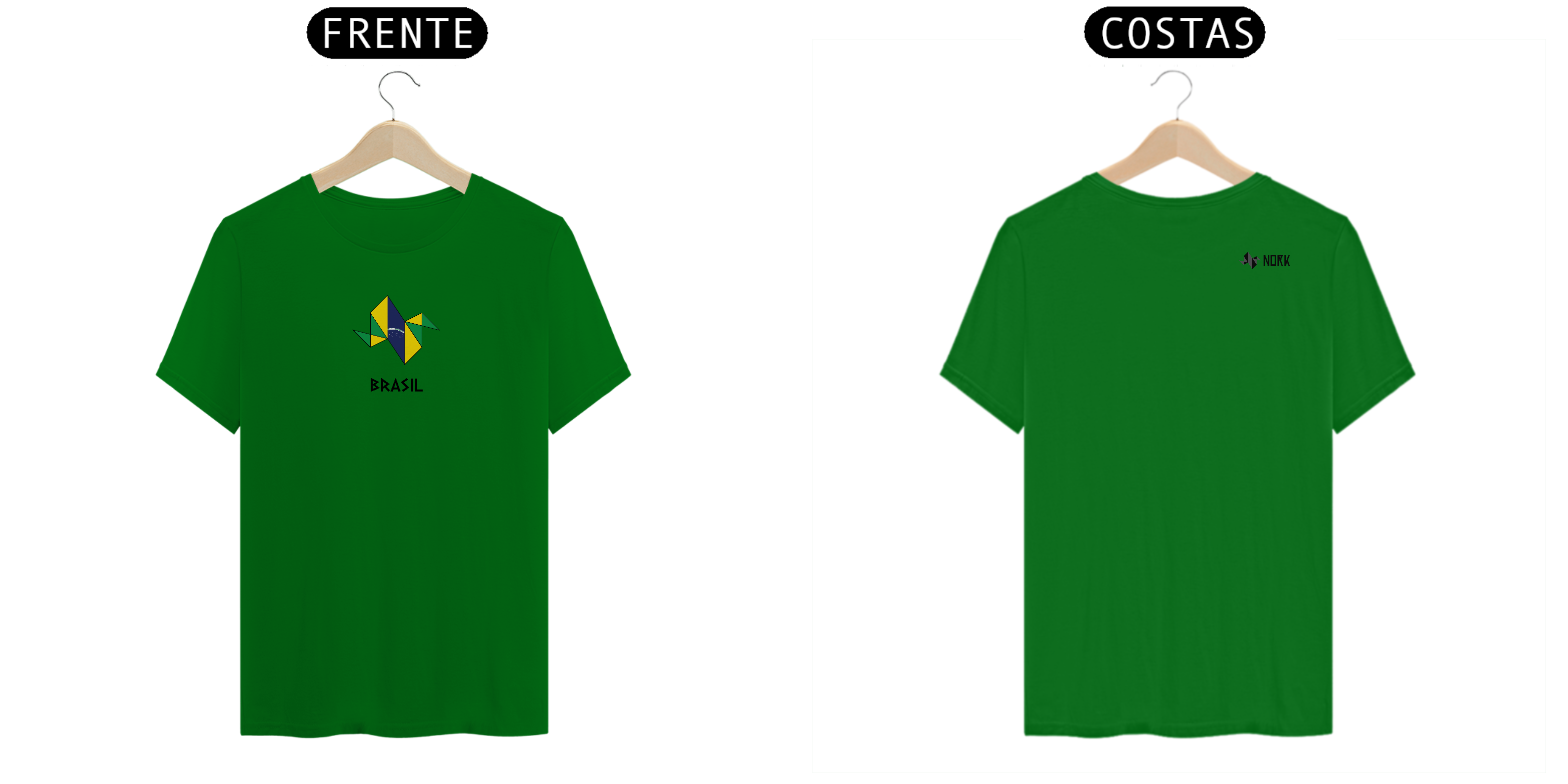 A estampa homenageia o Brasil com um design geométrico moderno e vibrante. Um pássaro formado por triângulos simboliza a força e a liberdade, com as cores verde, amarelo, azul e branco representando a bandeira nacional. O azul estrelado no centro, com o lema "Ordem e Progresso", destaca o otimismo e a união do povo brasileiro. A palavra "BRASIL", em uma tipografia angular e marcante, completa o design, criando uma peça que transmite energia, patriotismo e estilo contemporâneo.