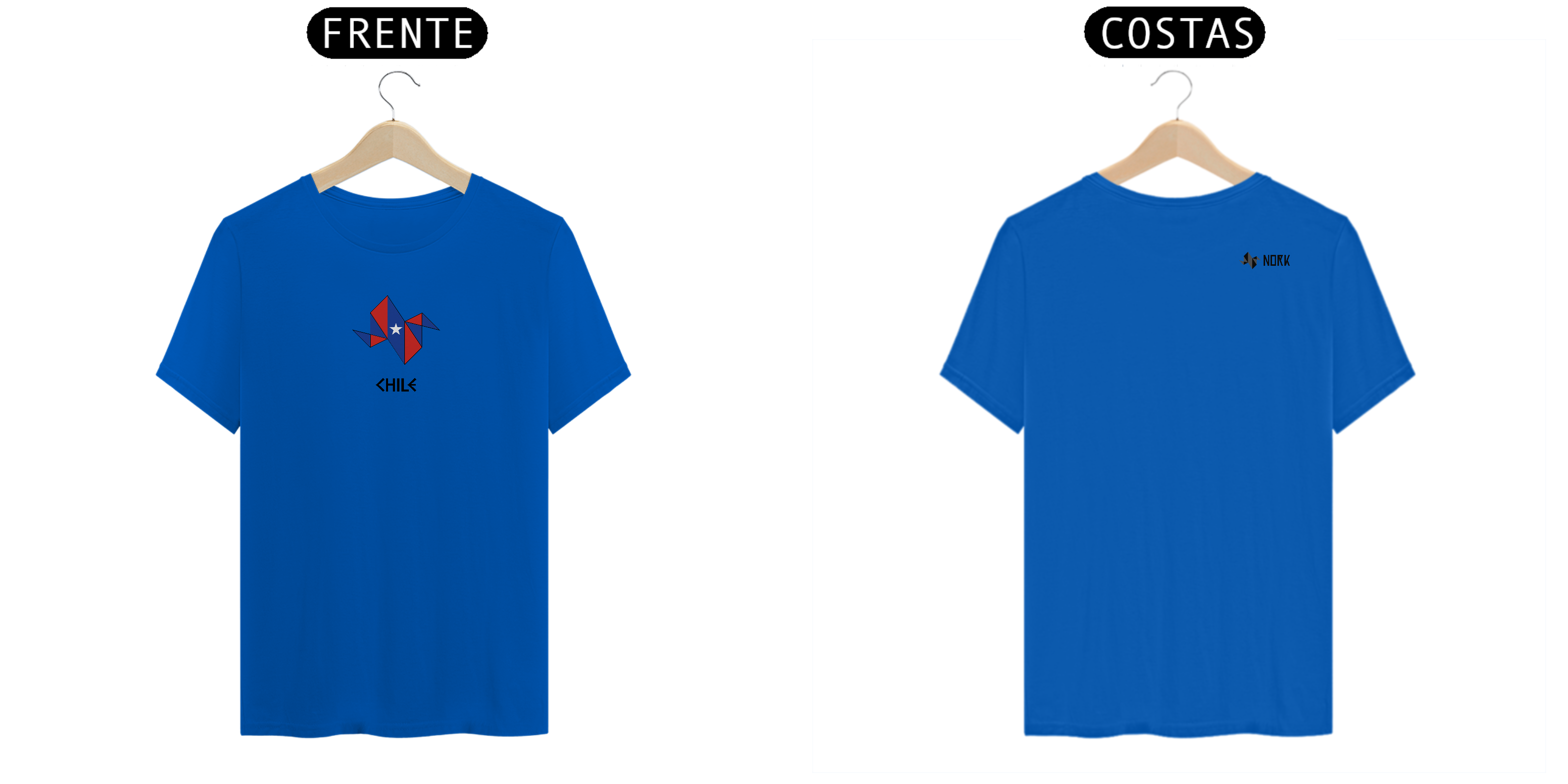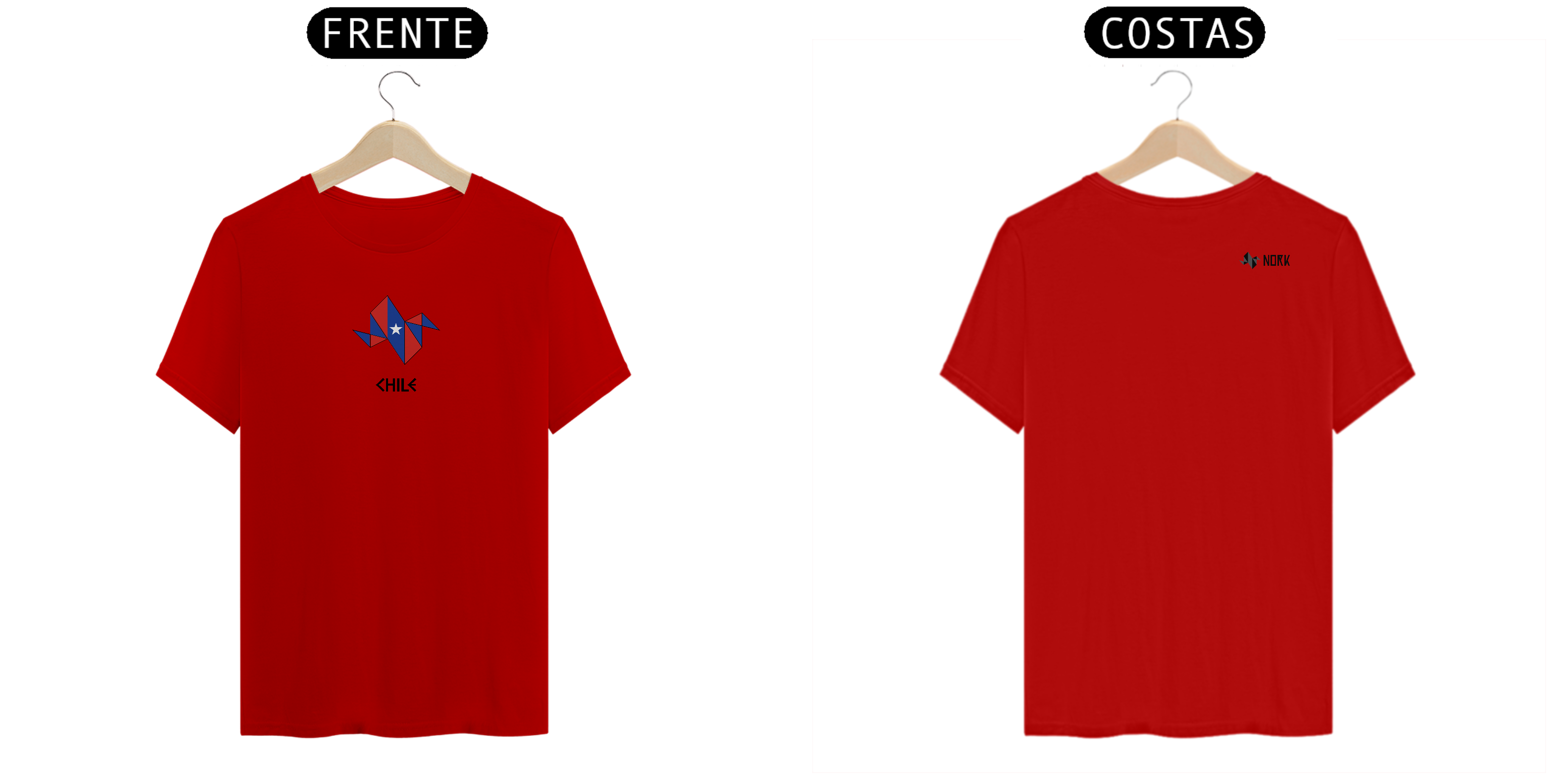 A estampa apresenta a logo da Nork em formato de origami, estilizada com as cores da bandeira do Chile: azul, branco e vermelho. A estrela central simboliza o progresso e a honra, representando o espírito resiliente e determinado do povo chileno. O design geométrico reflete modernidade e sofisticação, enquanto a palavra "CHILE", em uma tipografia angular e marcante, complementa o visual, destacando a força e o orgulho nacional.