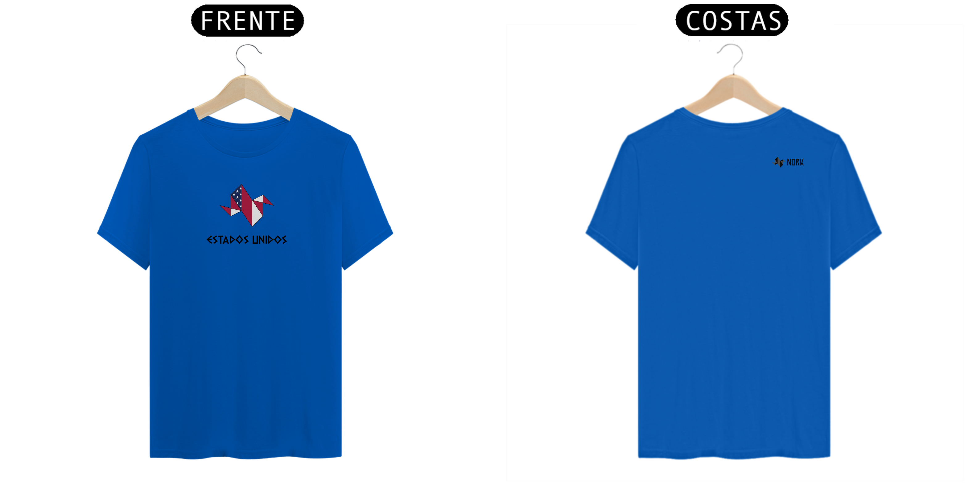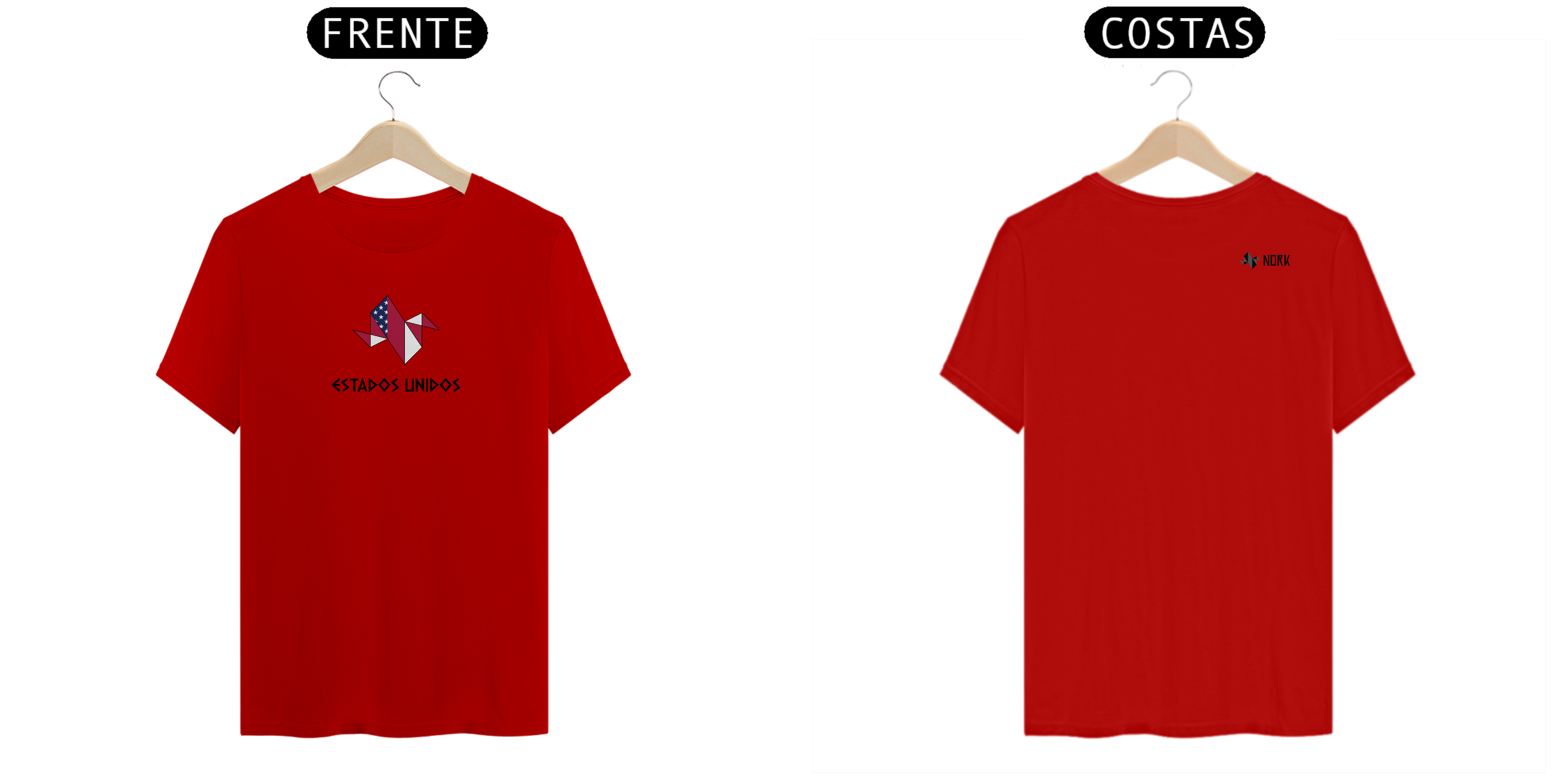 A estampa exibe a logo da Nork em formato de origami, estilizada com as cores e elementos da bandeira dos Estados Unidos: vermelho, branco e azul, complementados pelas estrelas e listras icônicas. O design geométrico representa modernidade e patriotismo, destacando a força e os valores do país. A palavra "ESTADOS UNIDOS", apresentada em uma tipografia angular e impactante, completa o visual, criando uma peça marcante e cheia de significado.
