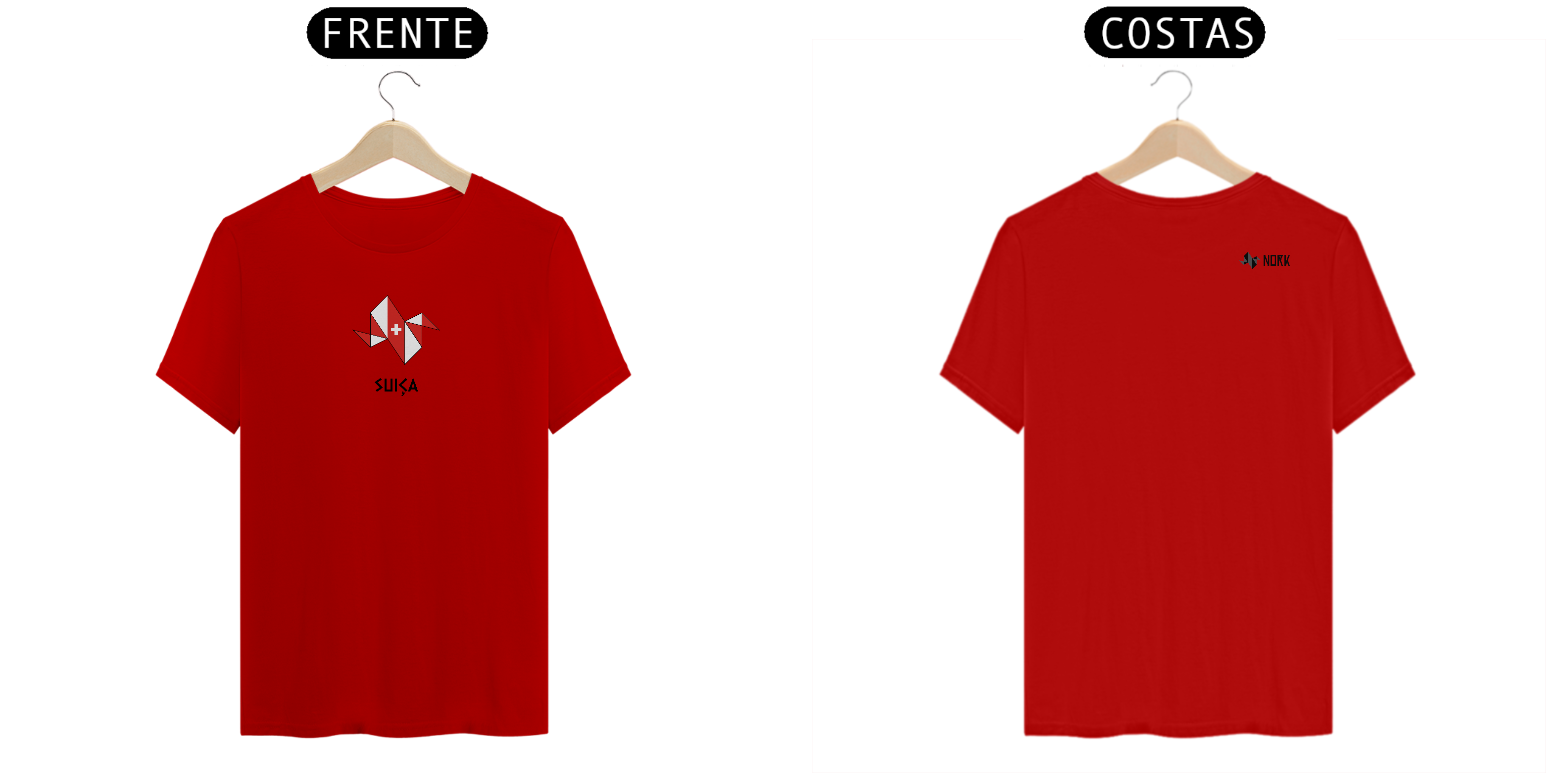 A estampa traz a logo da Nork em formato de origami, destacada pelas cores da bandeira da Suíça: o vermelho vibrante e o branco puro. O design geométrico da logo em origami é complementado pelo icônico símbolo da cruz branca, representando neutralidade, paz e tradição. A palavra "SUÍÇA", escrita em uma fonte moderna e estilizada, reforça a sofisticação do país e o equilíbrio do design.