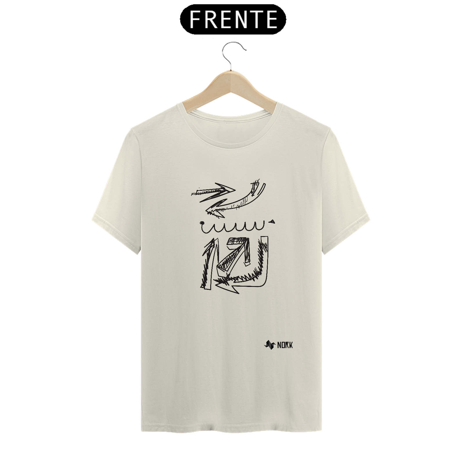 A composição gráfica desta estampa é formada por flechas em diferentes direções e traçados variados que criam uma sensação de movimento e dinamismo. A sobreposição de linhas, texturas e o uso de curvas e ângulos pontiagudos remetem a escolhas, caminhos e fluxos de energia. O fundo branco reforça o impacto visual dos traços pretos, destacando o contraste.