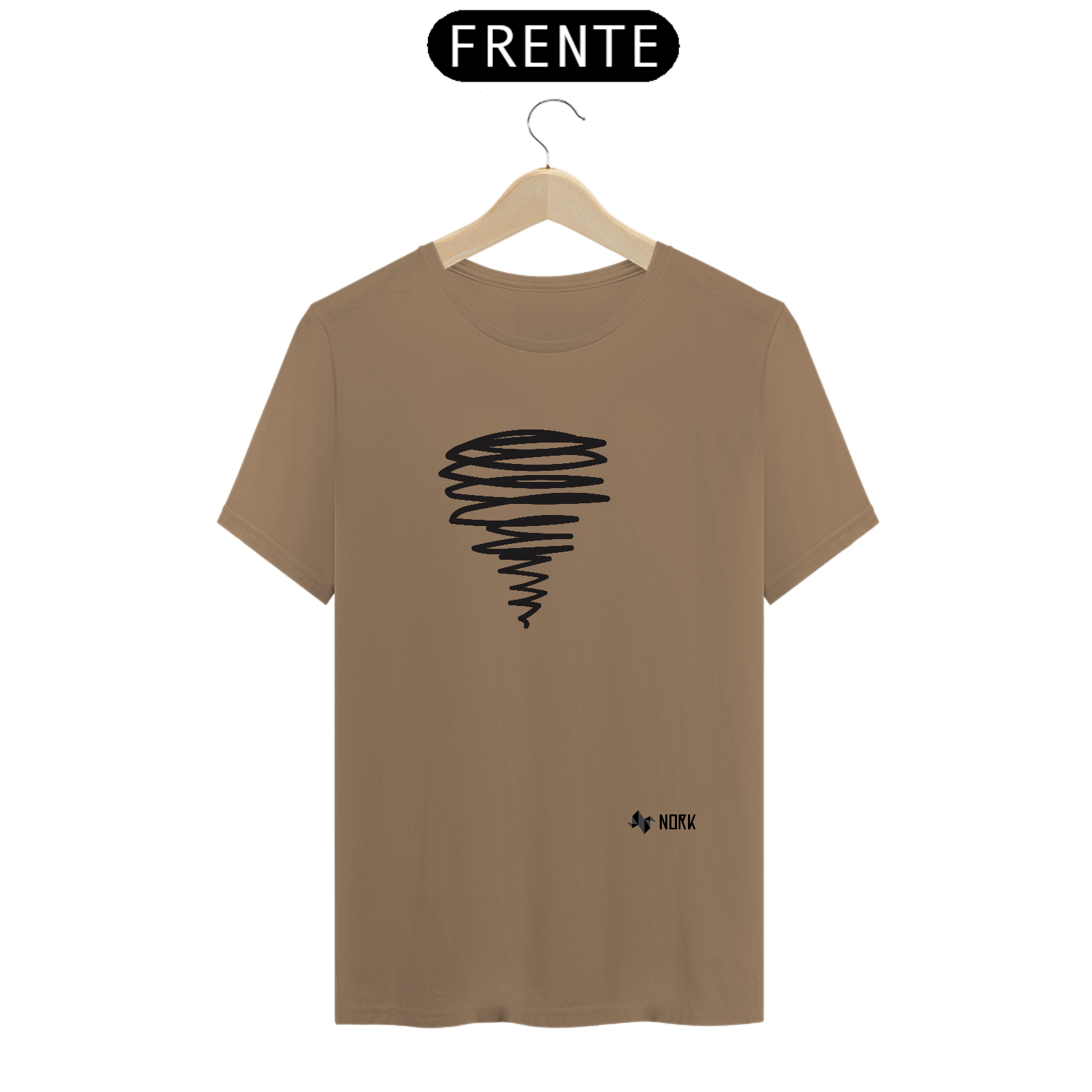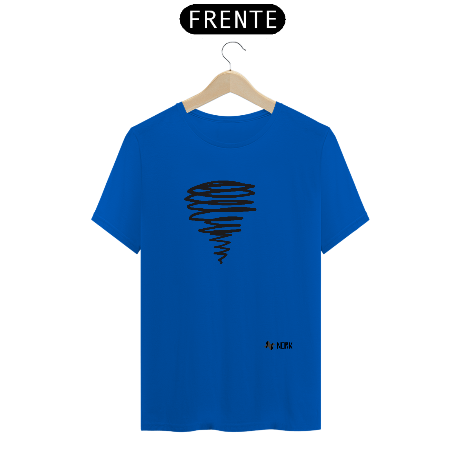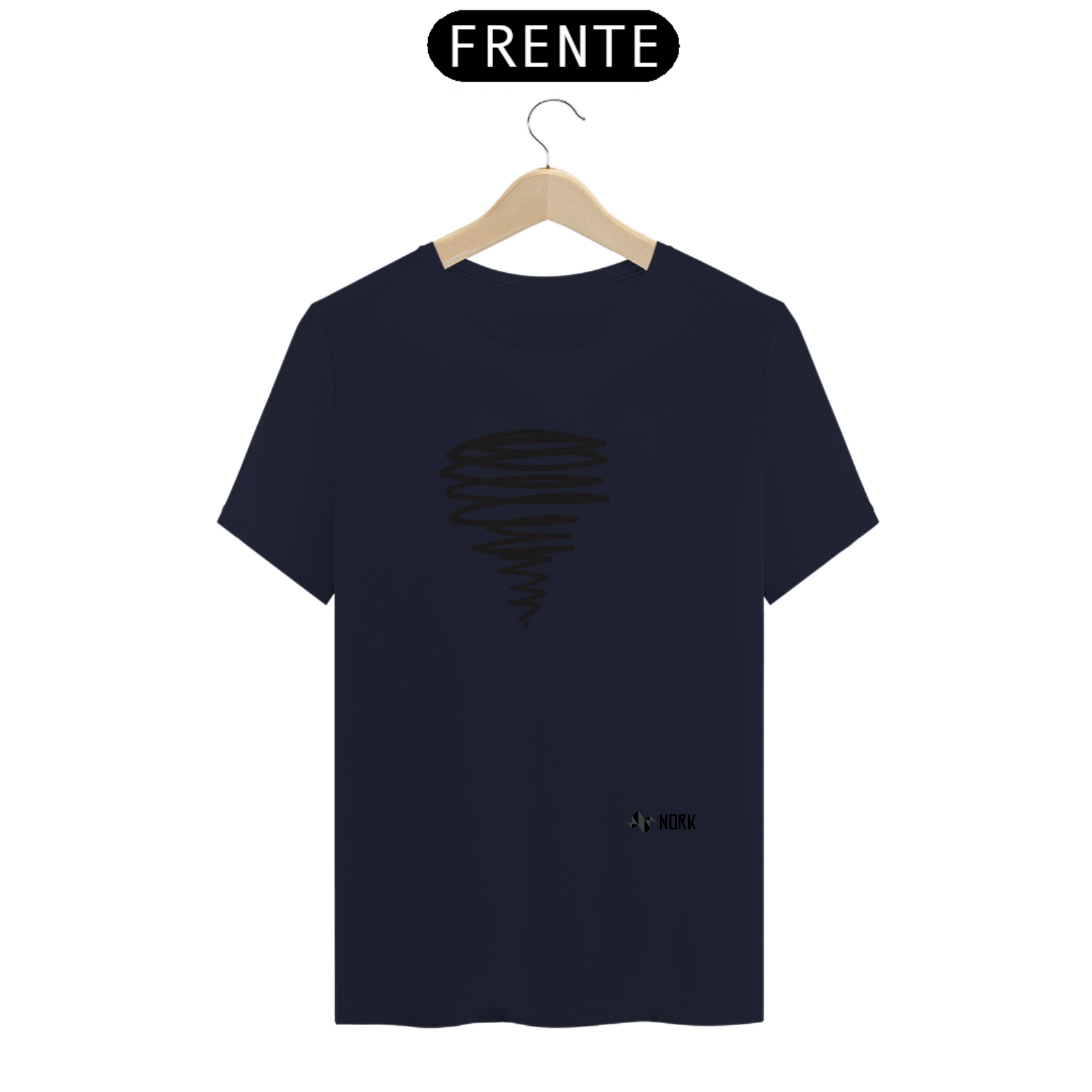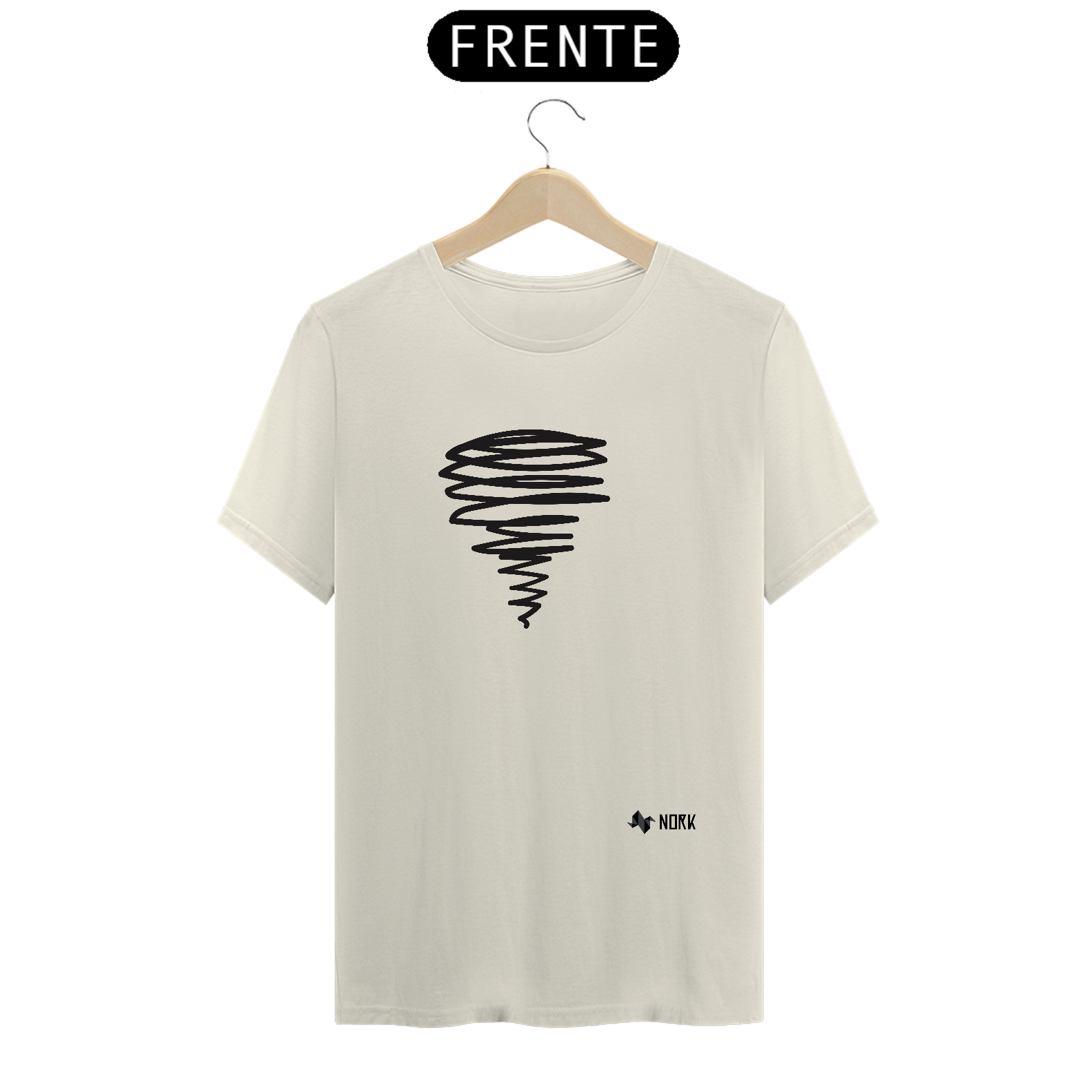 Uma espiral alongada em traços pretos, que se afunila em direção à base, remetendo a um tornado ou redemoinho em movimento. As linhas irregulares e fluidas criam uma sensação de dinamismo e energia, característica da Coleção Nork Rabisco, transmitindo um visual expressivo e cheio de atitude.