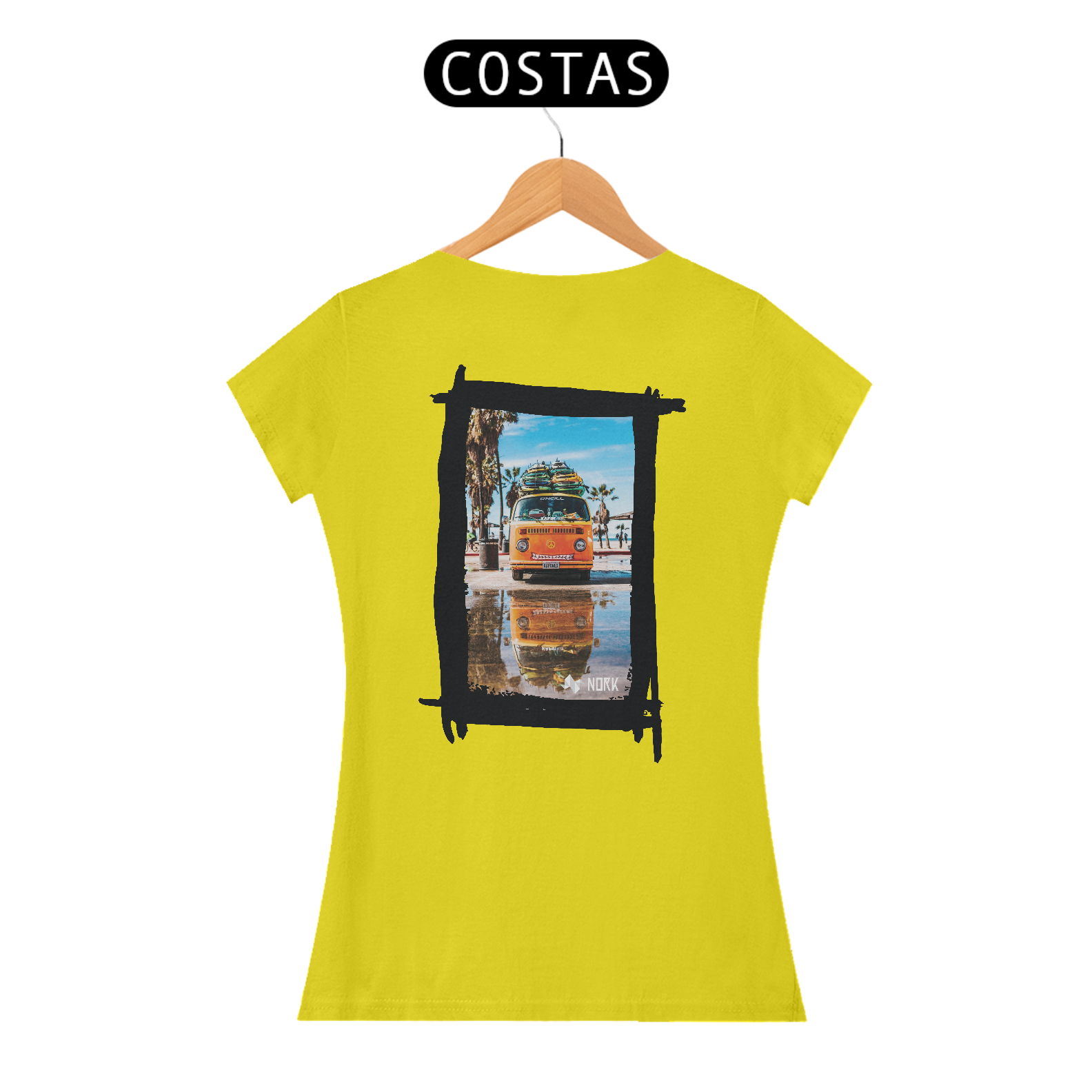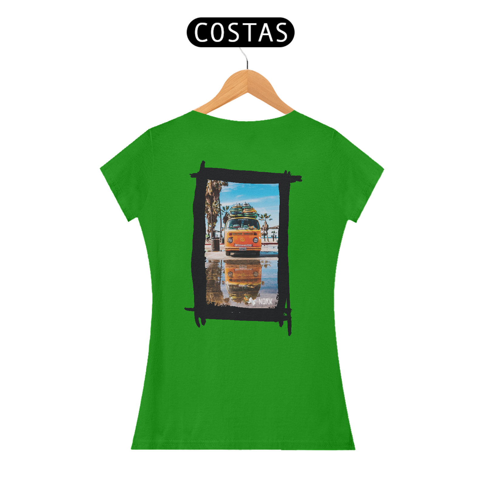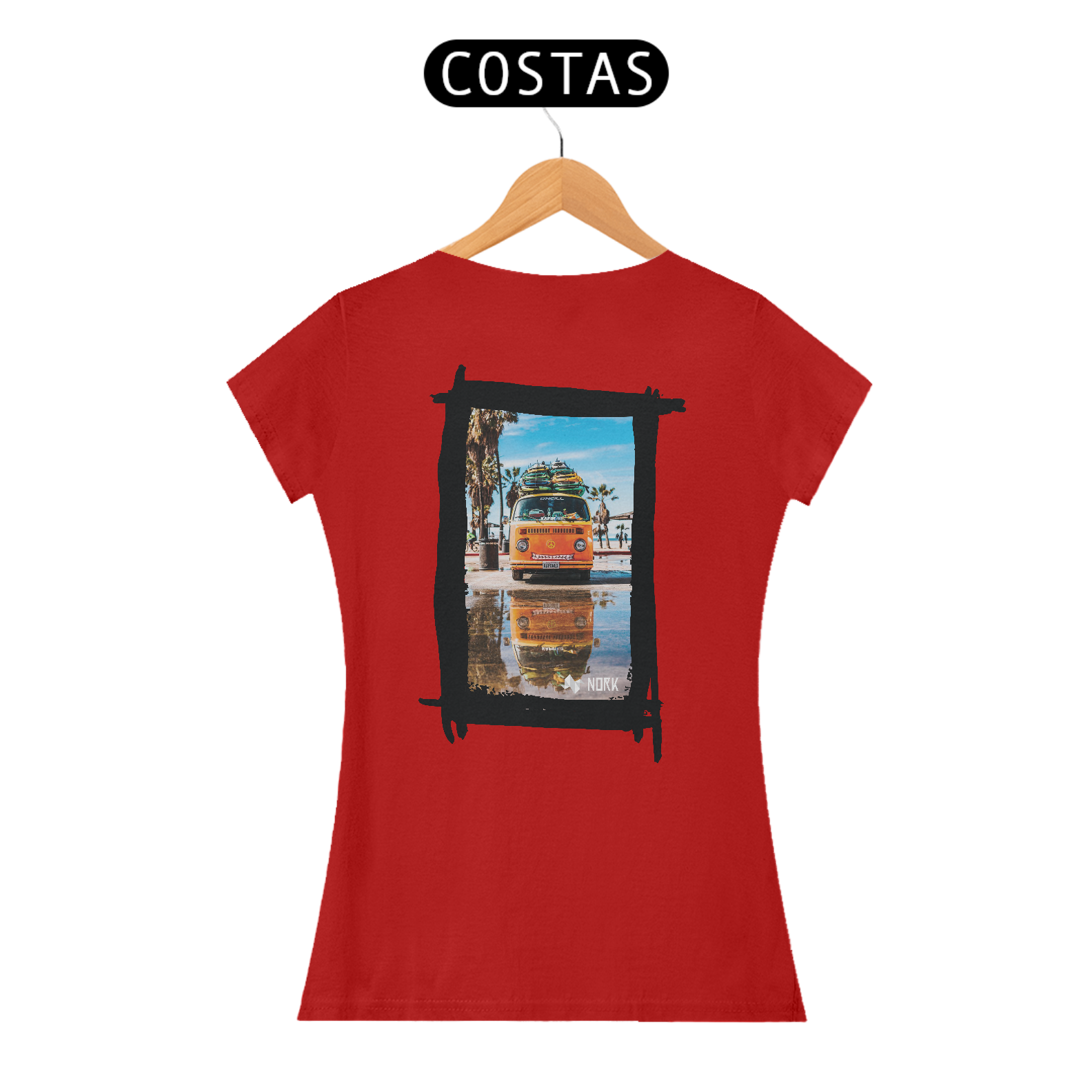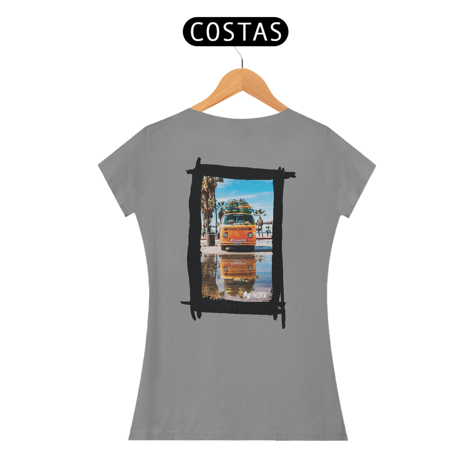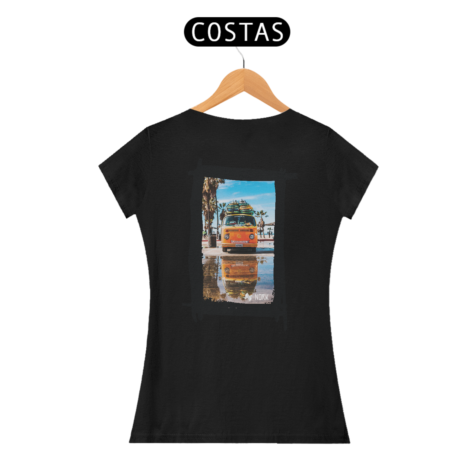 A camisa apresenta uma arte vibrante e descontraída, com uma van clássica de cor laranja brilhante carregada com pranchas de surfe no teto. O design remete ao espírito livre e à cultura do surfe, com palmeiras e um céu azul claro ao fundo, evocando a energia e a alegria de um dia ensolarado na praia. O reflexo da van em uma poça d'água no chão adiciona um elemento visual intrigante, criando simetria e profundidade na composição. O logo da Nork está posicionado discretamente na parte inferior, complementando o visual com um toque de sofisticação.