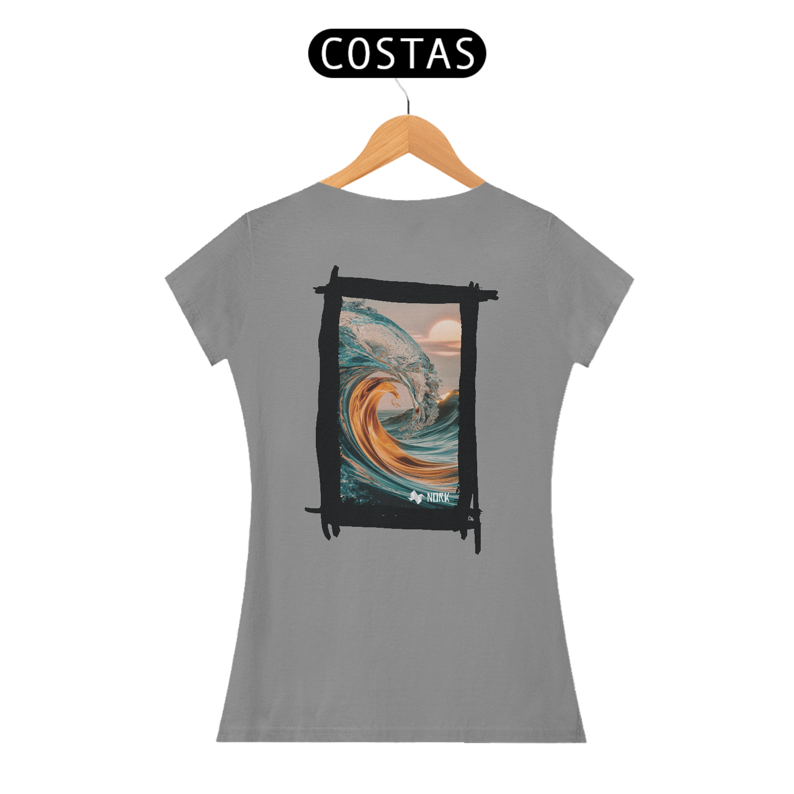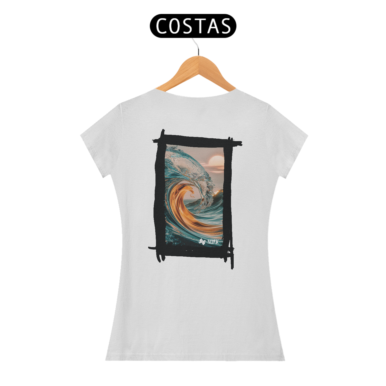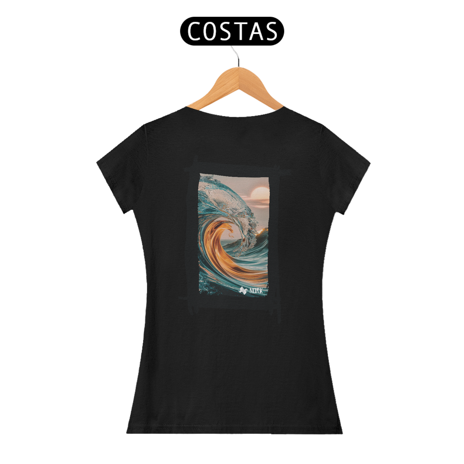 A camisa exibe uma arte impressionante que une a força do oceano com uma estética etérea. A composição apresenta uma onda em tons de azul cristalino misturada a nuances douradas que evocam a luz do sol, criando uma sensação de energia e calor. A curva perfeita da onda, capturada com detalhes precisos, transmite a grandiosidade e a beleza dinâmica do mar, enquanto o fundo com um céu suave e um sol nascente ou poente adiciona serenidade e harmonia ao visual. O jogo de cores e texturas cria uma peça que simboliza tanto a força quanto a tranquilidade do oceano, ideal para quem busca um estilo que equilibre intensidade e leveza. O logo da Nork está posicionado discretamente na parte inferior, reforçando a exclusividade da peça.