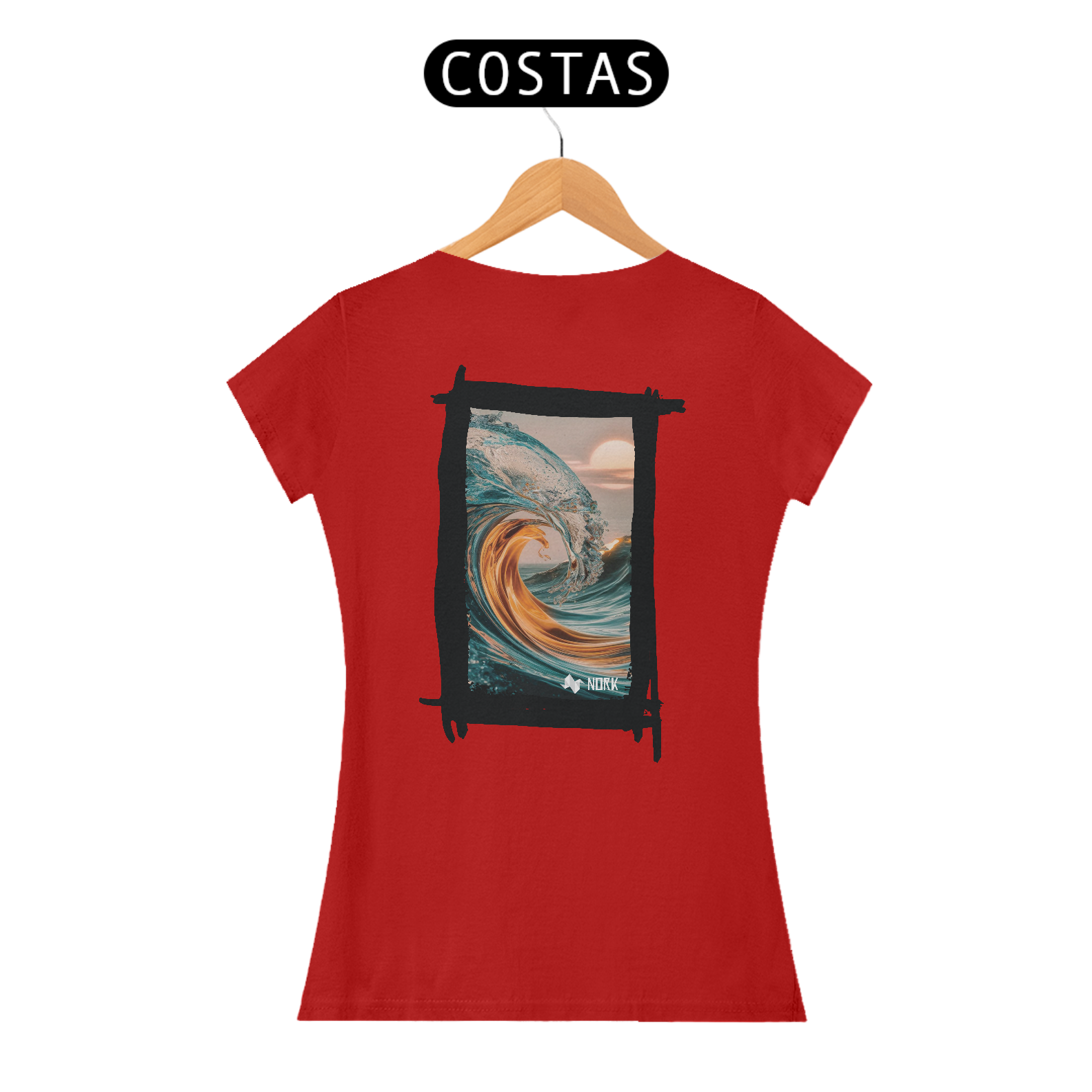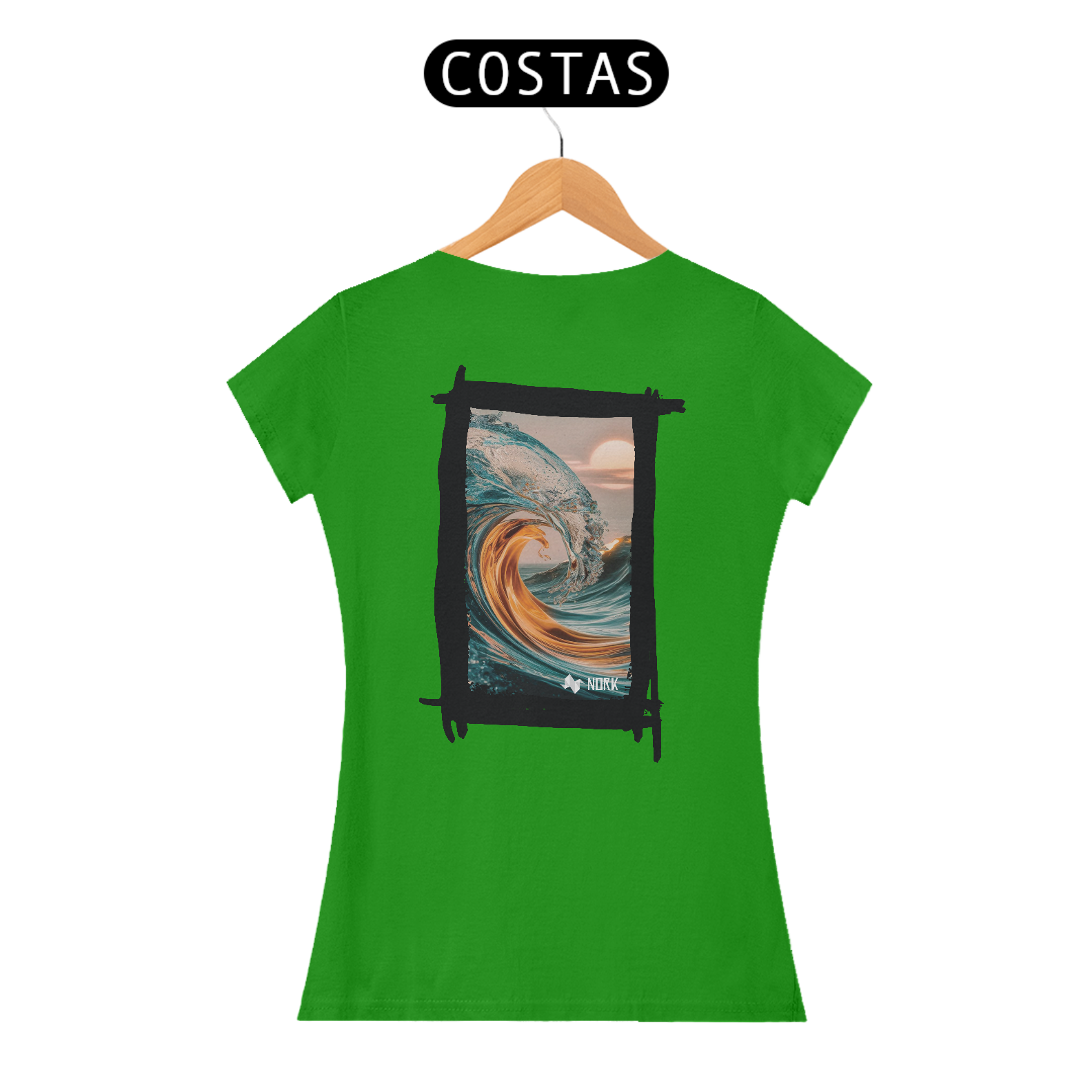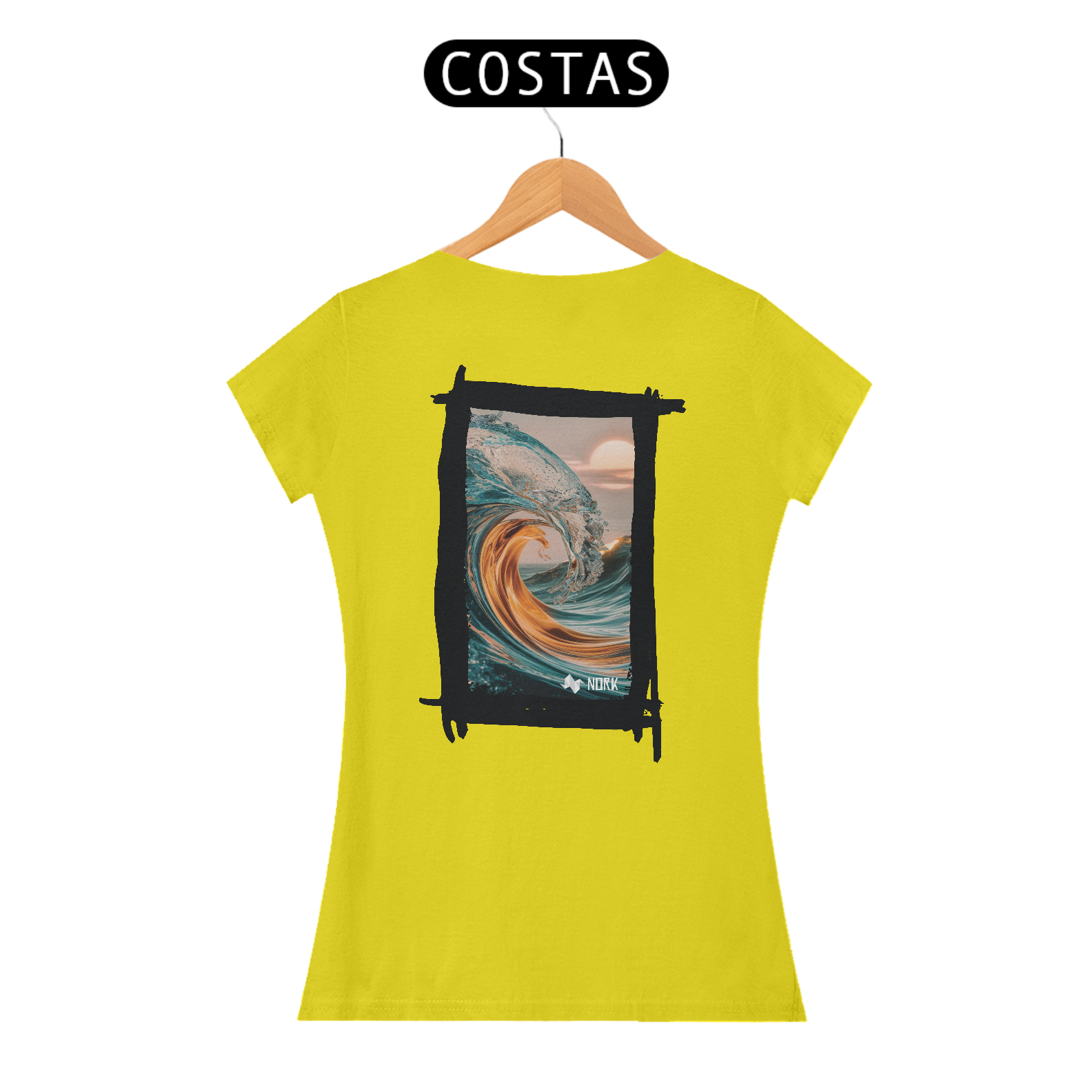 A camisa exibe uma arte impressionante que une a força do oceano com uma estética etérea. A composição apresenta uma onda em tons de azul cristalino misturada a nuances douradas que evocam a luz do sol, criando uma sensação de energia e calor. A curva perfeita da onda, capturada com detalhes precisos, transmite a grandiosidade e a beleza dinâmica do mar, enquanto o fundo com um céu suave e um sol nascente ou poente adiciona serenidade e harmonia ao visual. O jogo de cores e texturas cria uma peça que simboliza tanto a força quanto a tranquilidade do oceano, ideal para quem busca um estilo que equilibre intensidade e leveza. O logo da Nork está posicionado discretamente na parte inferior, reforçando a exclusividade da peça.