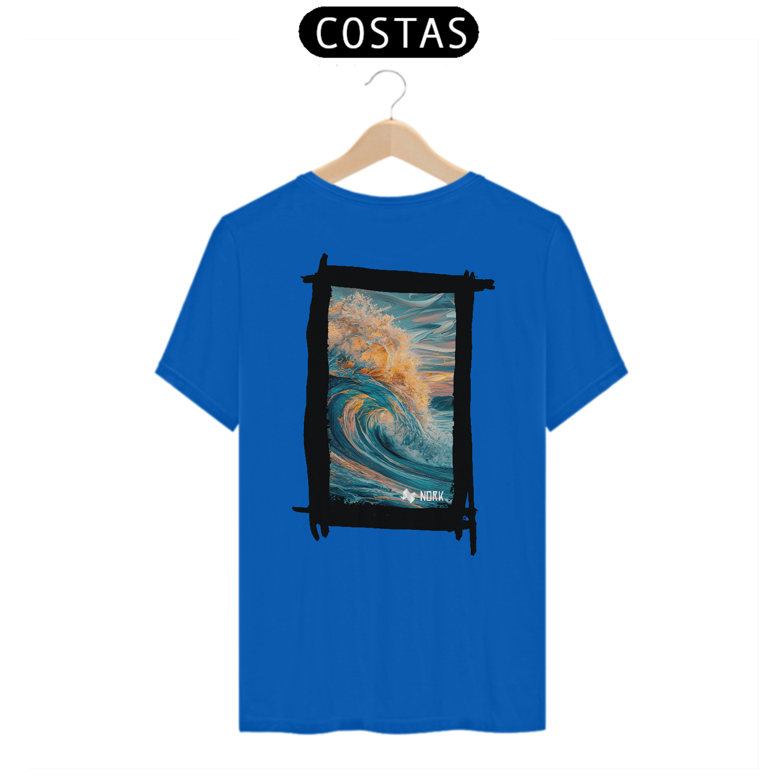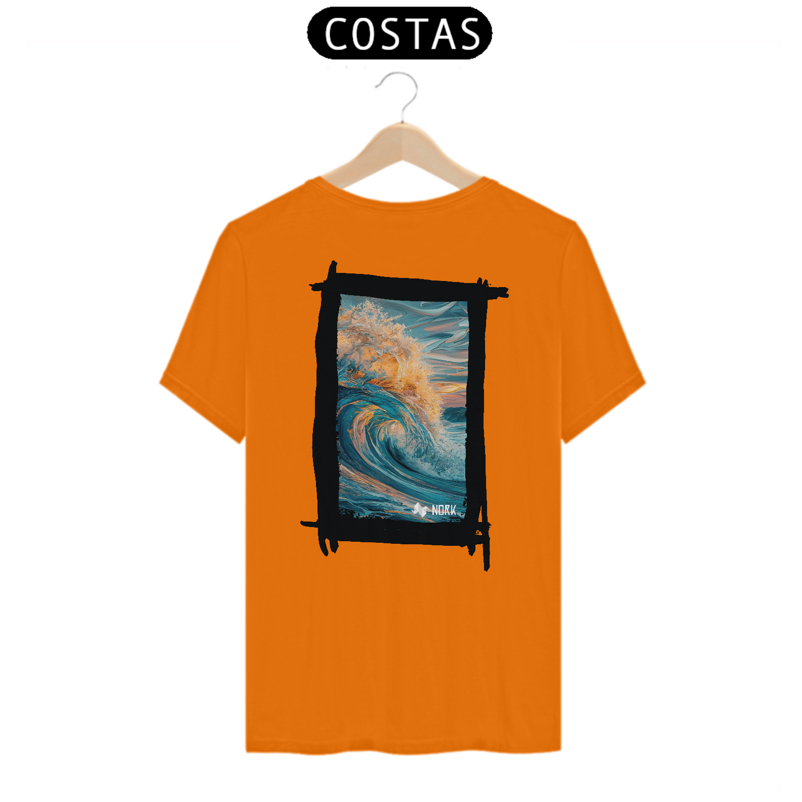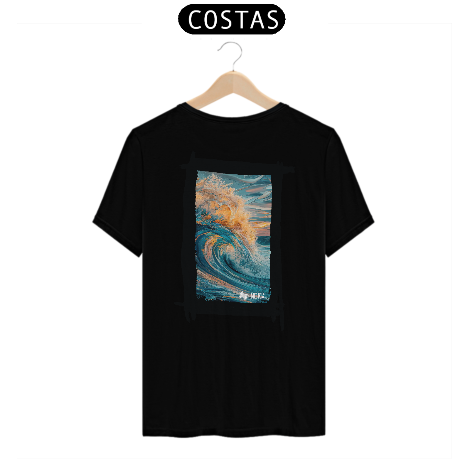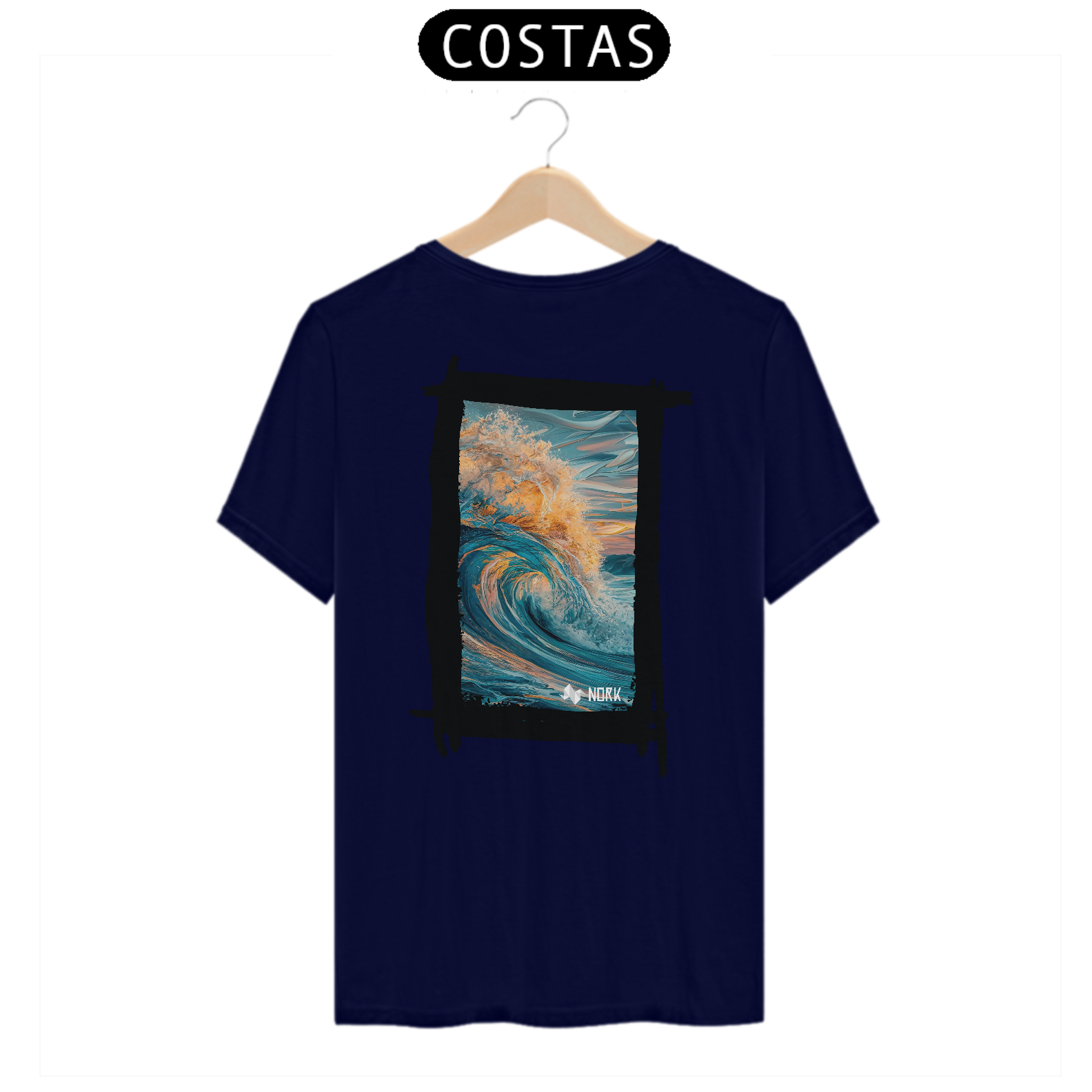 A camisa apresenta uma arte deslumbrante que captura o movimento poderoso e a energia de uma onda em seu auge. A composição exibe tons profundos de azul misturados a nuances quentes de laranja e dourado, simbolizando a luz do sol refletida na água. A riqueza de detalhes na espuma e no movimento dinâmico da onda cria uma sensação de fluidez e intensidade. O fundo apresenta suaves pinceladas que evocam o céu ao amanhecer ou ao entardecer, reforçando a conexão com a natureza e o oceano. O design é vibrante e impactante, perfeito para quem busca expressar liberdade e energia. O logo da Nork está discretamente posicionado na parte inferior, mantendo o equilíbrio visual da peça.