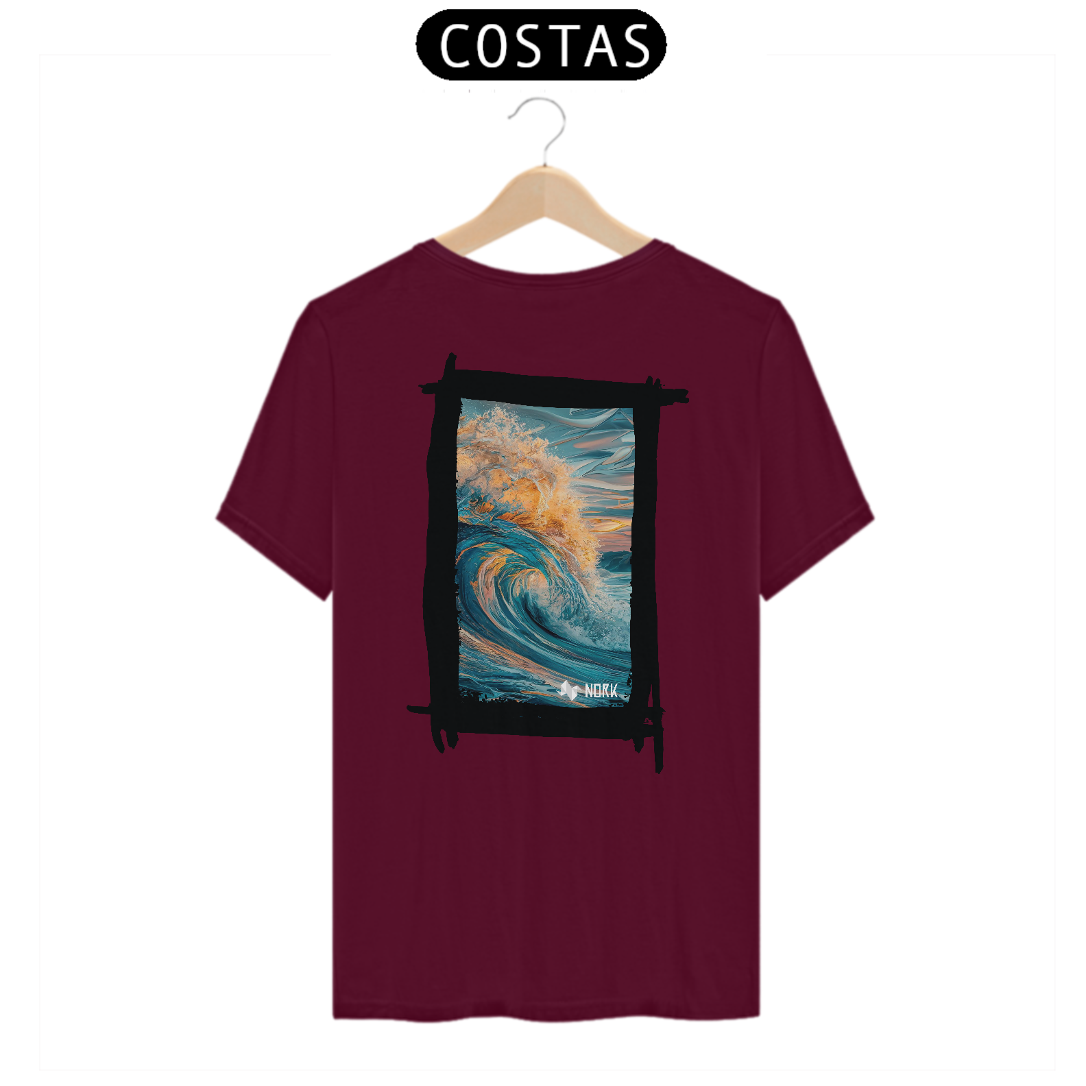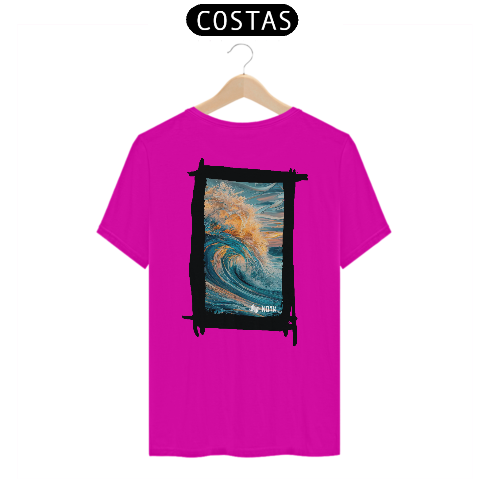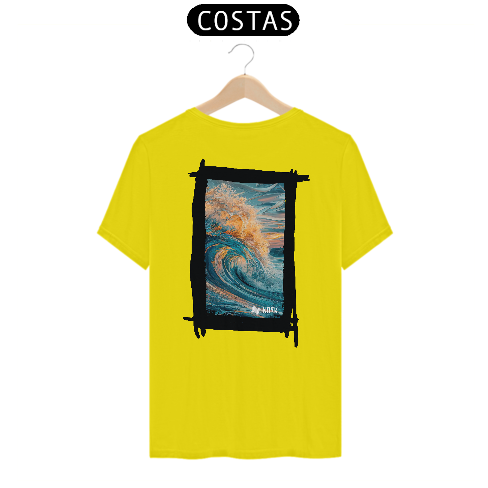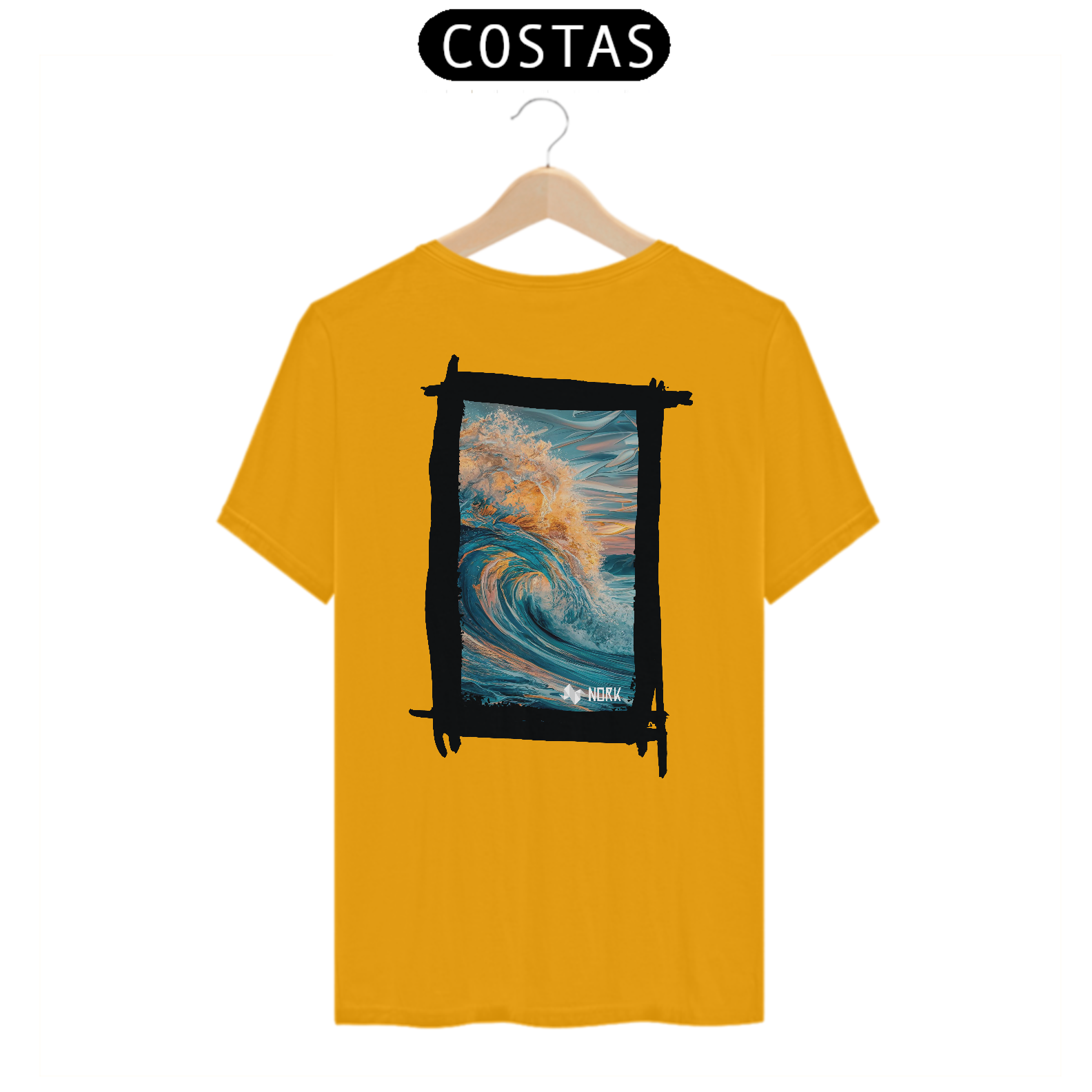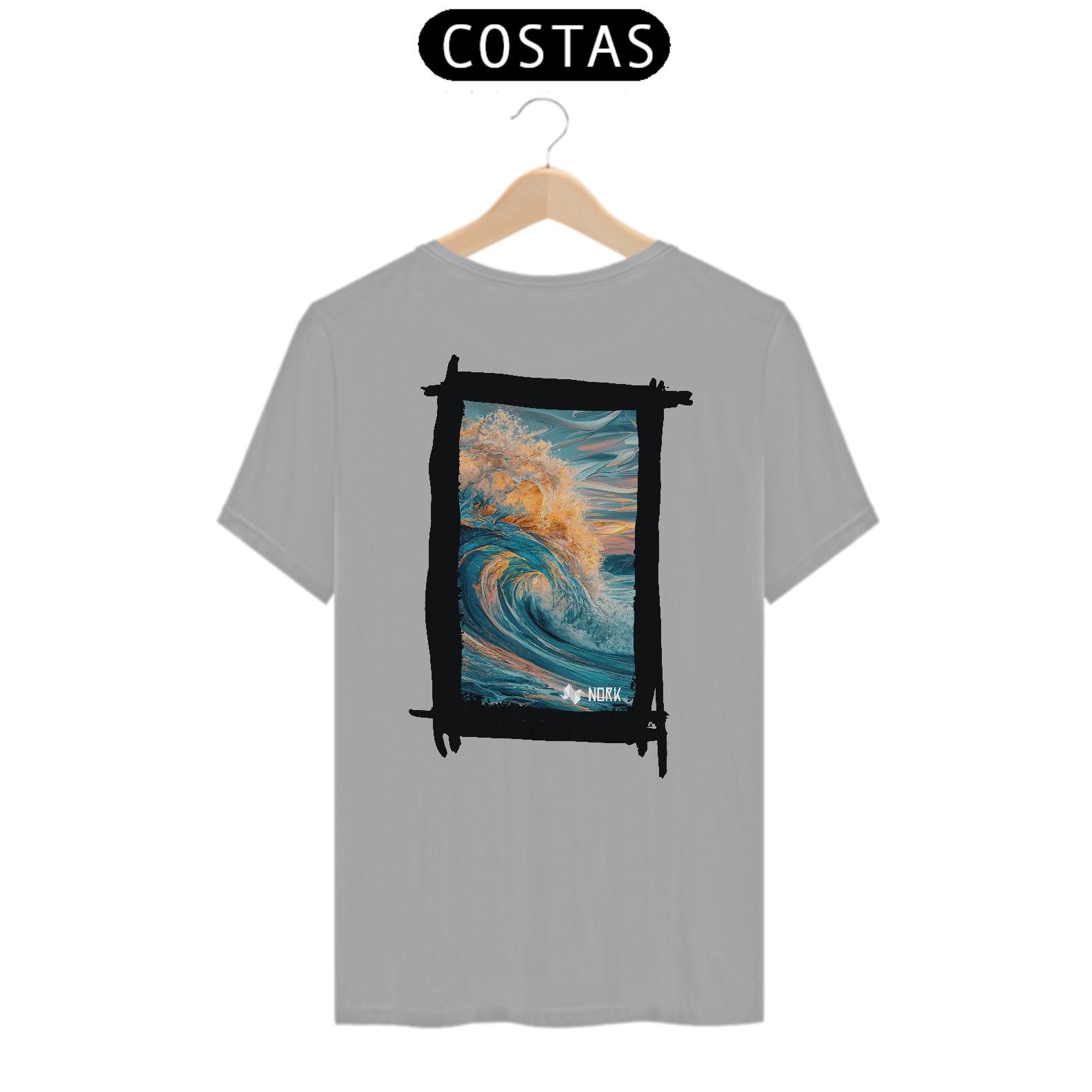 A camisa apresenta uma arte deslumbrante que captura o movimento poderoso e a energia de uma onda em seu auge. A composição exibe tons profundos de azul misturados a nuances quentes de laranja e dourado, simbolizando a luz do sol refletida na água. A riqueza de detalhes na espuma e no movimento dinâmico da onda cria uma sensação de fluidez e intensidade. O fundo apresenta suaves pinceladas que evocam o céu ao amanhecer ou ao entardecer, reforçando a conexão com a natureza e o oceano. O design é vibrante e impactante, perfeito para quem busca expressar liberdade e energia. O logo da Nork está discretamente posicionado na parte inferior, mantendo o equilíbrio visual da peça.