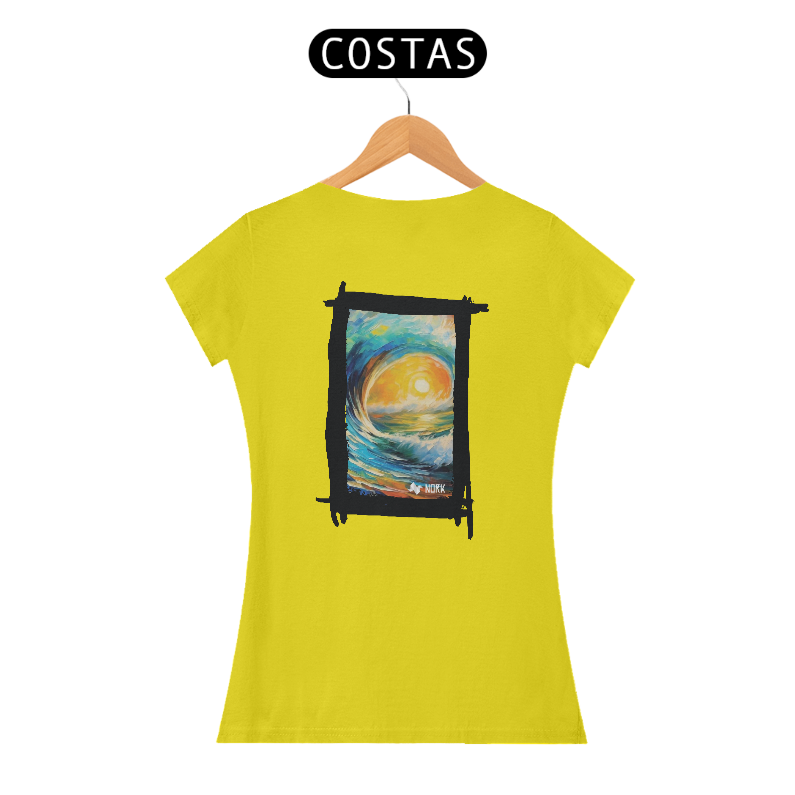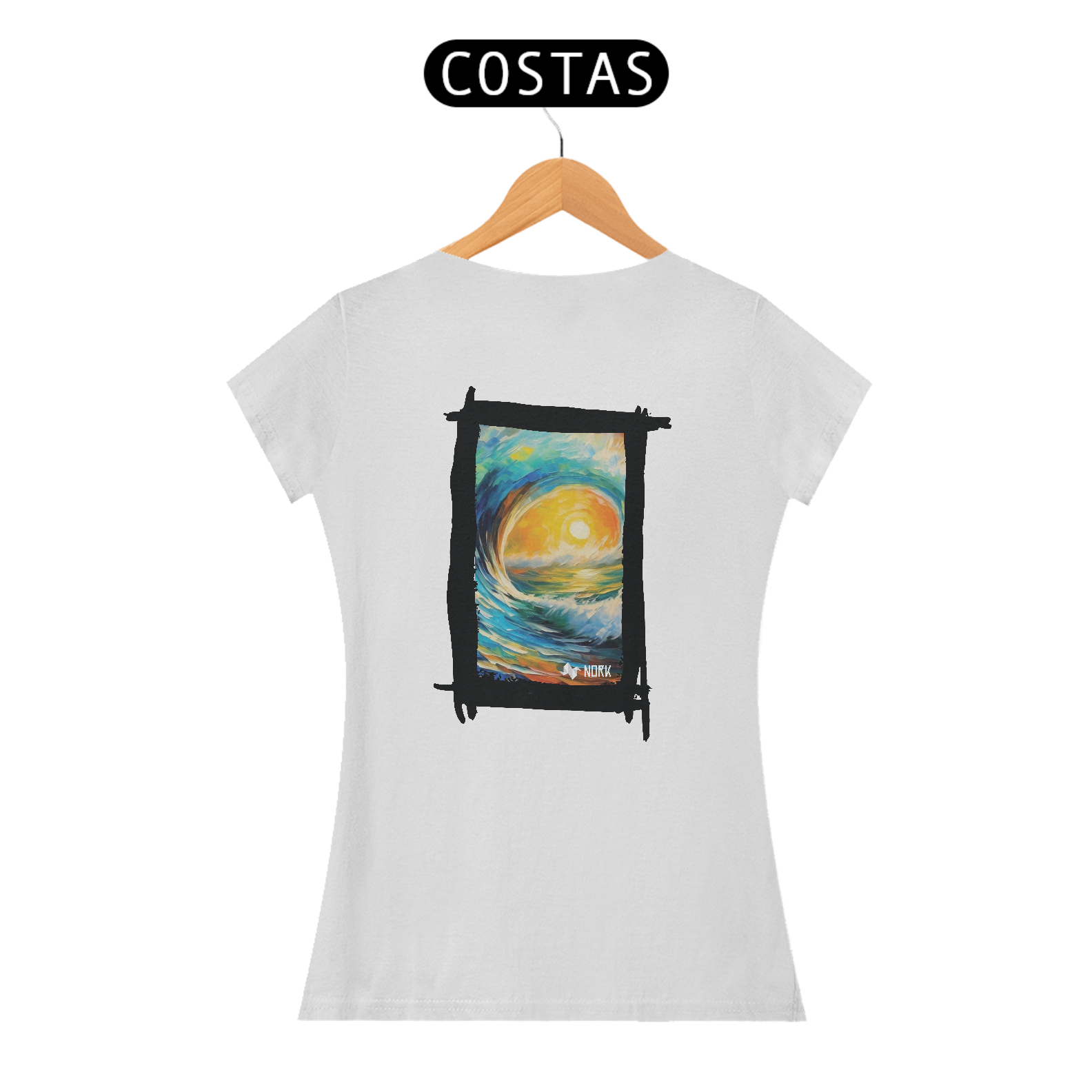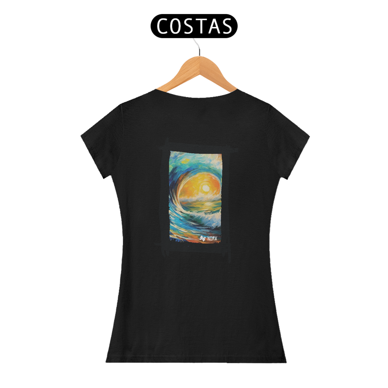 A camisa apresenta uma arte vibrante e impactante que captura a essência de um nascer ou pôr do sol refletido sobre uma onda majestosa, com traços estilizados que lembram pinceladas de tinta a óleo. As cores predominantes incluem tons quentes como amarelo e laranja no centro, representando o sol, contrastando com o azul profundo e verde das ondas e do céu, criando uma harmonia visual que transmite energia, movimento e serenidade. O estilo artístico evoca uma sensação de conexão com a natureza e o oceano, sendo ideal para quem busca transmitir liberdade e vitalidade. O logo da Nork aparece de forma discreta na parte inferior, reforçando a identidade da peça.