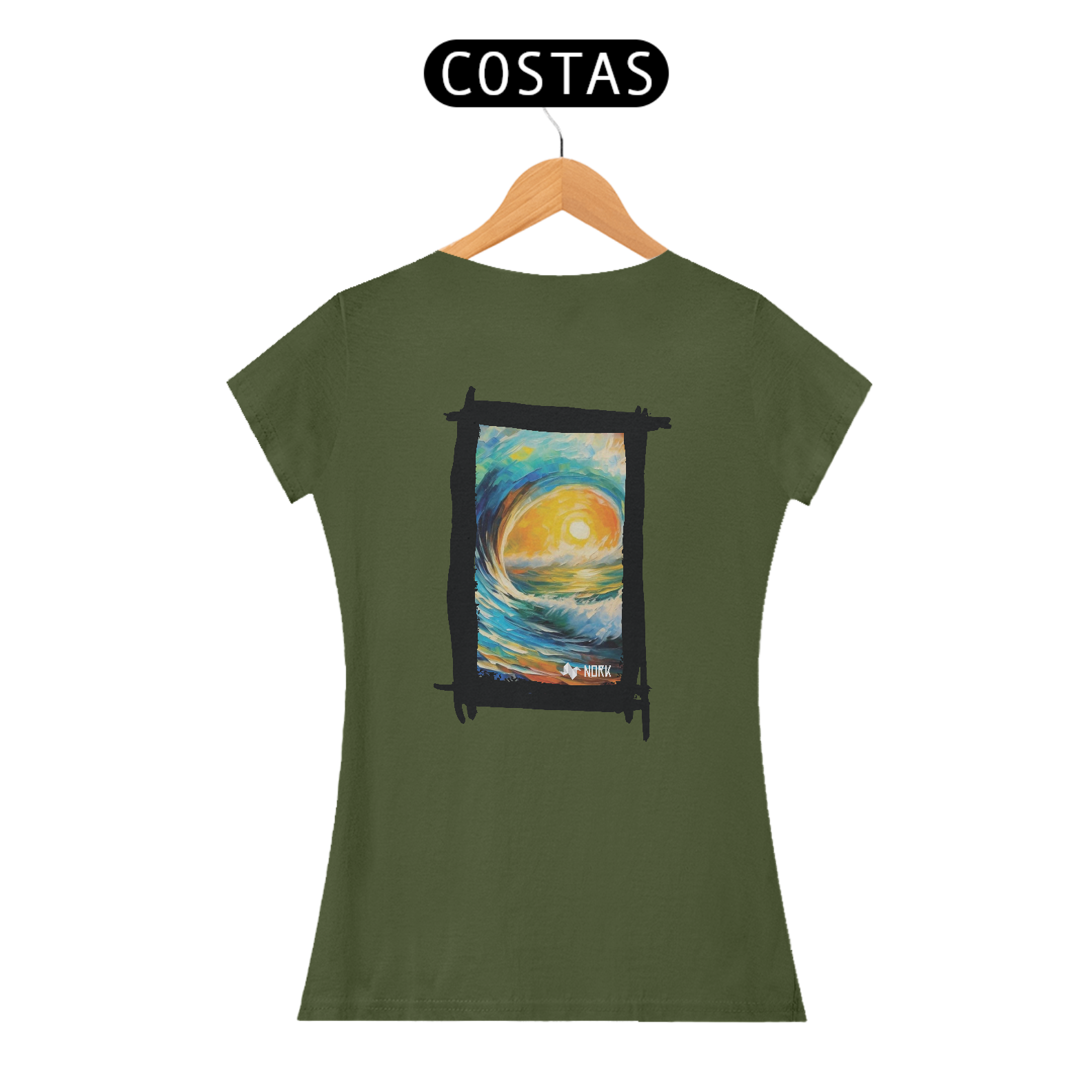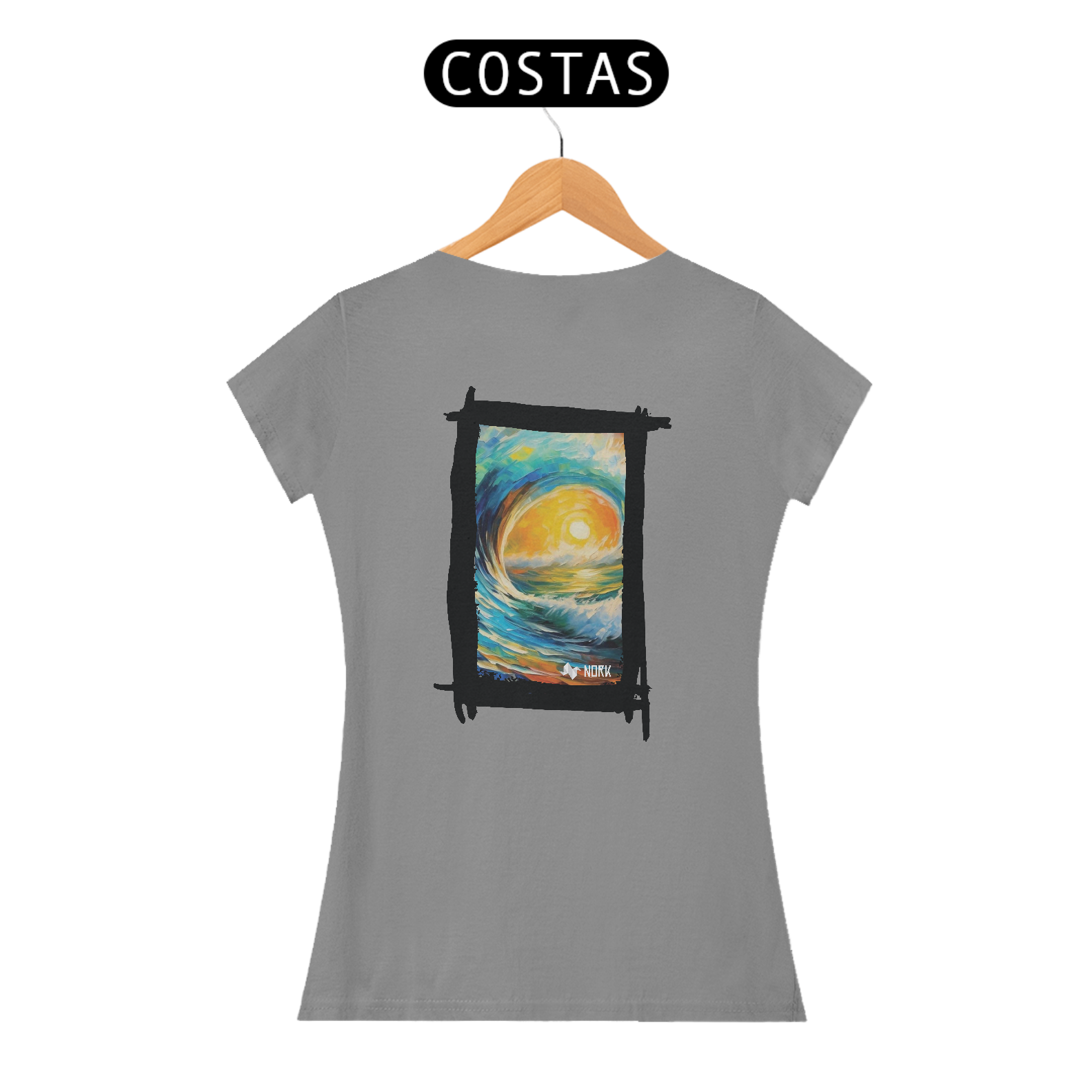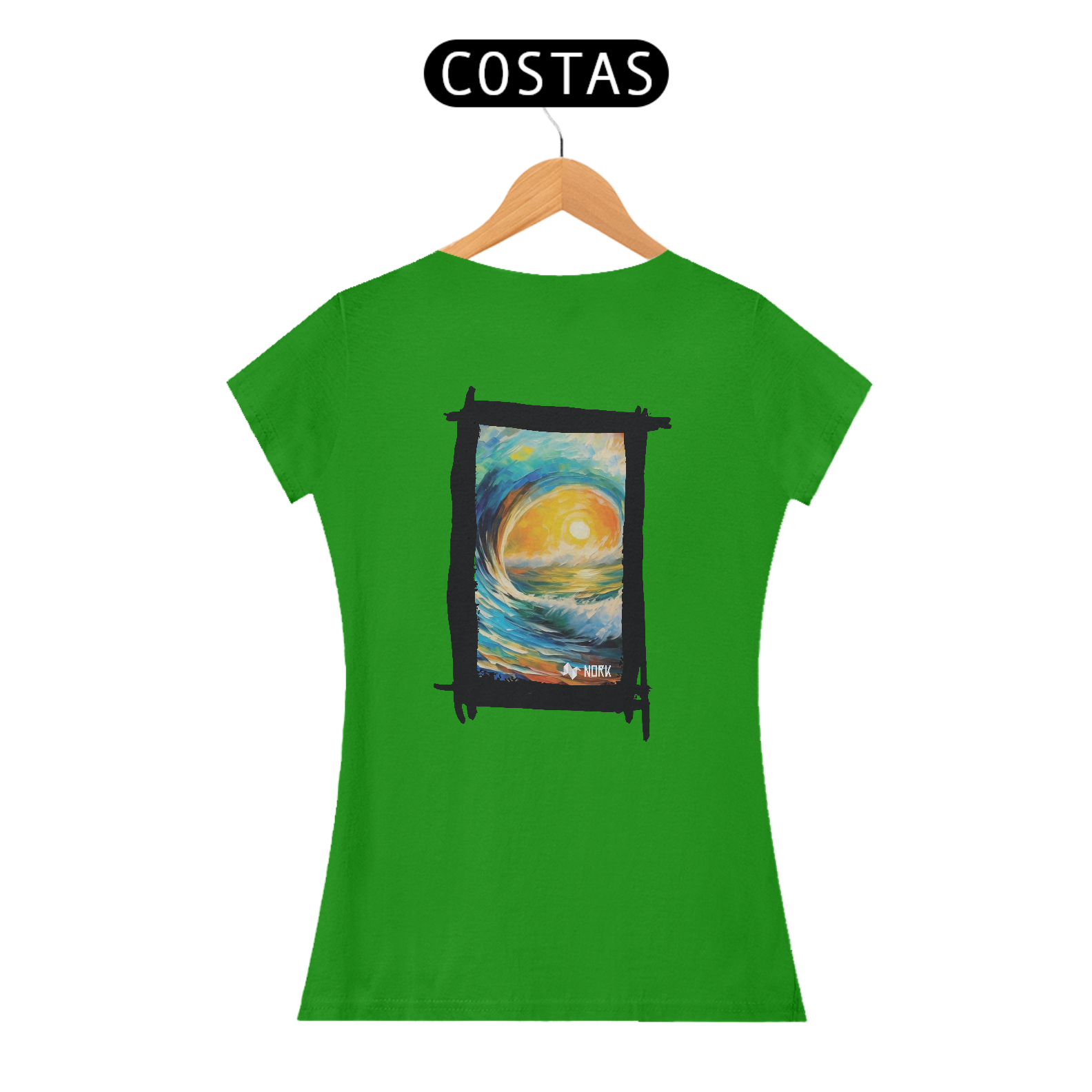 A camisa apresenta uma arte vibrante e impactante que captura a essência de um nascer ou pôr do sol refletido sobre uma onda majestosa, com traços estilizados que lembram pinceladas de tinta a óleo. As cores predominantes incluem tons quentes como amarelo e laranja no centro, representando o sol, contrastando com o azul profundo e verde das ondas e do céu, criando uma harmonia visual que transmite energia, movimento e serenidade. O estilo artístico evoca uma sensação de conexão com a natureza e o oceano, sendo ideal para quem busca transmitir liberdade e vitalidade. O logo da Nork aparece de forma discreta na parte inferior, reforçando a identidade da peça.