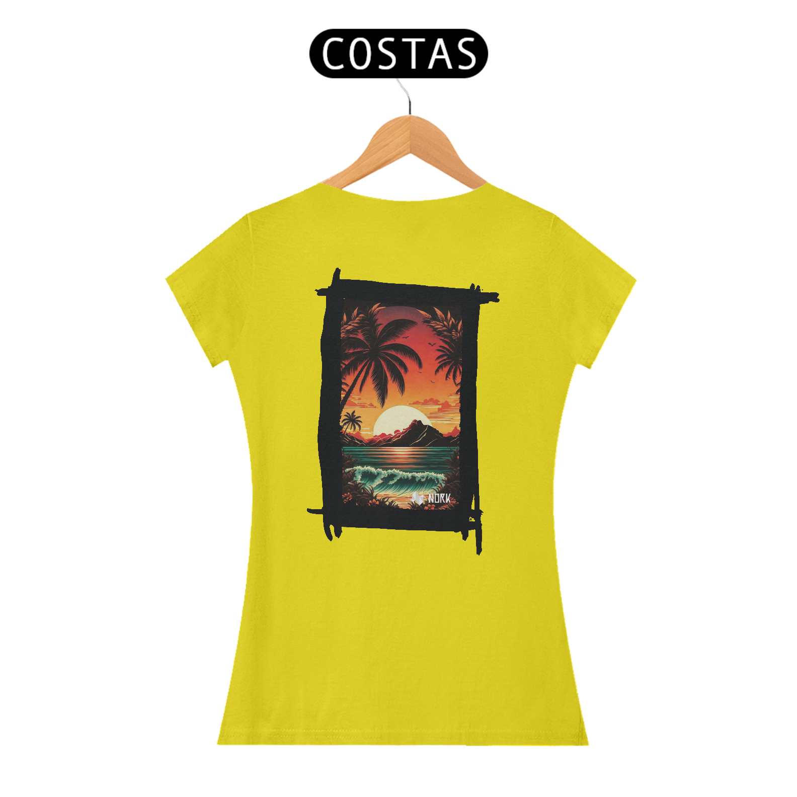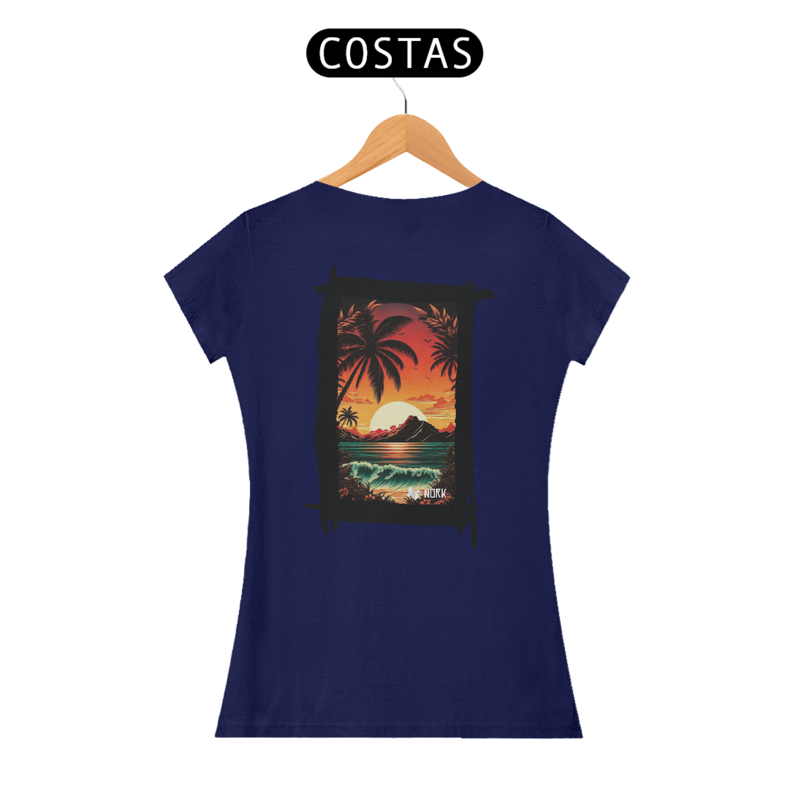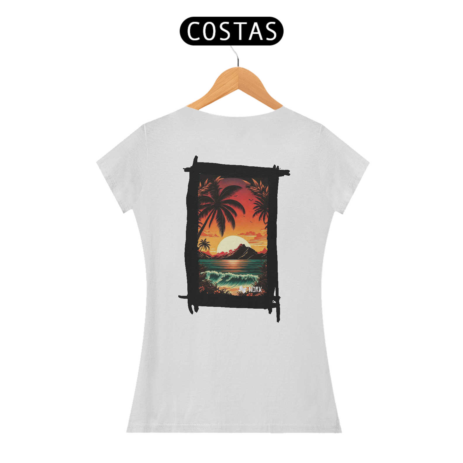 A camisa apresenta uma arte deslumbrante que captura a essência de um pôr do sol tropical, com cores intensas e vibrantes que vão do laranja profundo ao vermelho ardente, criando um contraste marcante com o azul esverdeado do mar. A composição é emoldurada por palmeiras estilizadas em silhueta preta, que adicionam profundidade e uma atmosfera relaxante à cena. Ao fundo, uma montanha escura contrasta com o brilho do sol poente refletido na água, enquanto ondas suaves e detalhadas trazem movimento e vivacidade ao design. O visual exala tranquilidade e uma conexão com a natureza exuberante. O logo da Nork aparece discretamente na parte inferior, preservando a exclusividade da peça.