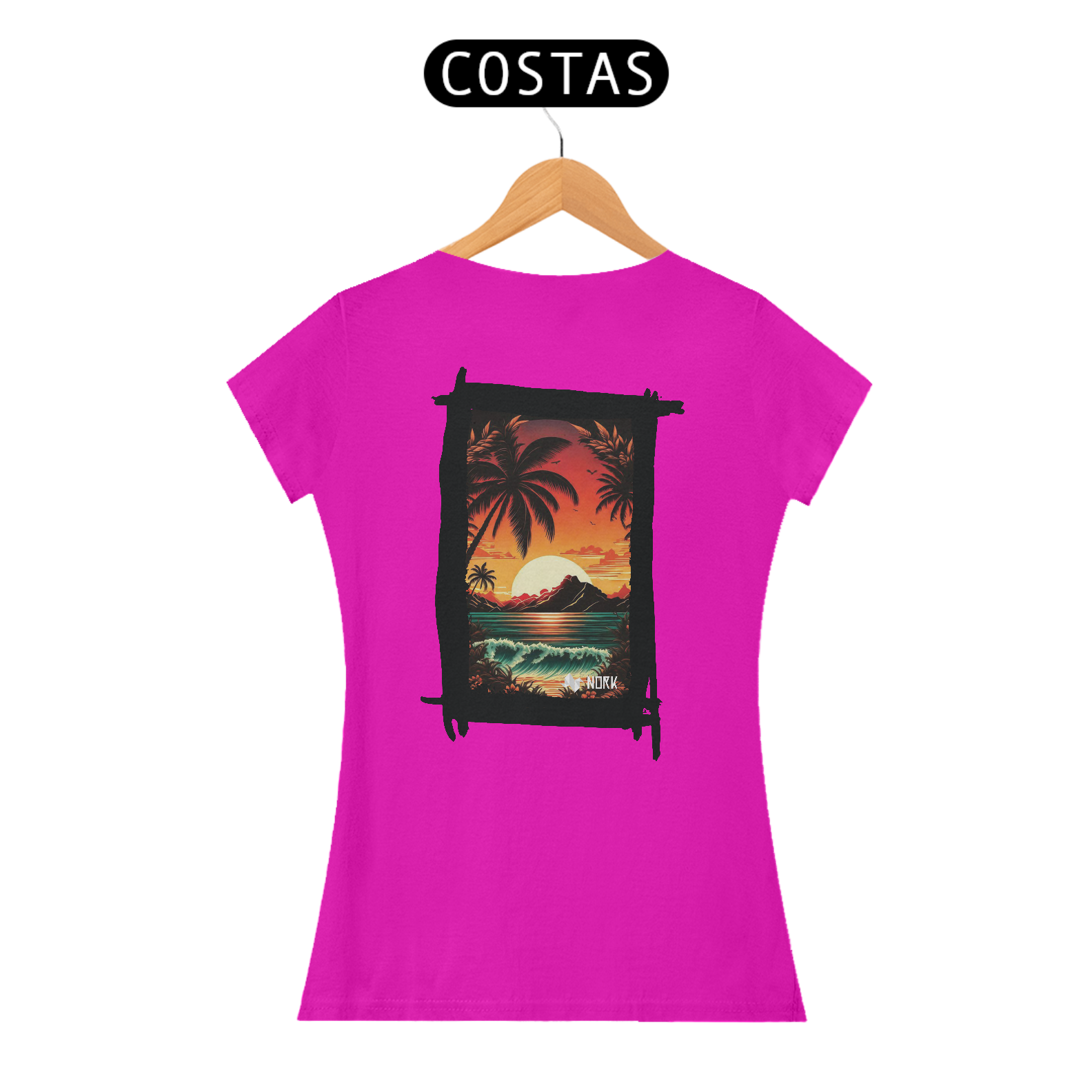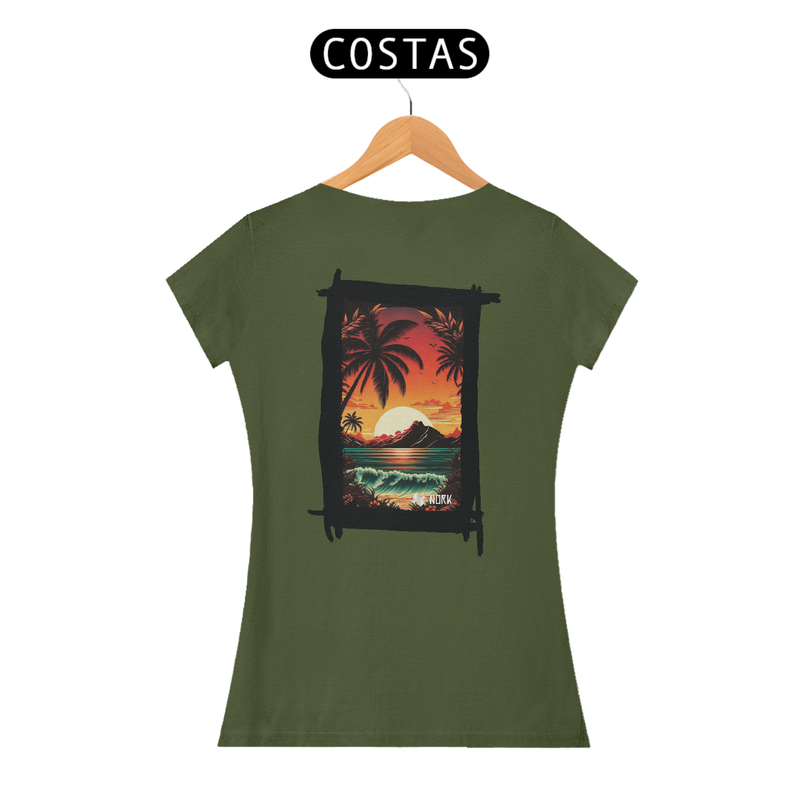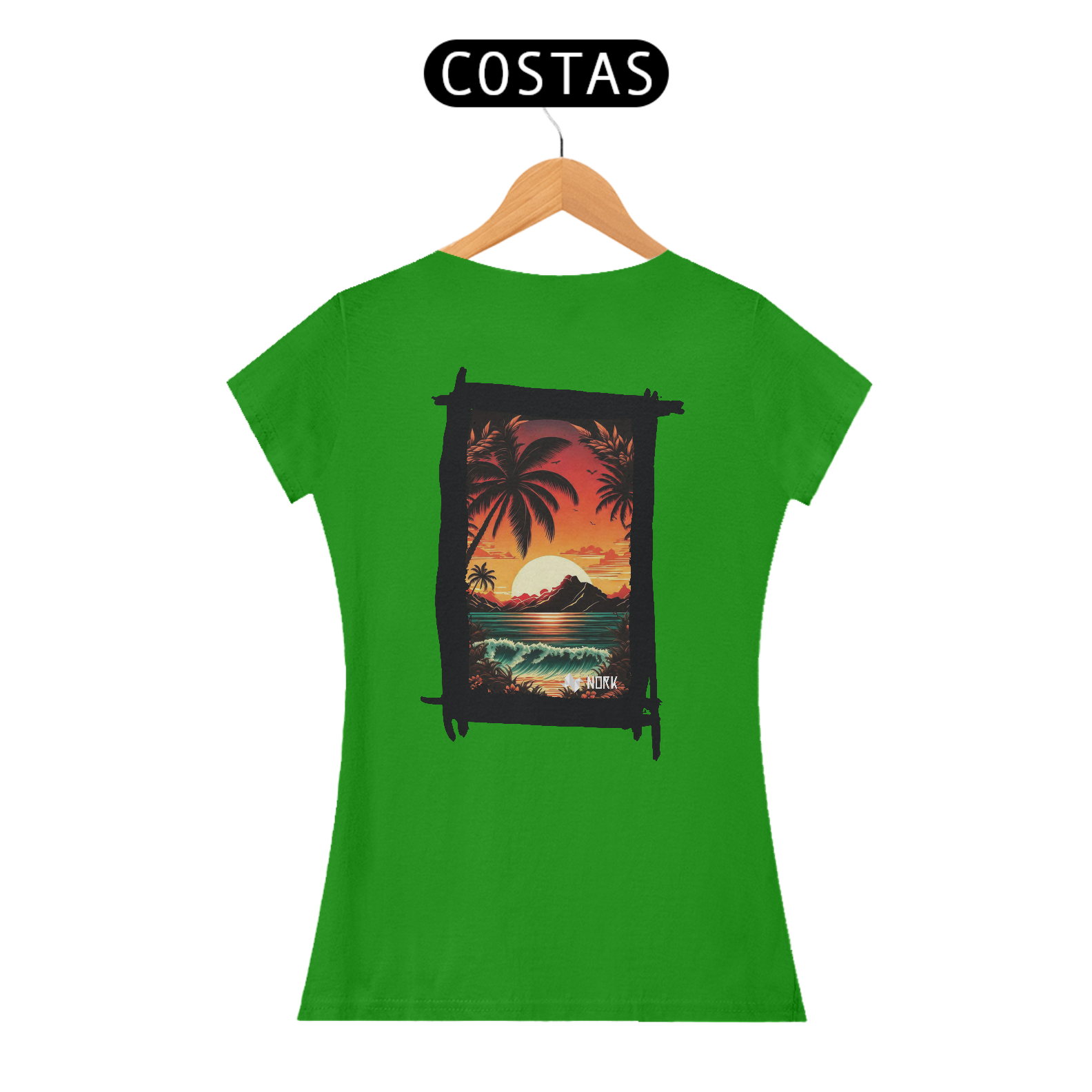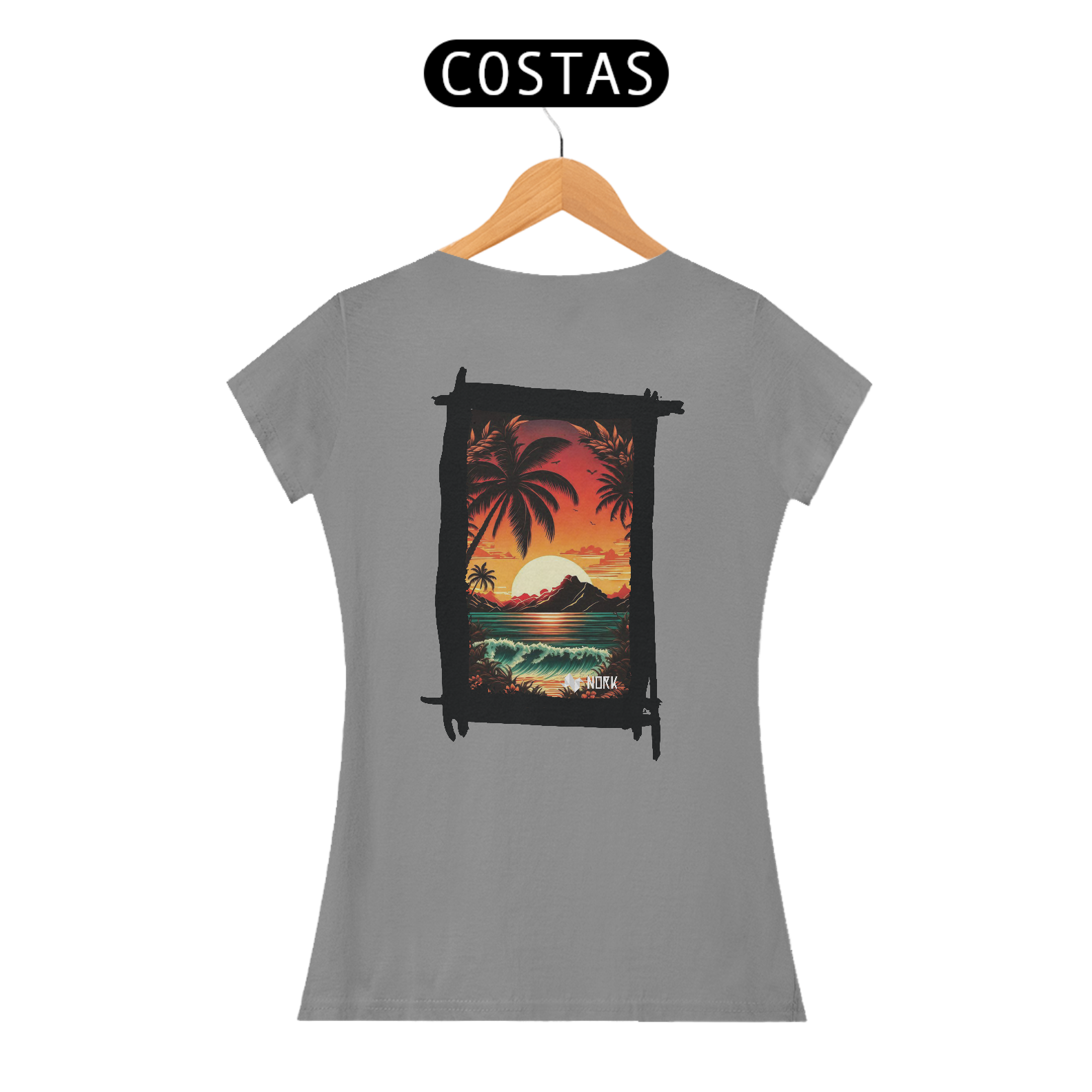 A camisa apresenta uma arte deslumbrante que captura a essência de um pôr do sol tropical, com cores intensas e vibrantes que vão do laranja profundo ao vermelho ardente, criando um contraste marcante com o azul esverdeado do mar. A composição é emoldurada por palmeiras estilizadas em silhueta preta, que adicionam profundidade e uma atmosfera relaxante à cena. Ao fundo, uma montanha escura contrasta com o brilho do sol poente refletido na água, enquanto ondas suaves e detalhadas trazem movimento e vivacidade ao design. O visual exala tranquilidade e uma conexão com a natureza exuberante. O logo da Nork aparece discretamente na parte inferior, preservando a exclusividade da peça.