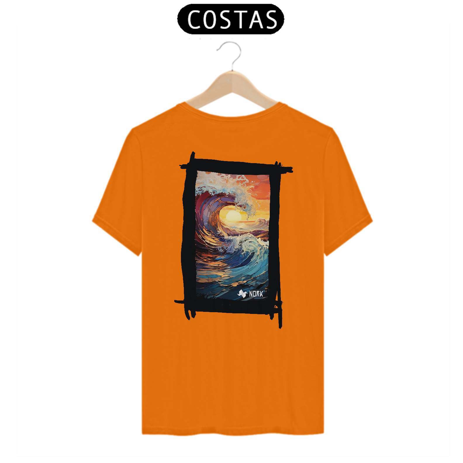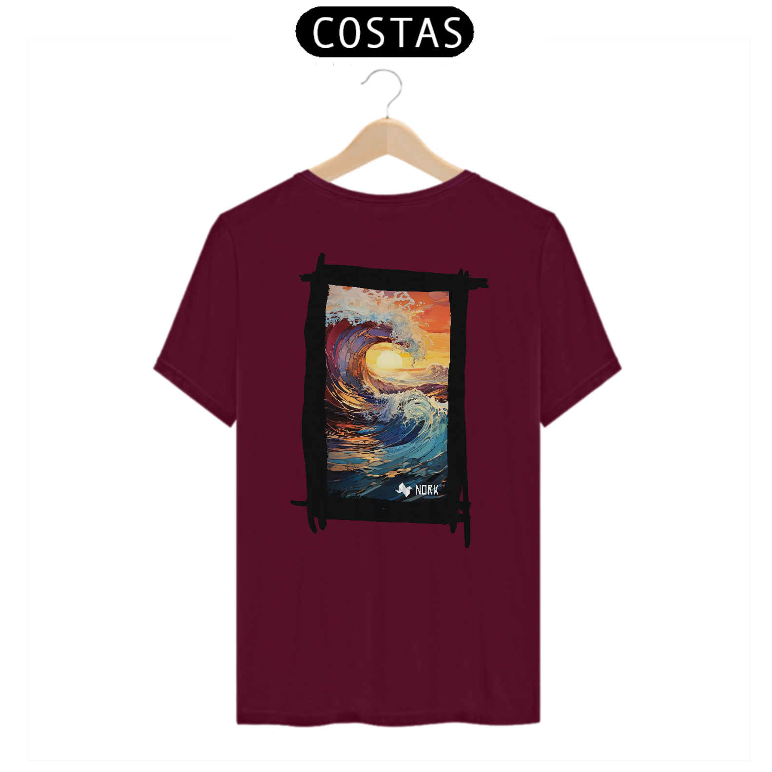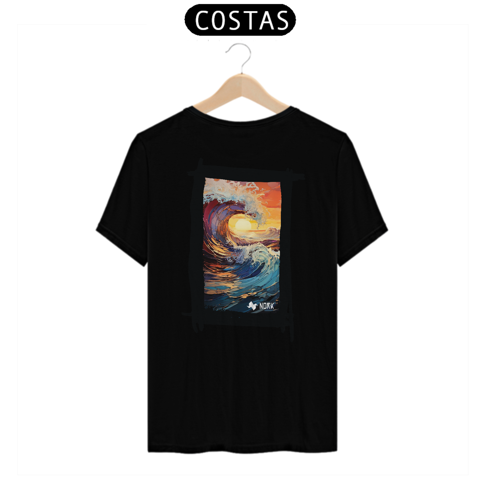 A camisa apresenta uma arte deslumbrante que combina o dinamismo de uma onda em movimento com as cores intensas de um pôr do sol tropical. A composição destaca o movimento fluido e poderoso da água em tons de azul profundo e roxo, contrastando com o laranja vibrante e o dourado do céu e do sol no horizonte. A espuma branca que se forma no topo da onda adiciona textura e vivacidade ao design, criando uma sensação de energia e renovação. O estilo artístico com pinceladas detalhadas e formas fluidas transmite uma conexão profunda com a natureza, ideal para quem busca representar liberdade e força. O logo da Nork está posicionado discretamente na parte inferior, complementando o design sem tirar o protagonismo da arte.