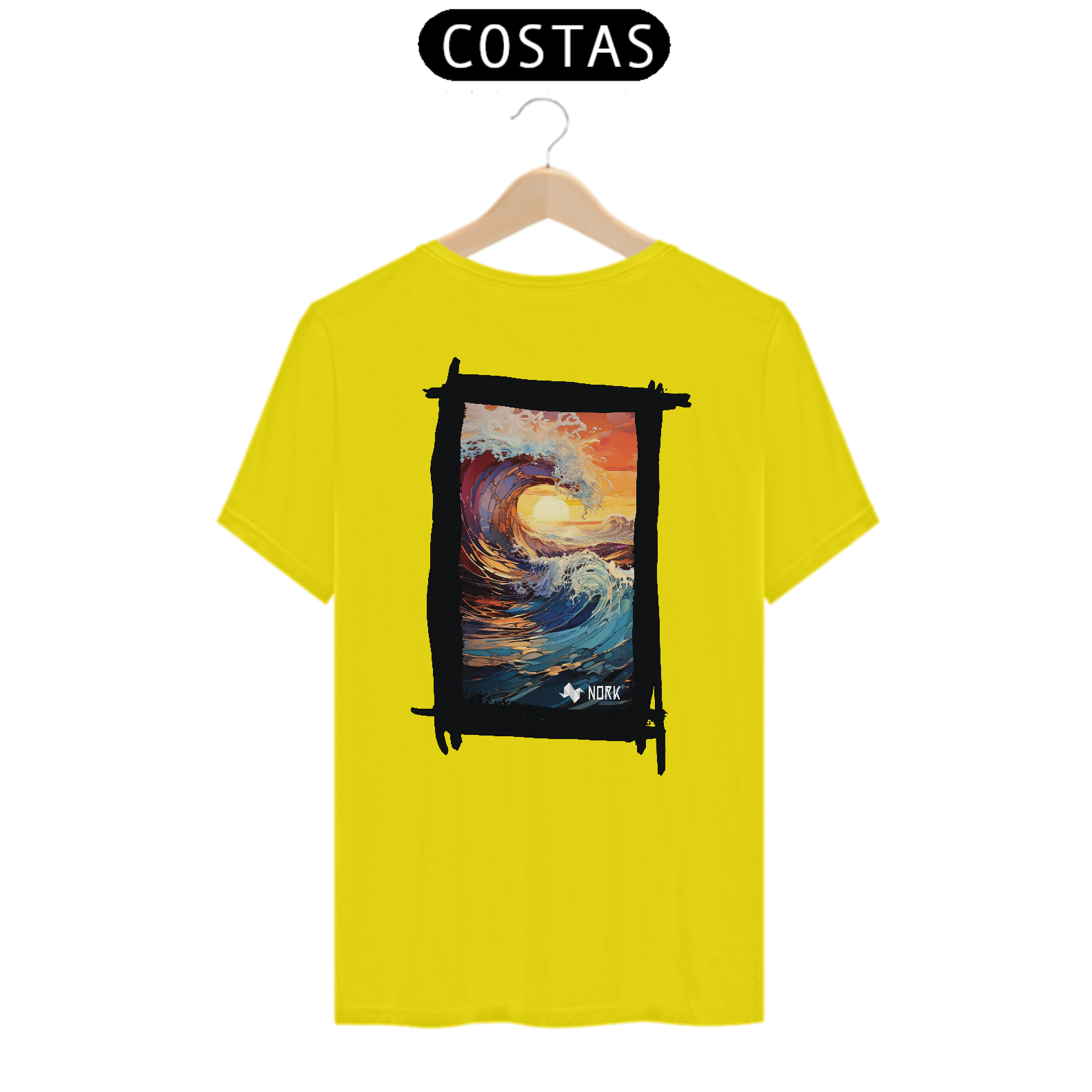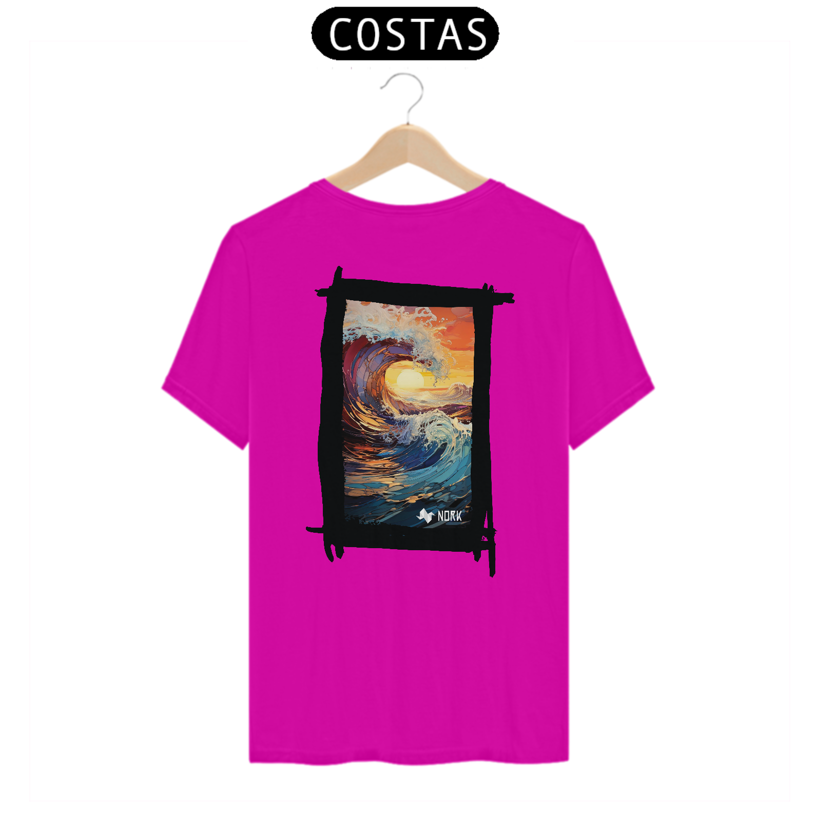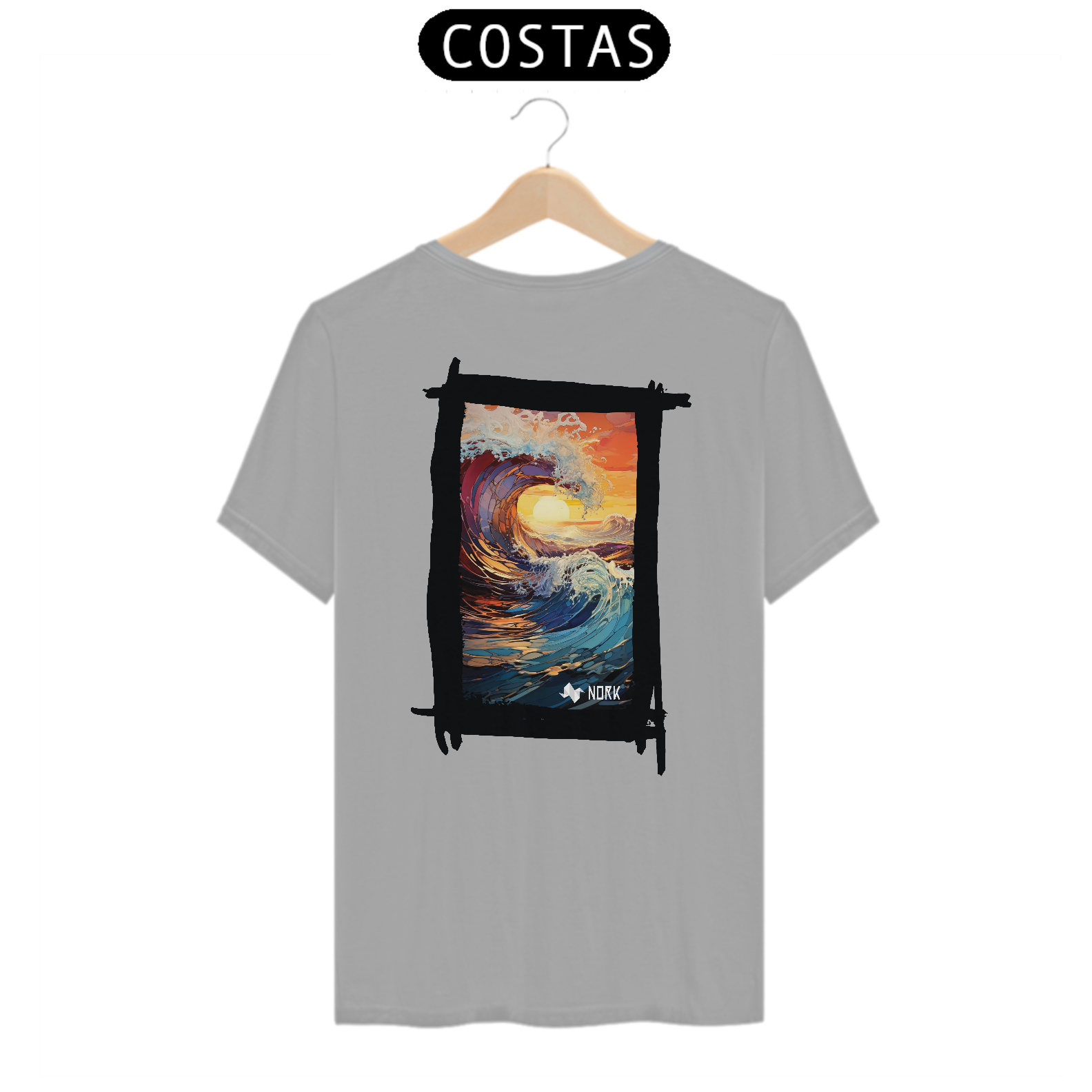 A camisa apresenta uma arte deslumbrante que combina o dinamismo de uma onda em movimento com as cores intensas de um pôr do sol tropical. A composição destaca o movimento fluido e poderoso da água em tons de azul profundo e roxo, contrastando com o laranja vibrante e o dourado do céu e do sol no horizonte. A espuma branca que se forma no topo da onda adiciona textura e vivacidade ao design, criando uma sensação de energia e renovação. O estilo artístico com pinceladas detalhadas e formas fluidas transmite uma conexão profunda com a natureza, ideal para quem busca representar liberdade e força. O logo da Nork está posicionado discretamente na parte inferior, complementando o design sem tirar o protagonismo da arte.