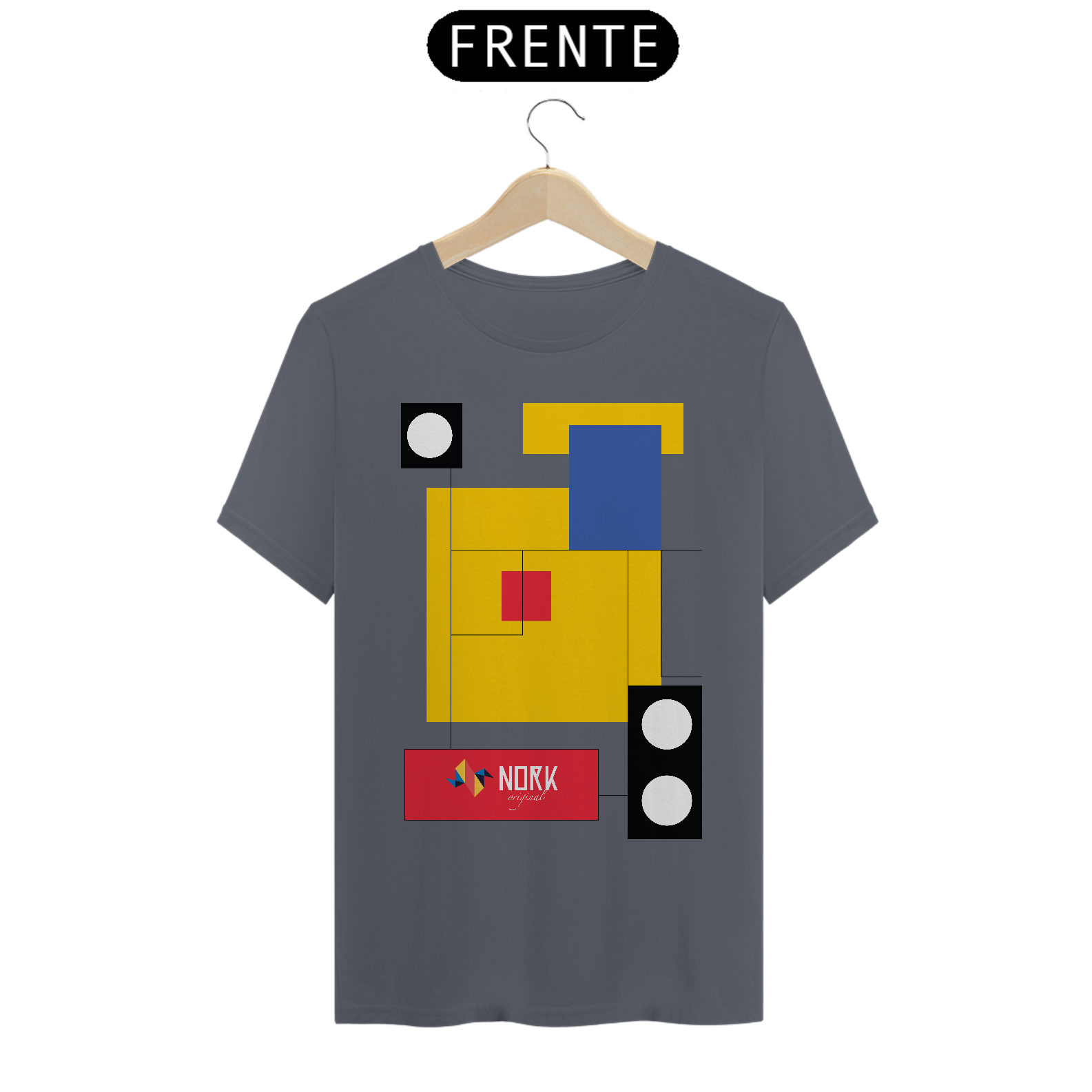Esta camisa marcante da Coleção Nork Bauhaus apresenta um arranjo geométrico onde blocos de cor em amarelo, azul, vermelho e preto se conectam por finas linhas retas, criando um visual limpo e arrojado. As sobreposições retangulares, contrastadas por círculos em preto e branco, remetem à busca pelo equilíbrio entre forma e função, típica do movimento Bauhaus. O logo Nork Original em um retângulo vermelho traz destaque e identidade, reforçando o aspecto vanguardista da composição.