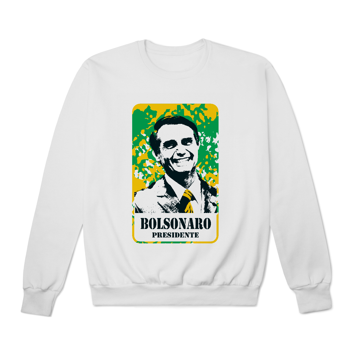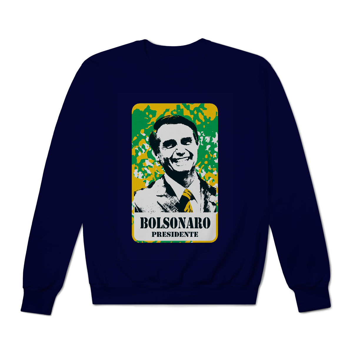 Uma explosão de cor e ideologia. A estampa “Cartaz Patriota” é uma releitura gráfica no estilo pop político, onde a imagem de Bolsonaro aparece com traços marcados e alto contraste, sobre um fundo de camuflagem que mistura verde, amarelo e branco, remetendo diretamente à estética nacionalista brasileira.