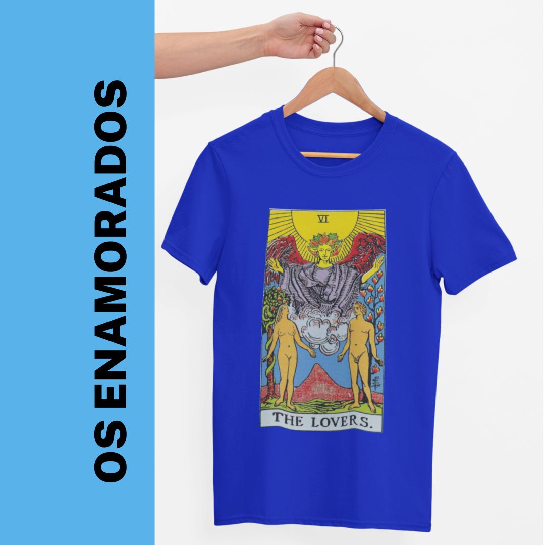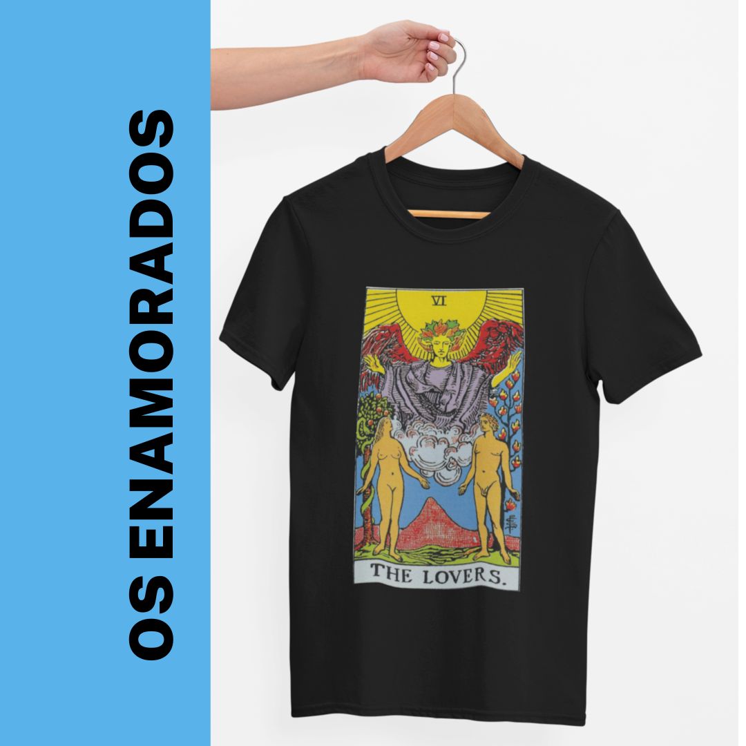 Frente: A imagem encantadora da carta "Os Enamorados" do tarot adorna a frente desta camiseta exclusiva. Com detalhes artisticamente elaborados, a carta mostra um casal em uma cena serena e harmoniosa, simbolizando a união, o amor e a escolha. Entre eles, um anjo abençoa a união, representando a proteção e a guia divina. Ao fundo, uma paisagem bucólica sugere um paraíso de equilíbrio e felicidade.
