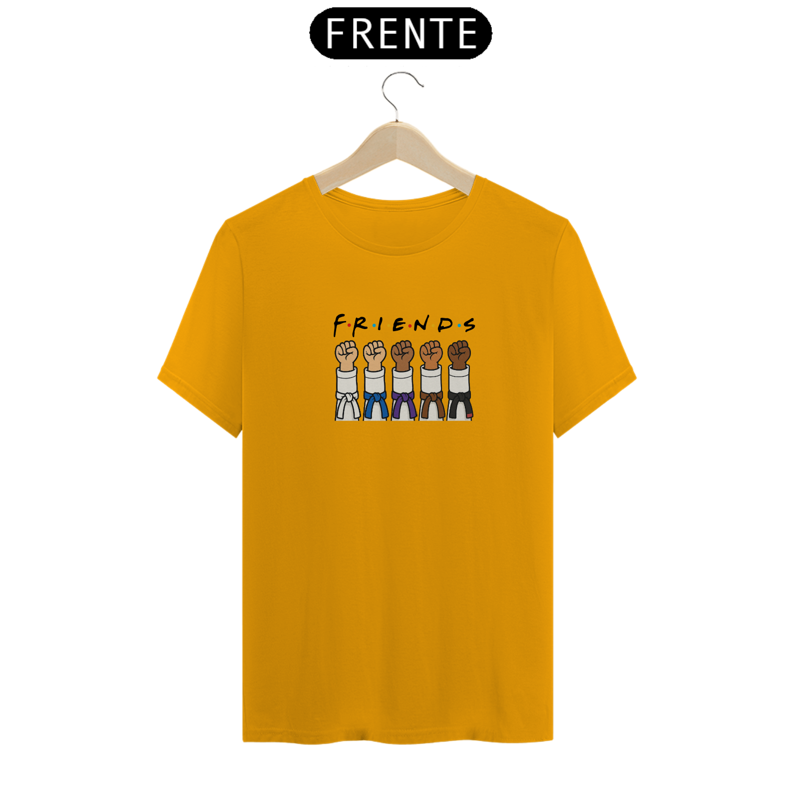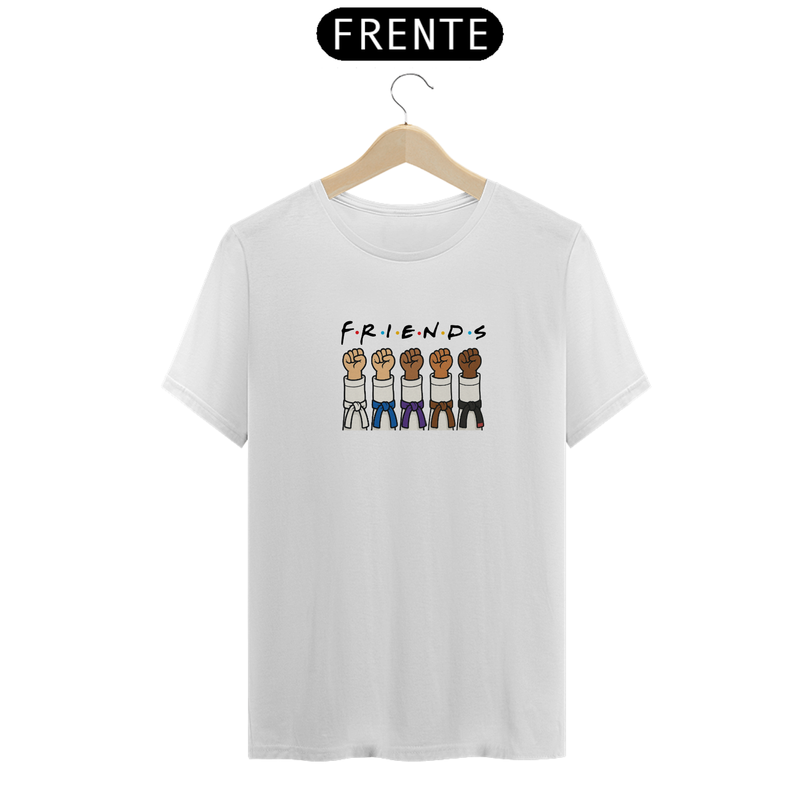 Camiseta Friends celebra o espírito de união no Jiu-Jitsu. Com um visual divertido inspirado na clássica estética da série Friends, ele traz cinco braços erguidos, cada um com uma faixa diferente — representando evolução, respeito e companheirismo dentro da arte suave.