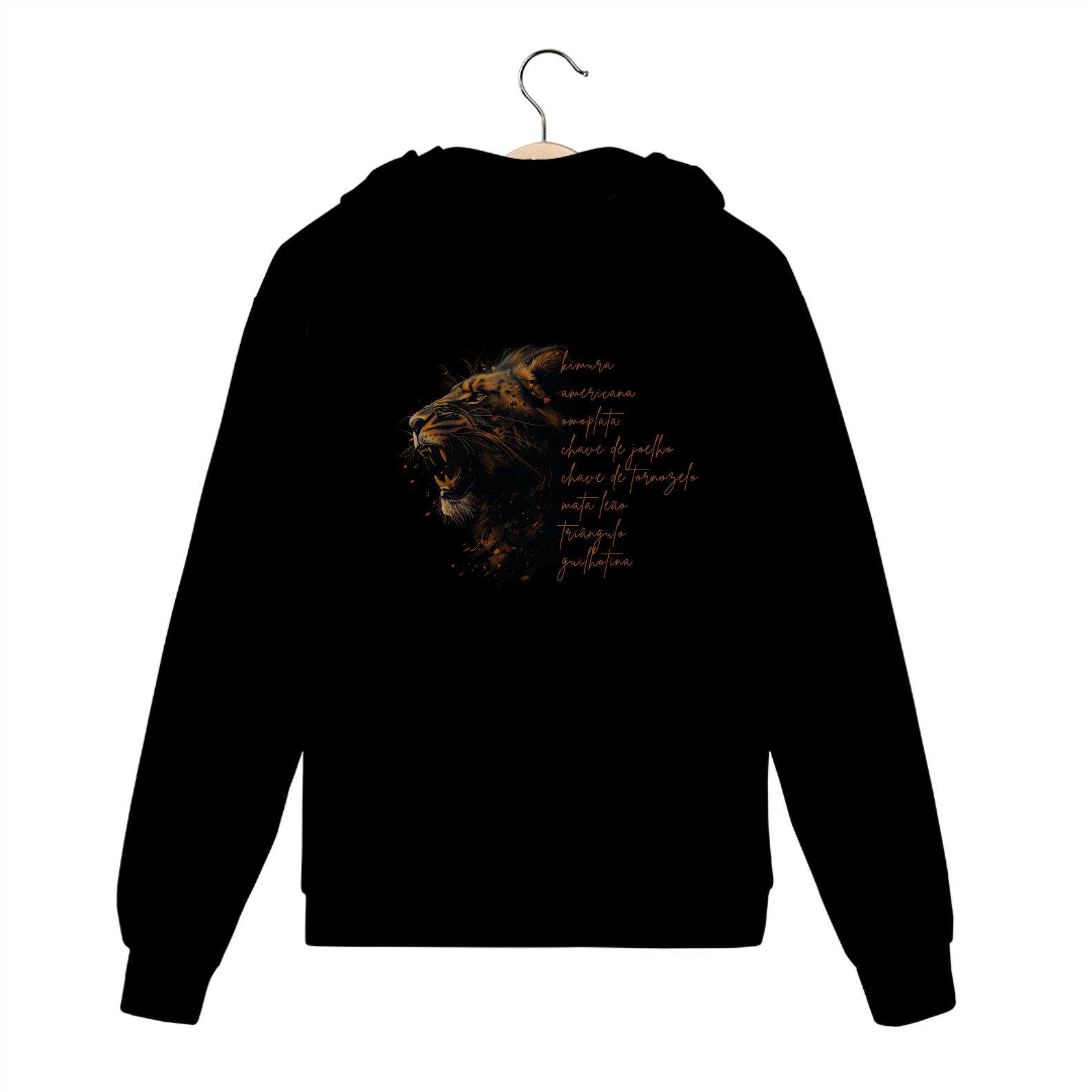 O moletom Garra e Técnica traduz o espírito do lutador que domina o caos com estratégia. A estampa realista de um leão rugindo representa a força bruta canalizada com inteligência — e ao lado, finalizações clássicas do Jiu-Jitsu marcam presença como um mantra do combate técnico.