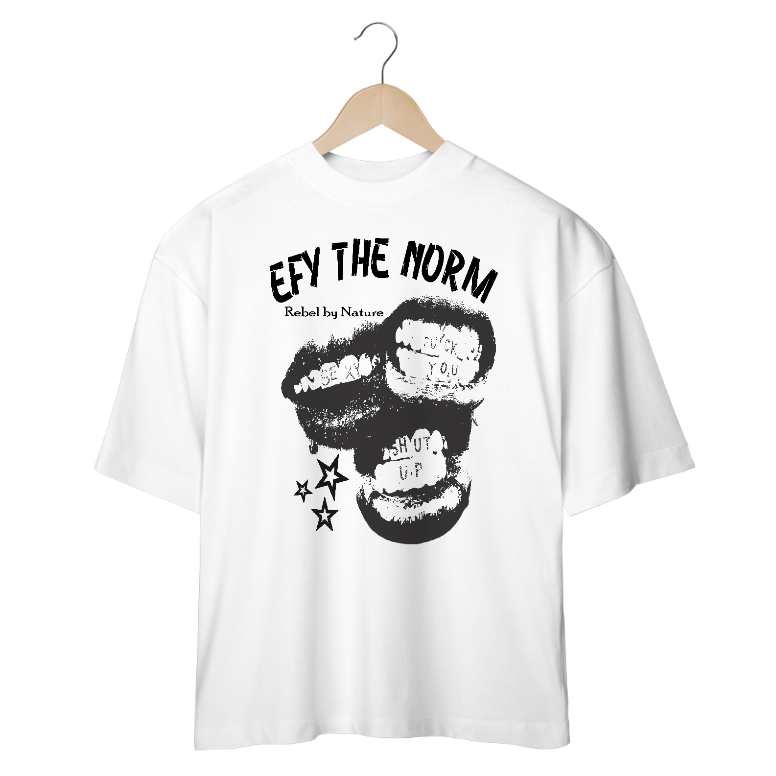 Camiseta oversized Branca Y2K Efy The Norm, em preto e branco com desing de bocas e pequenas estrelas