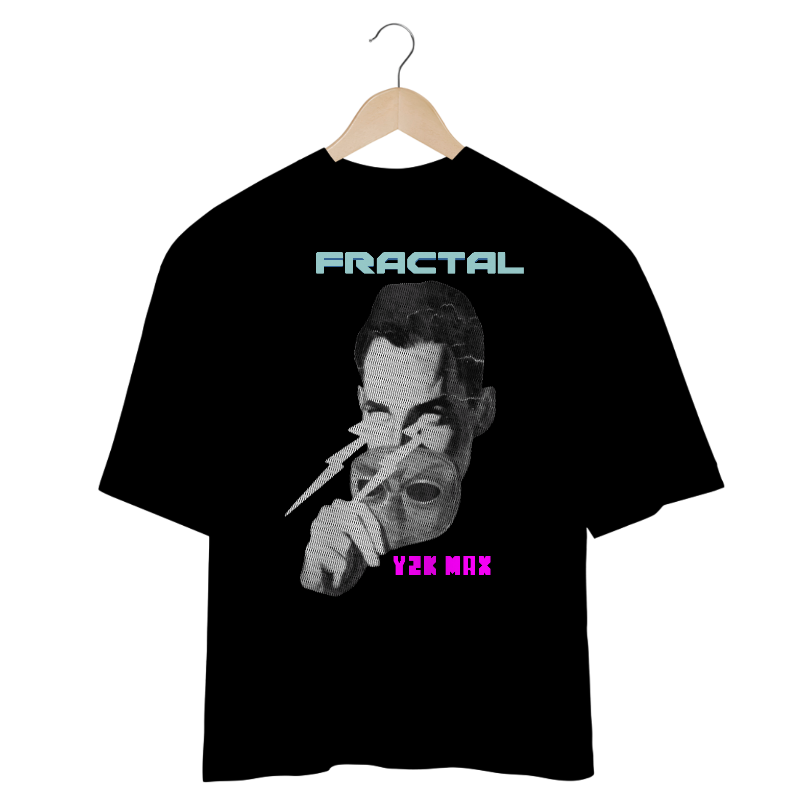 Camiseta oversized Preta estilo Y2K, com desing surrealista com a frase: FRACTAL Y2K MAX