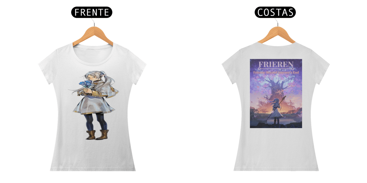 Em resumo, a camisa feminina inspirada em *Frieren: Beyond Journey's End* seria uma peça que une estilo e conforto, capturando a essência da personagem e o visual encantador do anime.