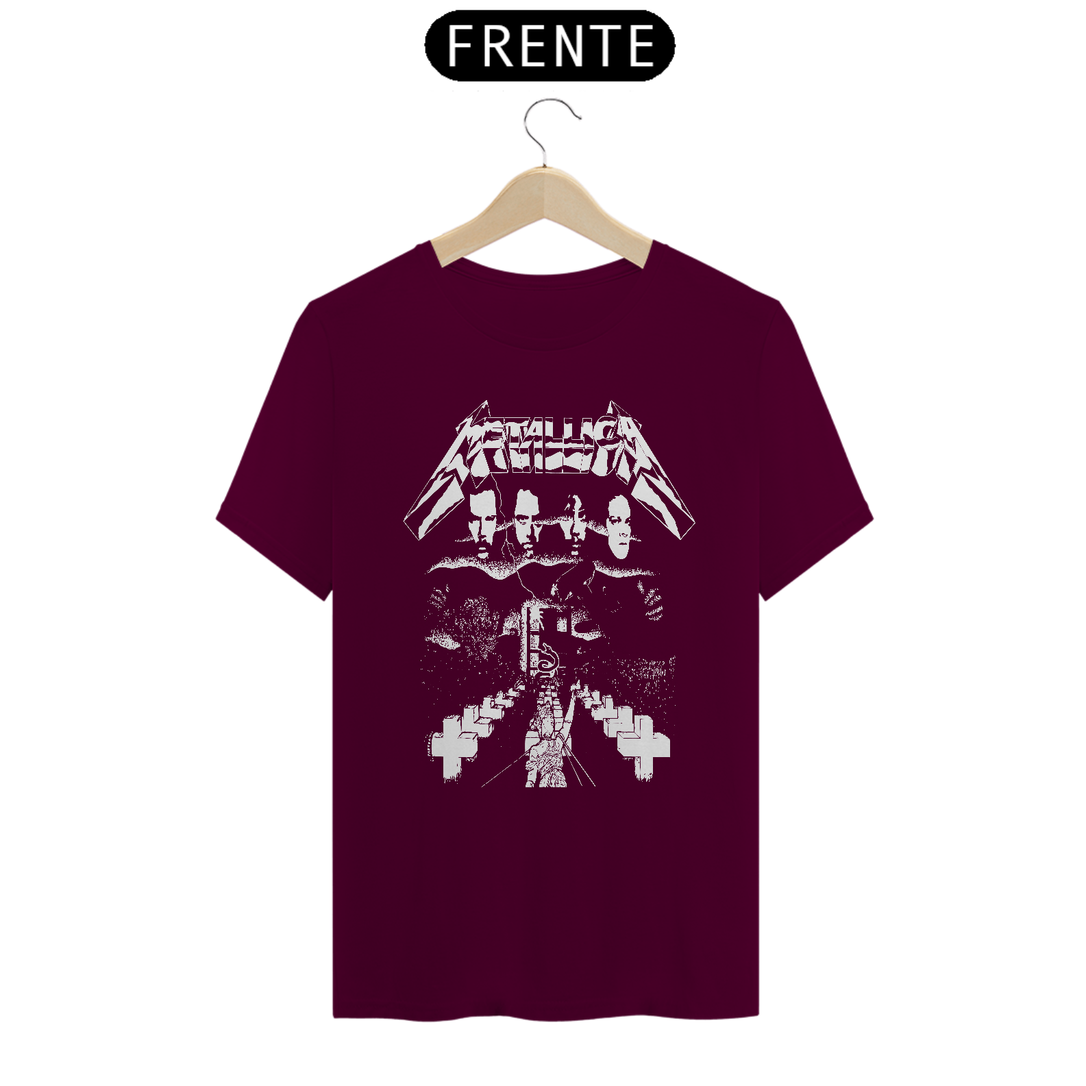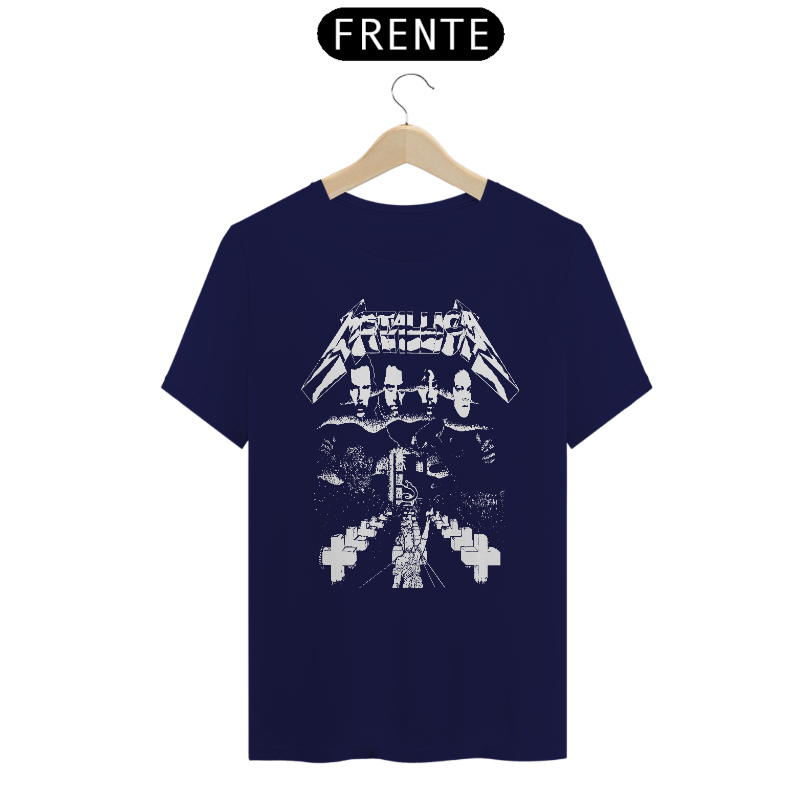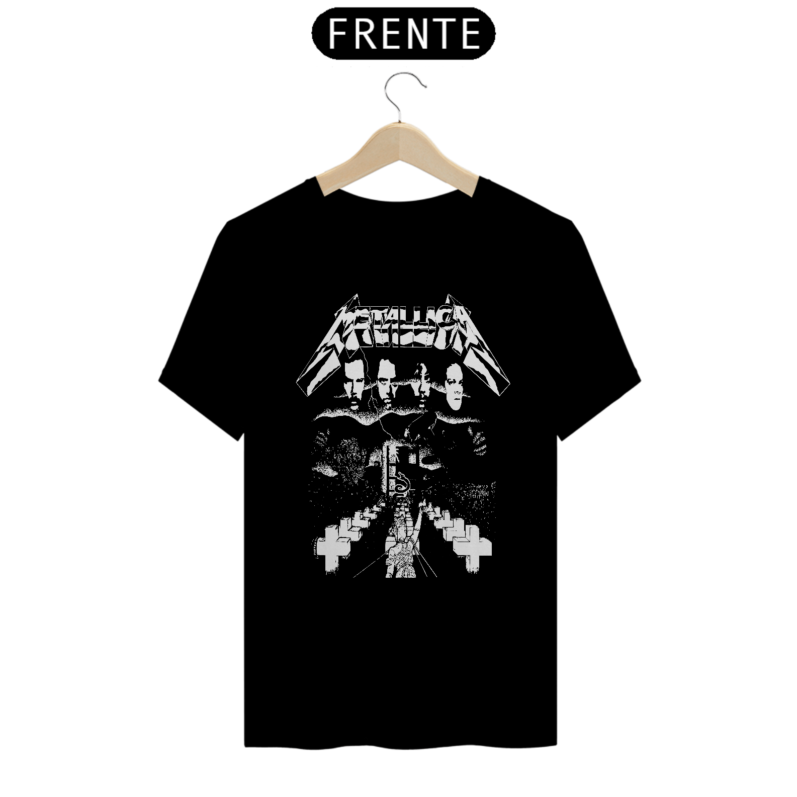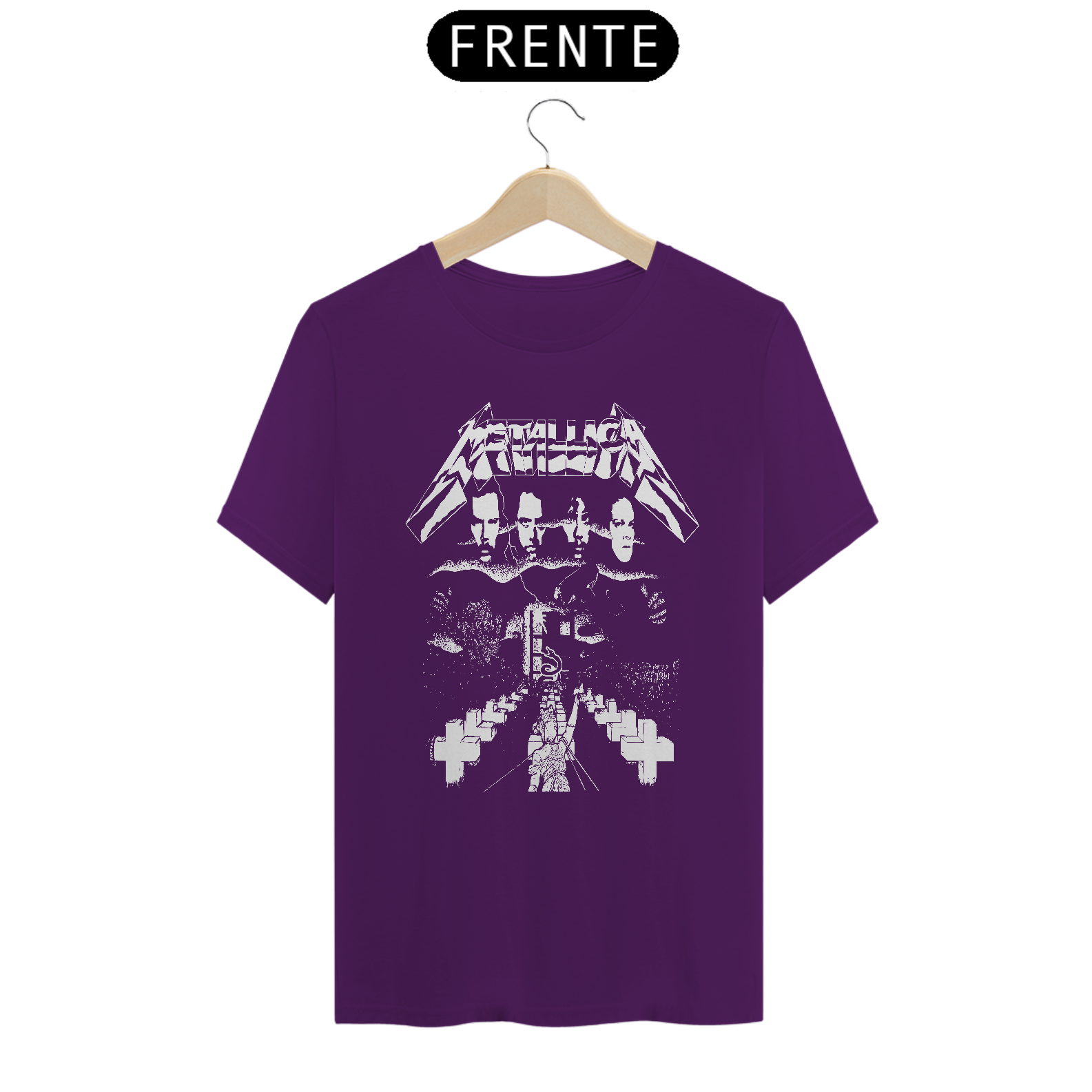 Esta camiseta destaca uma estampa inspirada na banda Metallica, ideal para os fãs de heavy metal. Fabricada com 100% de algodão e meia malha cardada, proporciona conforto e maciez. A costura simples e gola em ribana garantem um acabamento clássico. Com 145g de peso e fio 24.1, é uma peça leve e respirável, perfeita para o uso diário. A técnica de impressão utilizada é o Silk Digital HD, garantindo uma reprodução vívida e detalhada da estampa.