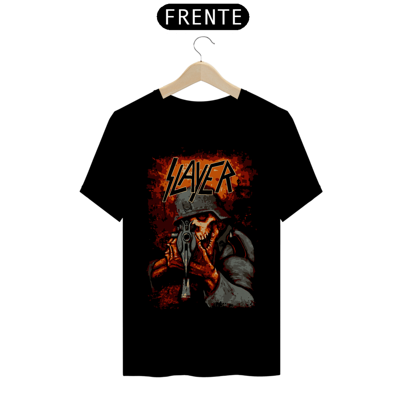 Esta camiseta apresenta uma estampa inspirada na banda Slayer, perfeita para os fãs de metal. Fabricada com 100% de algodão e meia malha cardada, proporcionando conforto e maciez. A costura simples e gola em ribana garantem um estilo casual e despojado. Com 145g de peso e fio 24.1, é uma peça leve e fresca. A técnica de impressão utilizada é o Silk Digital HD, proporcionando uma reprodução nítida e de alta qualidade da estampa.