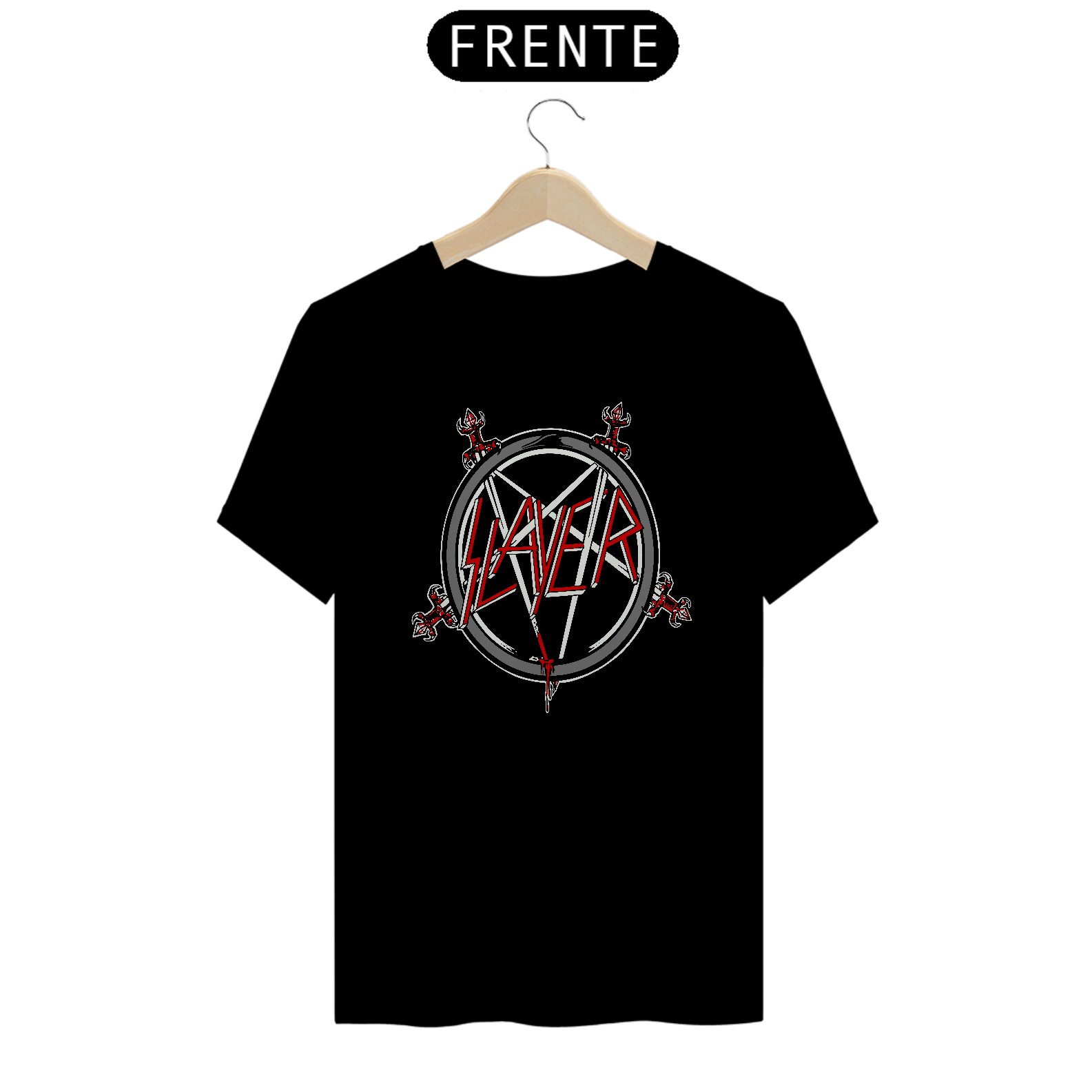 Esta camiseta apresenta uma estampa inspirada na banda Slayer, perfeita para os fãs de metal. Fabricada com 100% de algodão e meia malha cardada, proporcionando conforto e maciez. A costura simples e gola em ribana garantem um estilo casual e despojado. Com 145g de peso e fio 24.1, é uma peça leve e fresca. A técnica de impressão utilizada é o Silk Digital HD, proporcionando uma reprodução nítida e de alta qualidade da estampa.