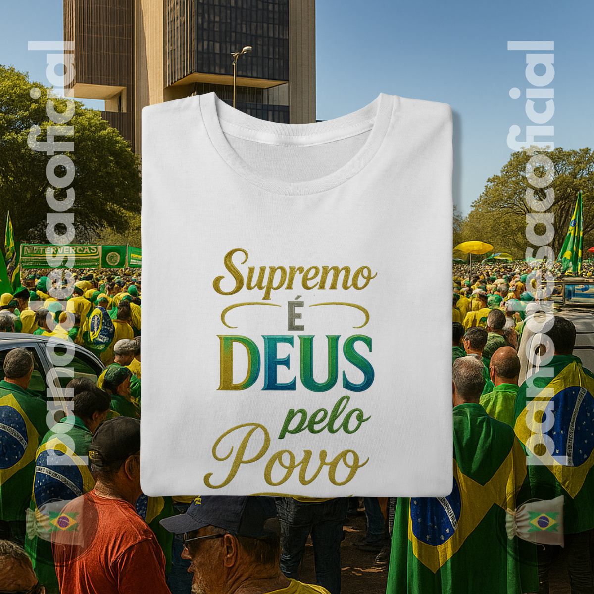 Vista uma declaração de fé e verdade com a nossa camiseta "SUPREMO É DEUS pelo Povo". Esta estampa é um manifesto poderoso sobre a soberania divina e o alicerce espiritual de uma nação.
