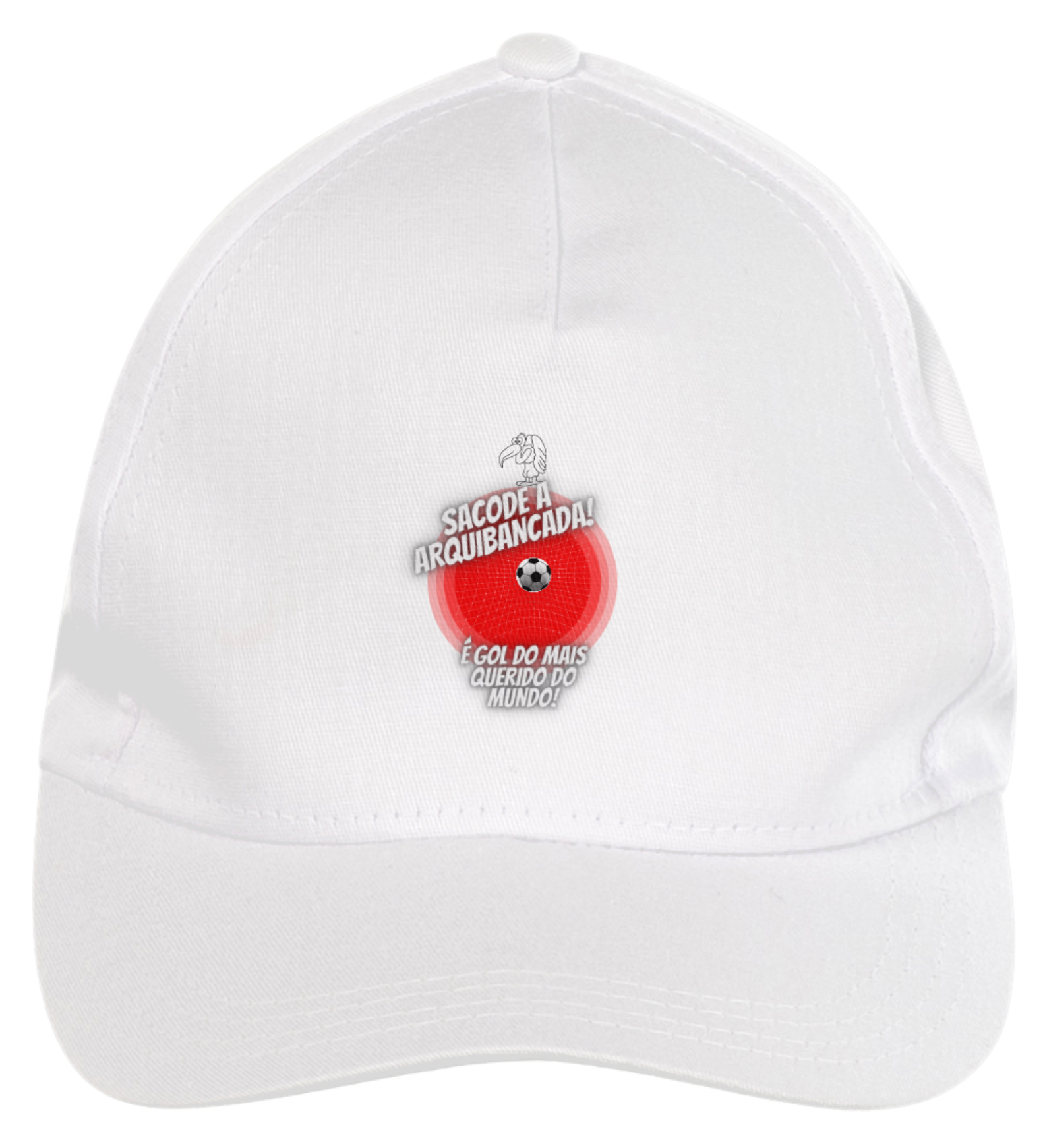Boné americano com transfer frontal em alta qualidade, aba curva e fecho em tira totalmente regulável com pinos. O modelo veste tamanho "único".