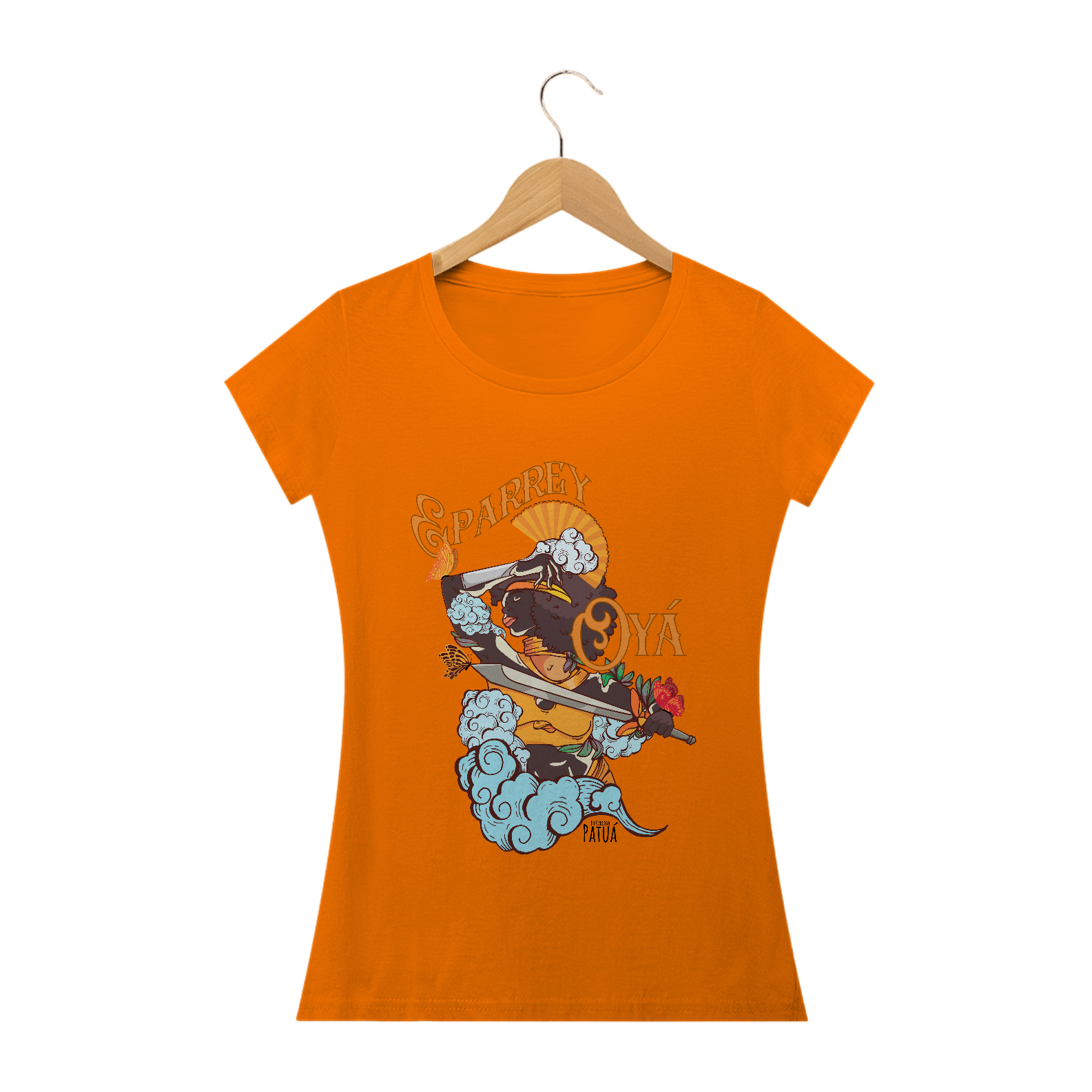 Eu Carrego no Peito: A verdadeira essência da Patuá de Axé se revela na estampa frontal cuidadosamente personalizada. Cada imagem é meticulosamente representada, capturando a energia e a beleza de Orixás e Entidades veneradas na cultura afro-brasileira. A frente da camisa exibe a presença forte e protetora de Iansã com a nossa firmeza "Eu Carrego Patuá".