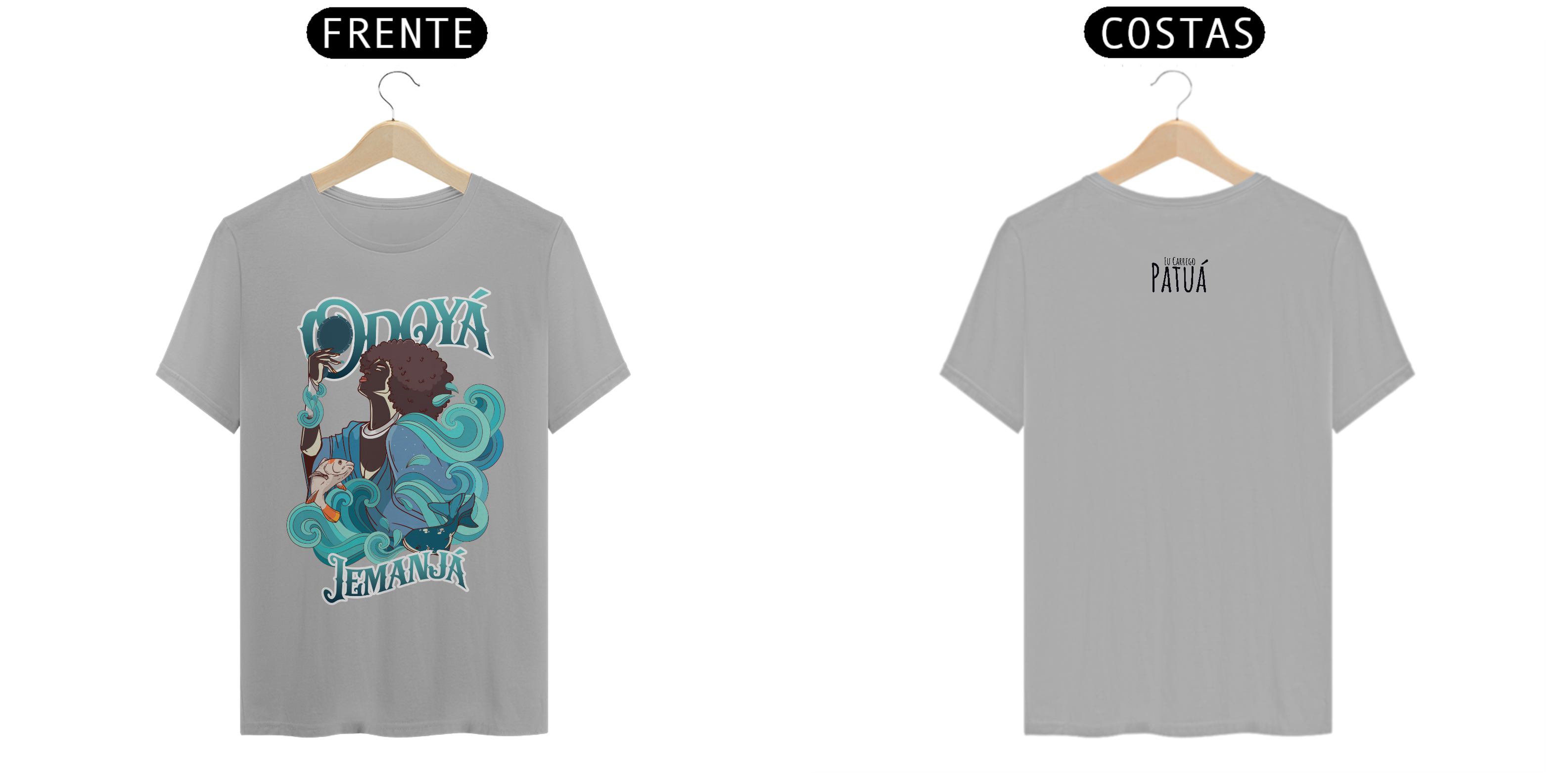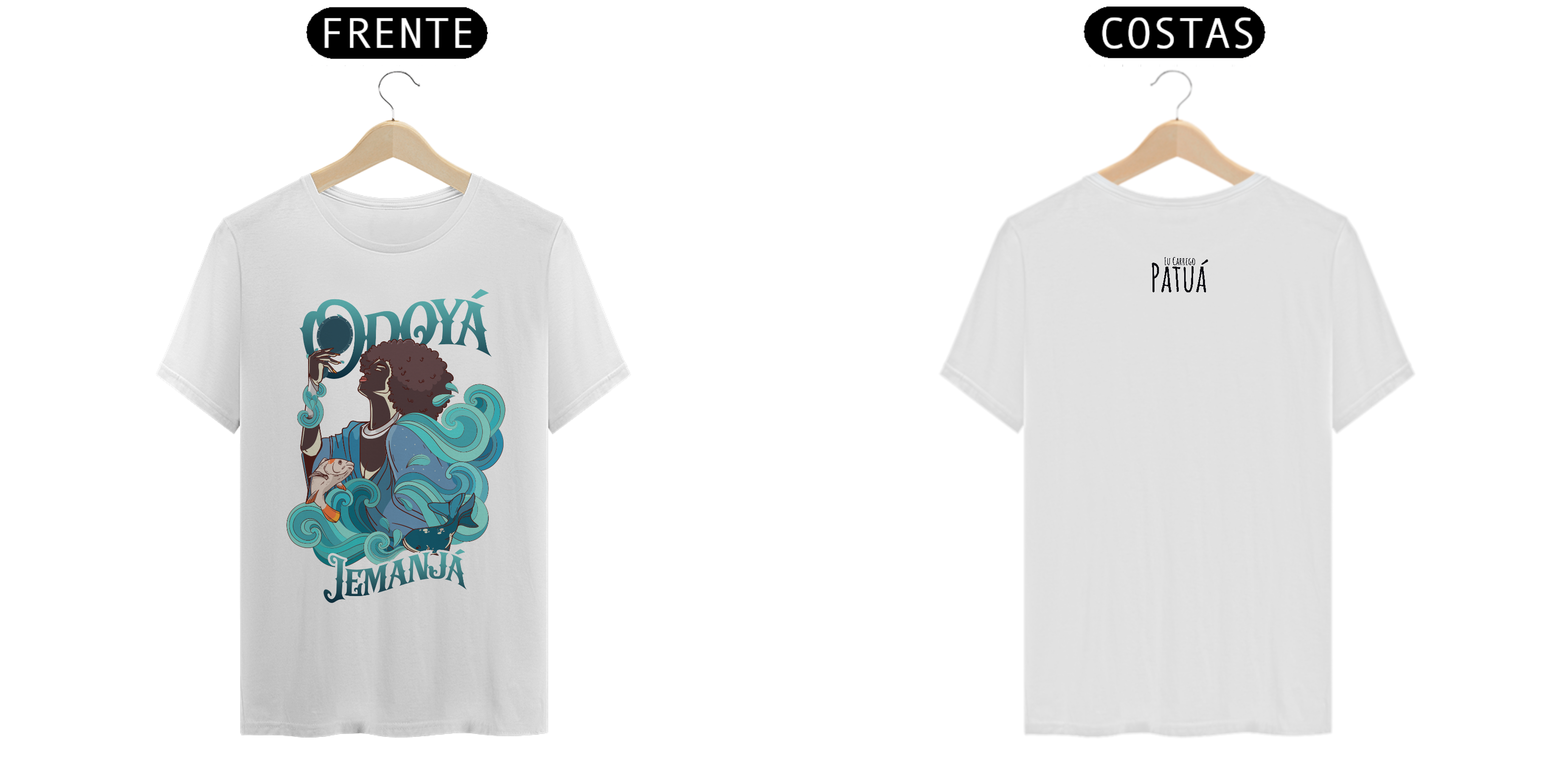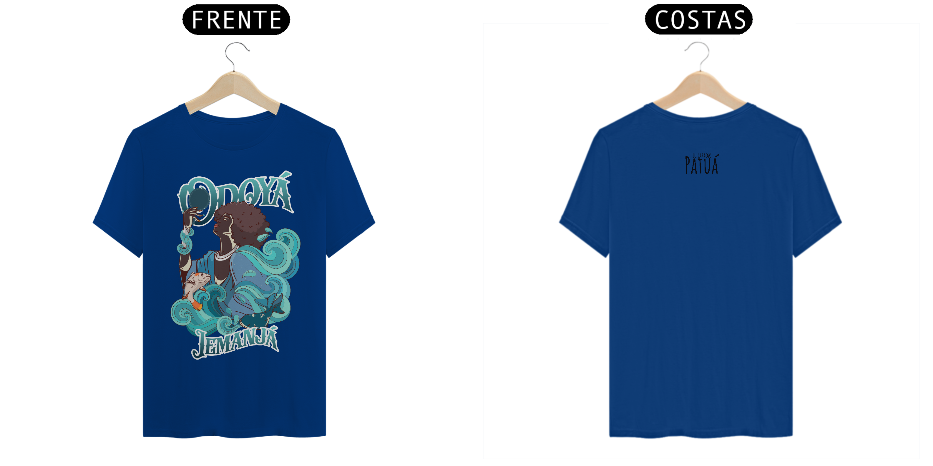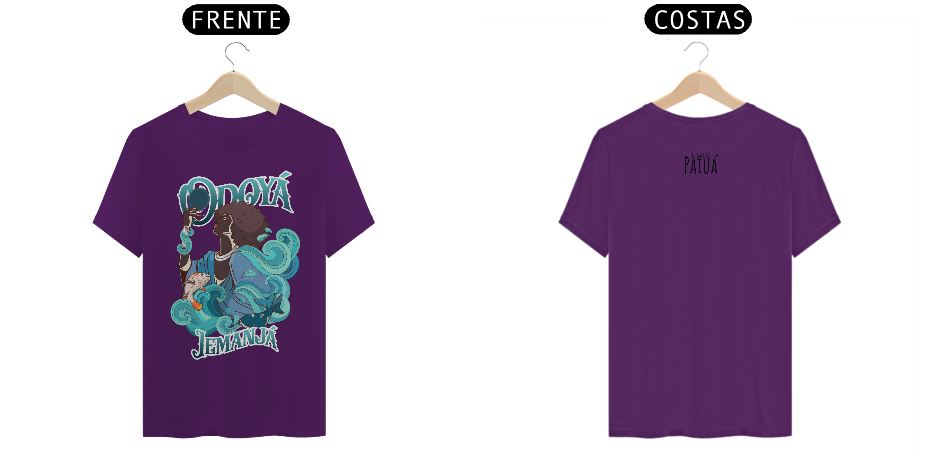 Estampa Frente e Verso: A verdadeira essência da Patuá de Axé se revela na estampa frontal e traseira cuidadosamente personalizada. Cada imagem é meticulosamente representada, capturando a energia e a beleza de Orixás e Entidades veneradas na cultura afro-brasileira. A frente da camisa exibe a presença forte e protetora de Iemanjá, enquanto a parte de trás carrega a nossa firmeza "Eu Carrego Patuá".