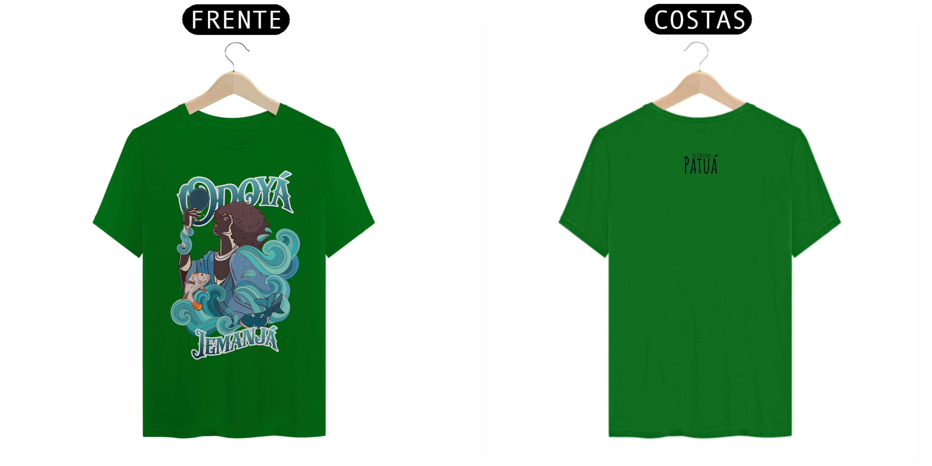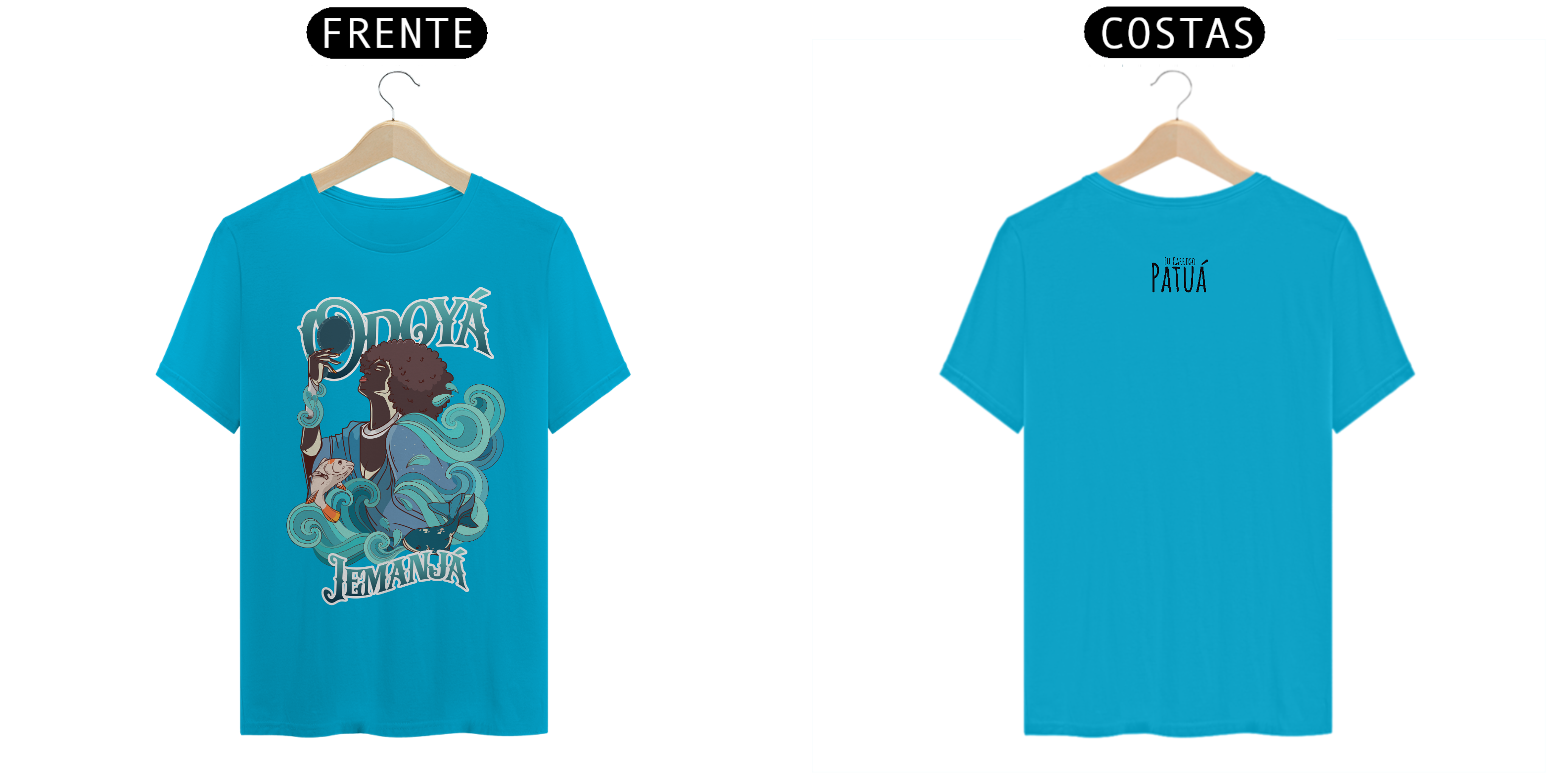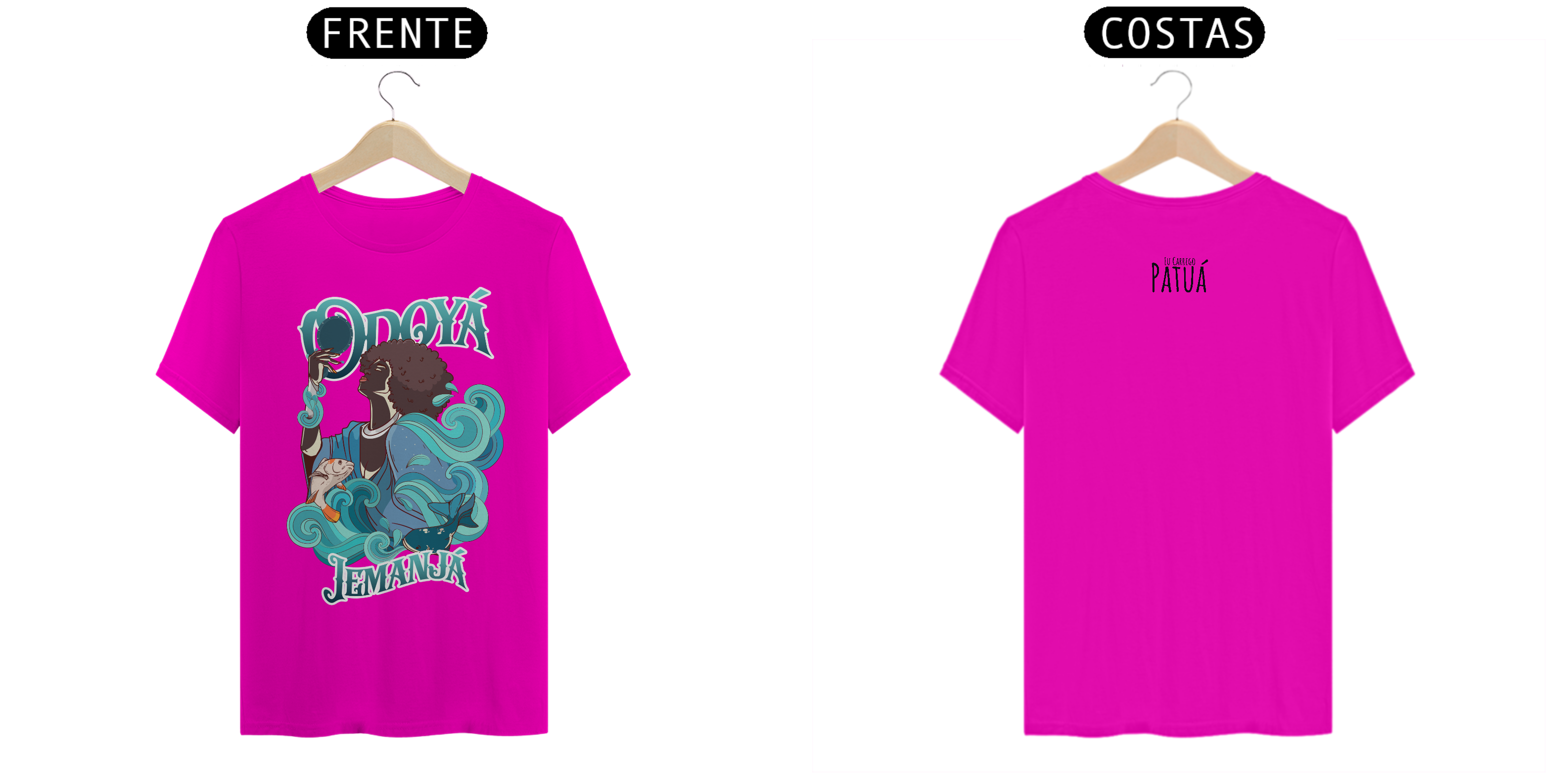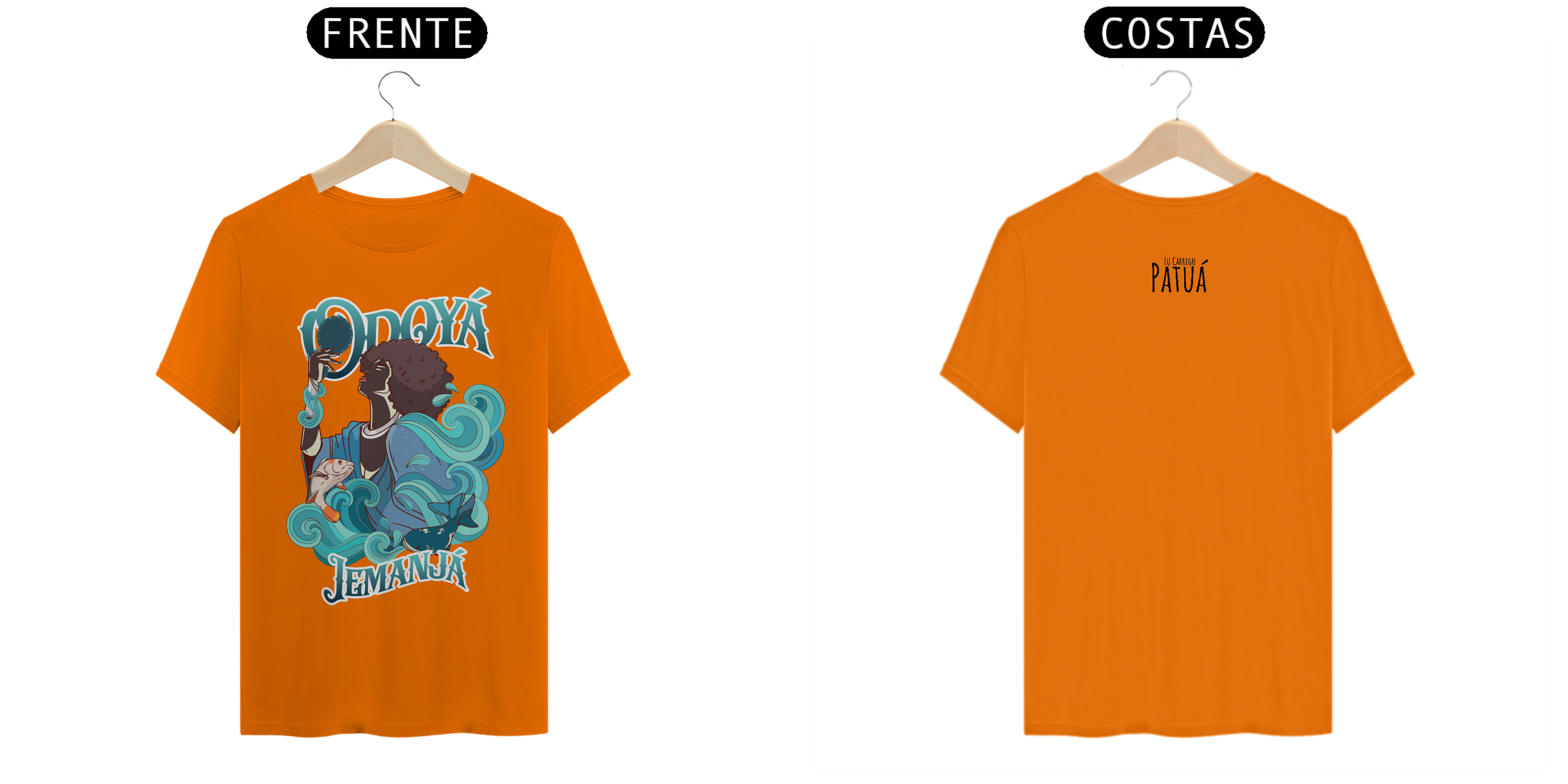 Estampa Frente e Verso: A verdadeira essência da Patuá de Axé se revela na estampa frontal e traseira cuidadosamente personalizada. Cada imagem é meticulosamente representada, capturando a energia e a beleza de Orixás e Entidades veneradas na cultura afro-brasileira. A frente da camisa exibe a presença forte e protetora de Iemanjá, enquanto a parte de trás carrega a nossa firmeza "Eu Carrego Patuá".