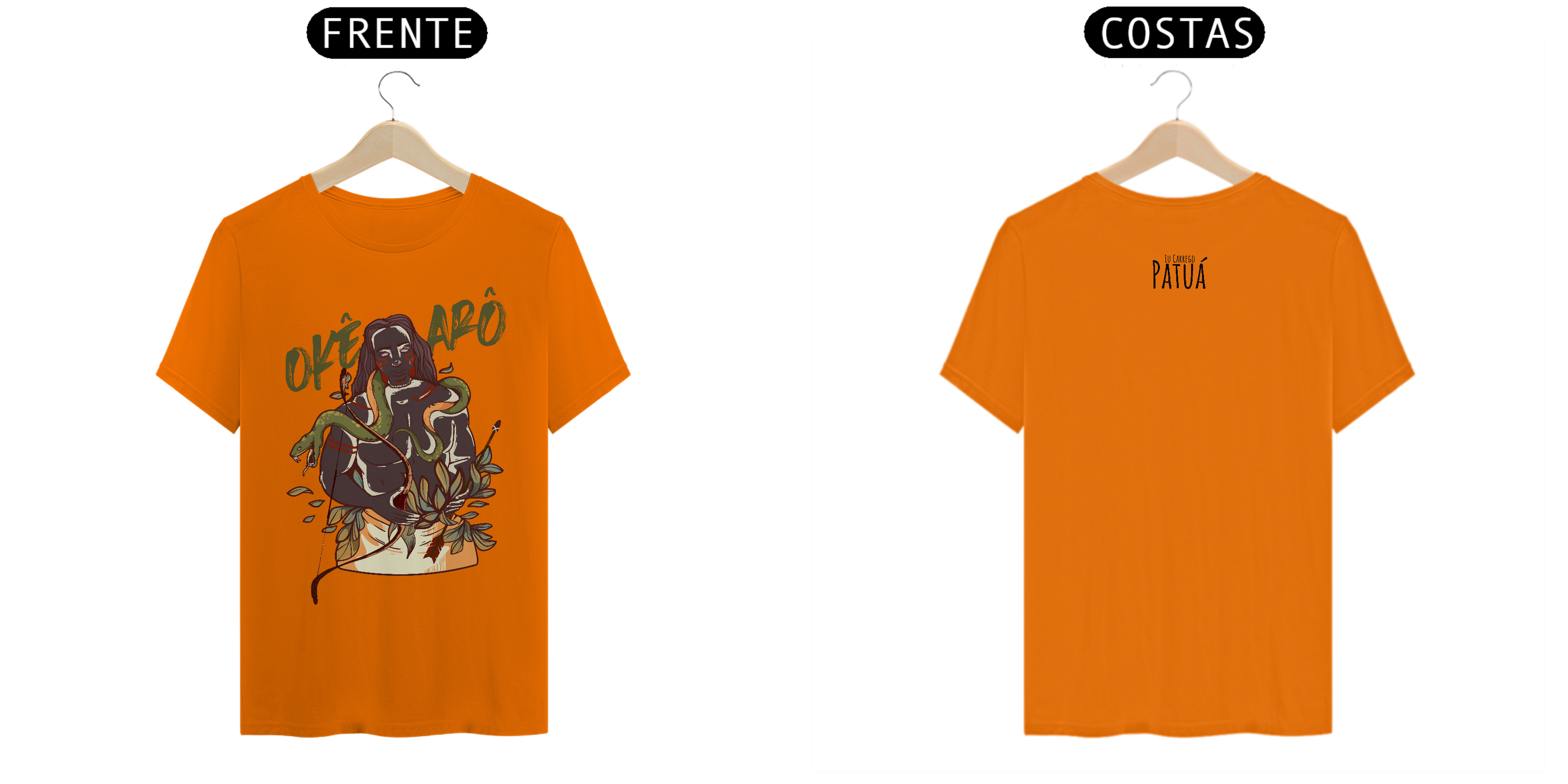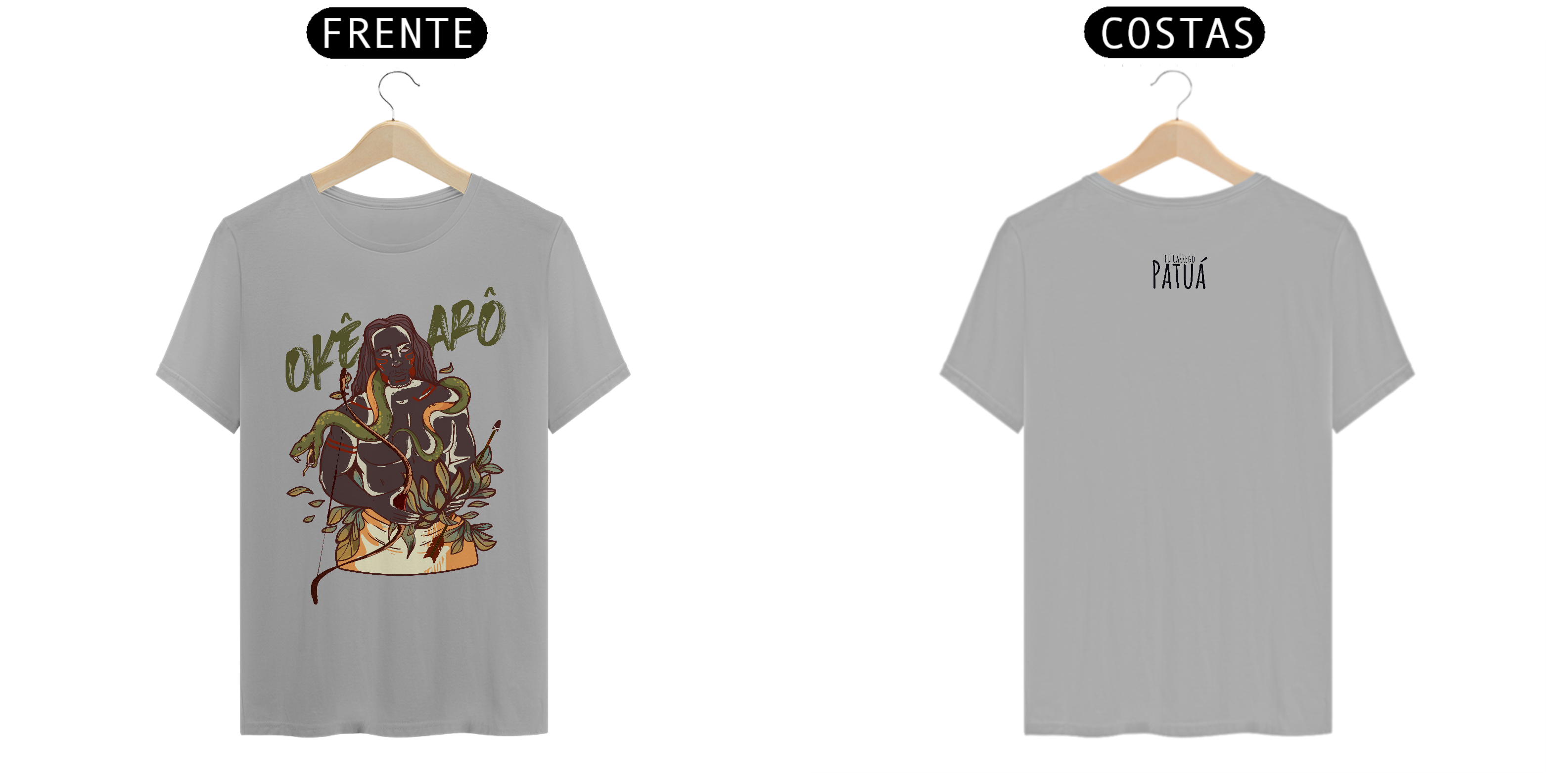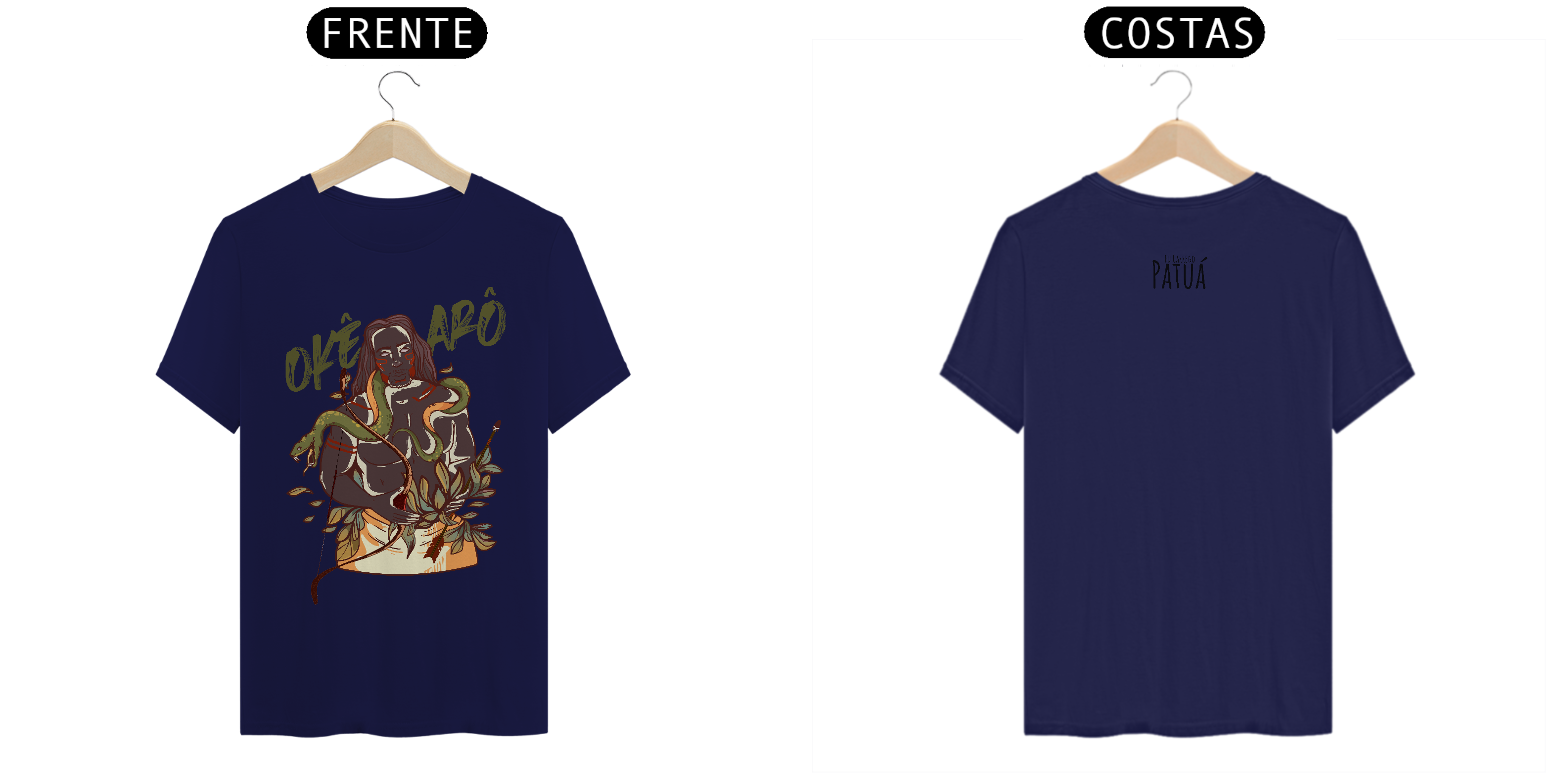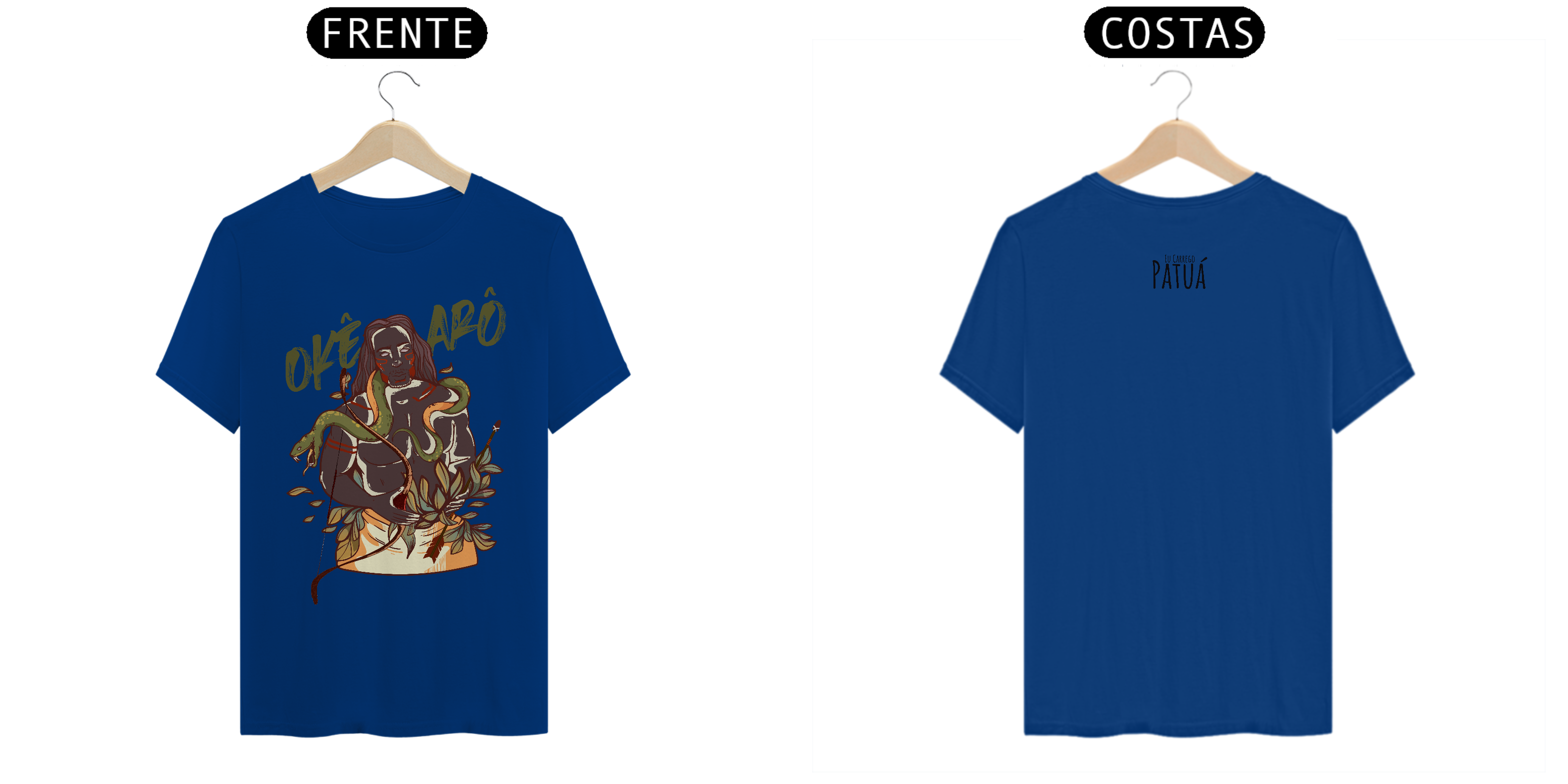 Estampa Frente e Verso: A verdadeira essência da Patuá de Axé se revela na estampa frontal e traseira cuidadosamente personalizada. Cada imagem é meticulosamente representada, capturando a energia e a beleza de Orixás e Entidades veneradas na cultura afro-brasileira. A frente da camisa exibe a presença forte e protetora de Oxóssi, enquanto a parte exibe a nossa firmeza "Eu Carrego Patuá".