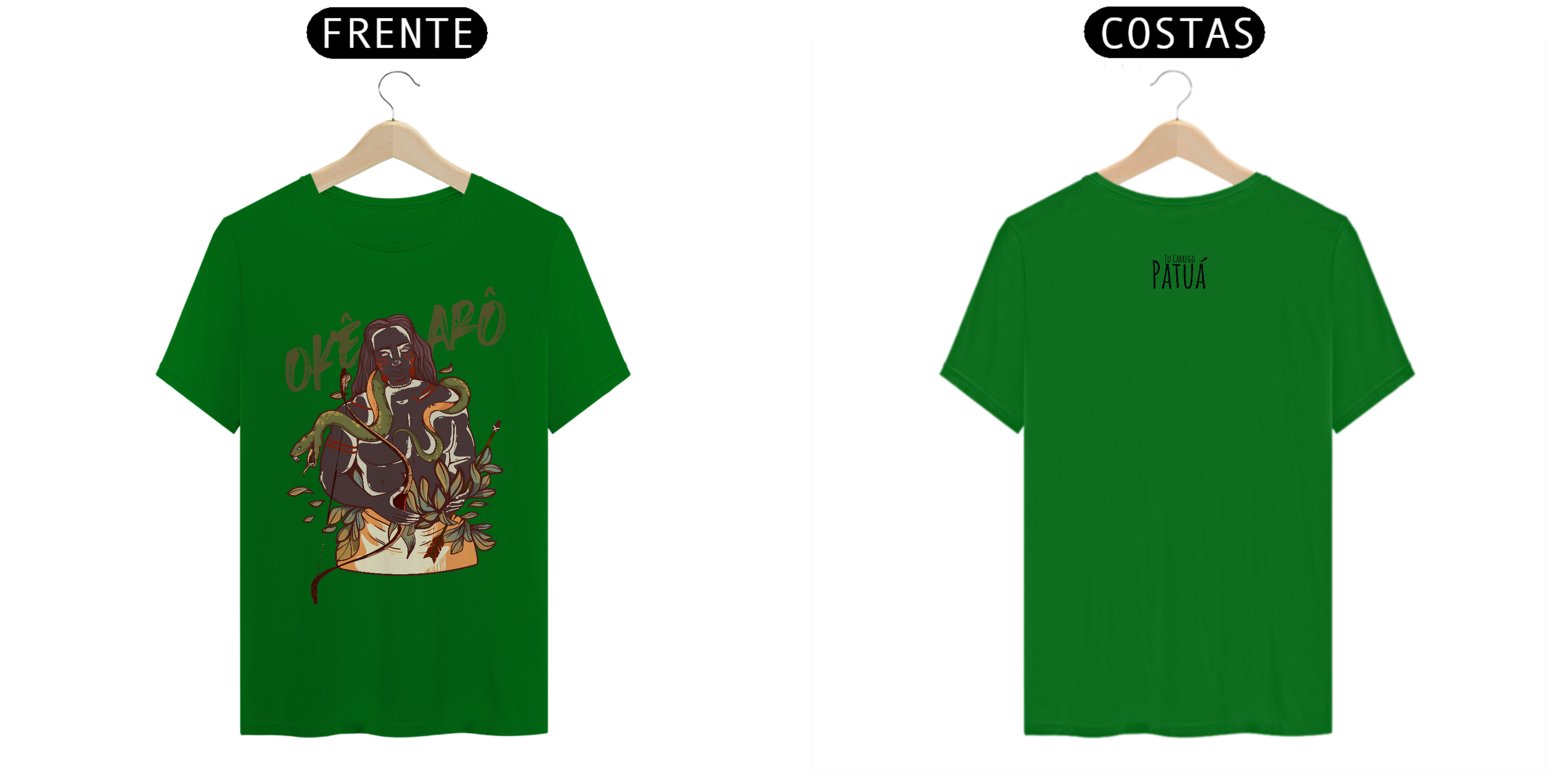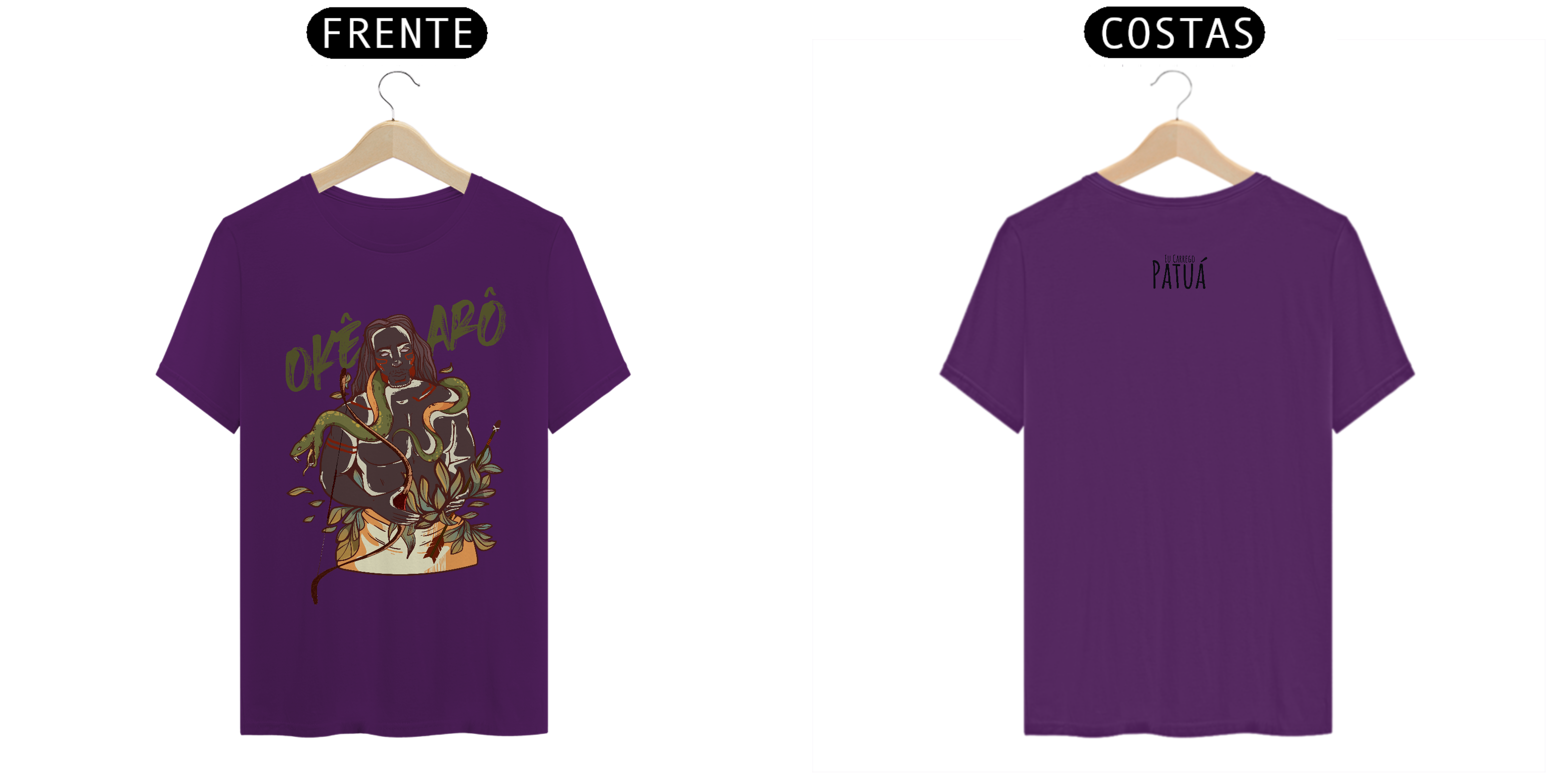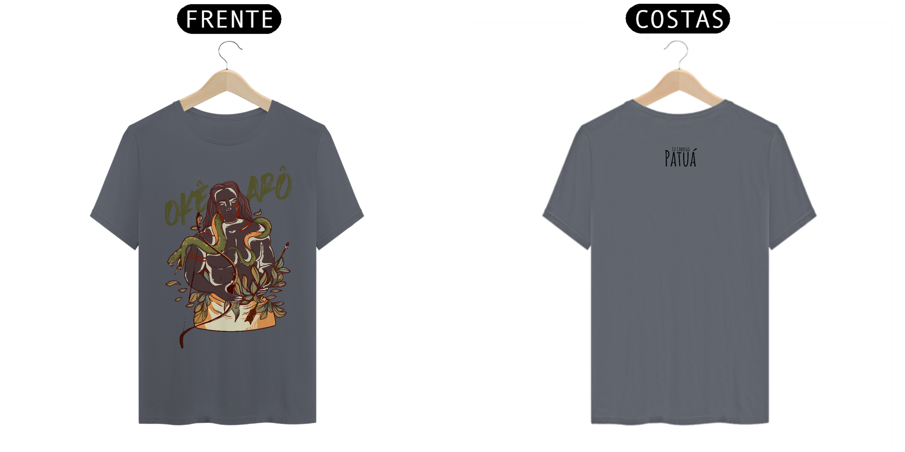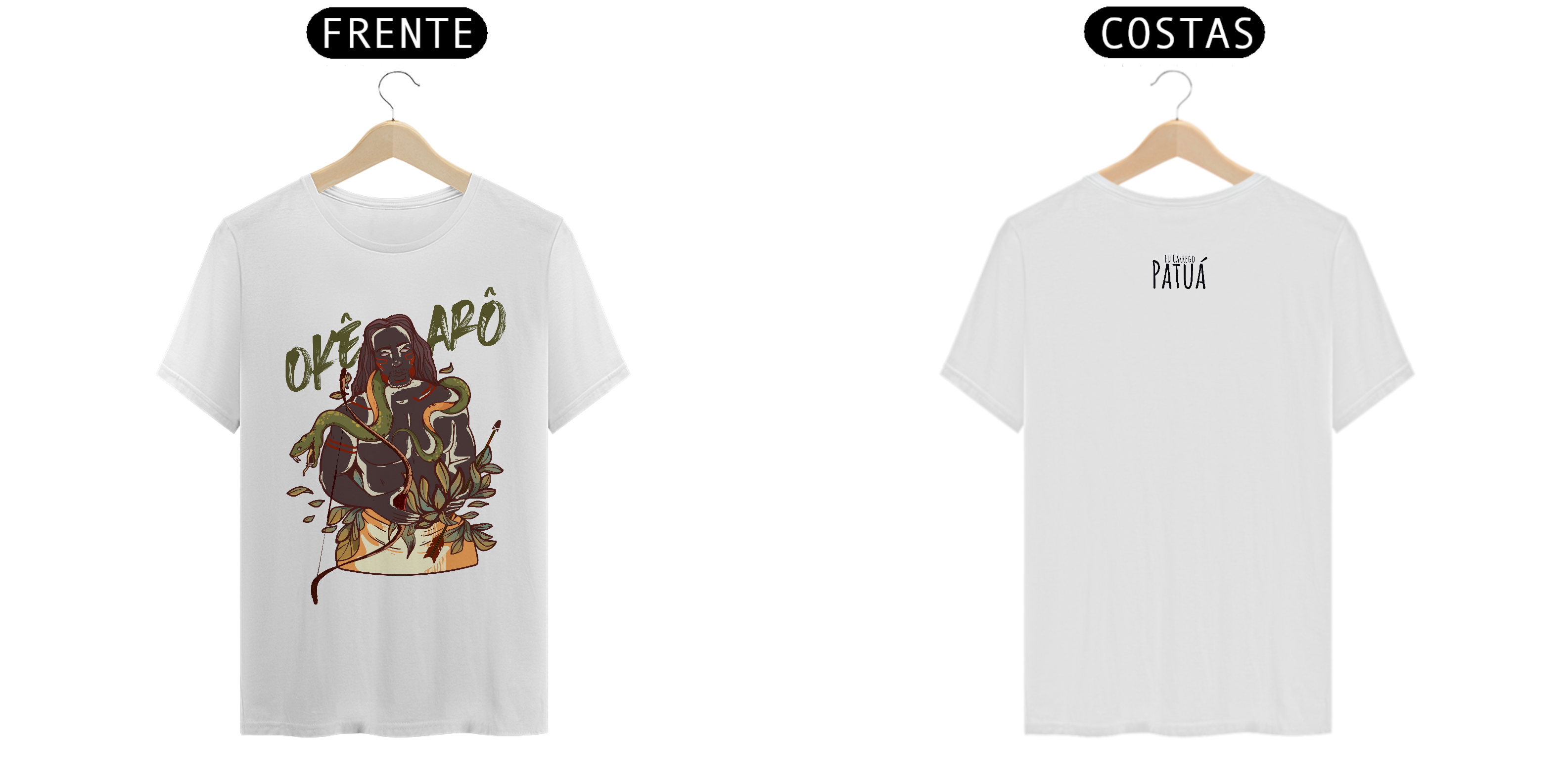 Estampa Frente e Verso: A verdadeira essência da Patuá de Axé se revela na estampa frontal e traseira cuidadosamente personalizada. Cada imagem é meticulosamente representada, capturando a energia e a beleza de Orixás e Entidades veneradas na cultura afro-brasileira. A frente da camisa exibe a presença forte e protetora de Oxóssi, enquanto a parte exibe a nossa firmeza "Eu Carrego Patuá".