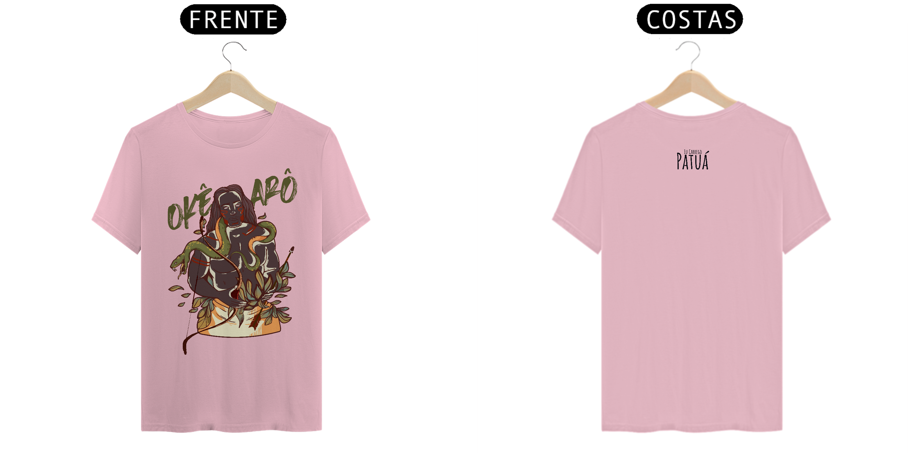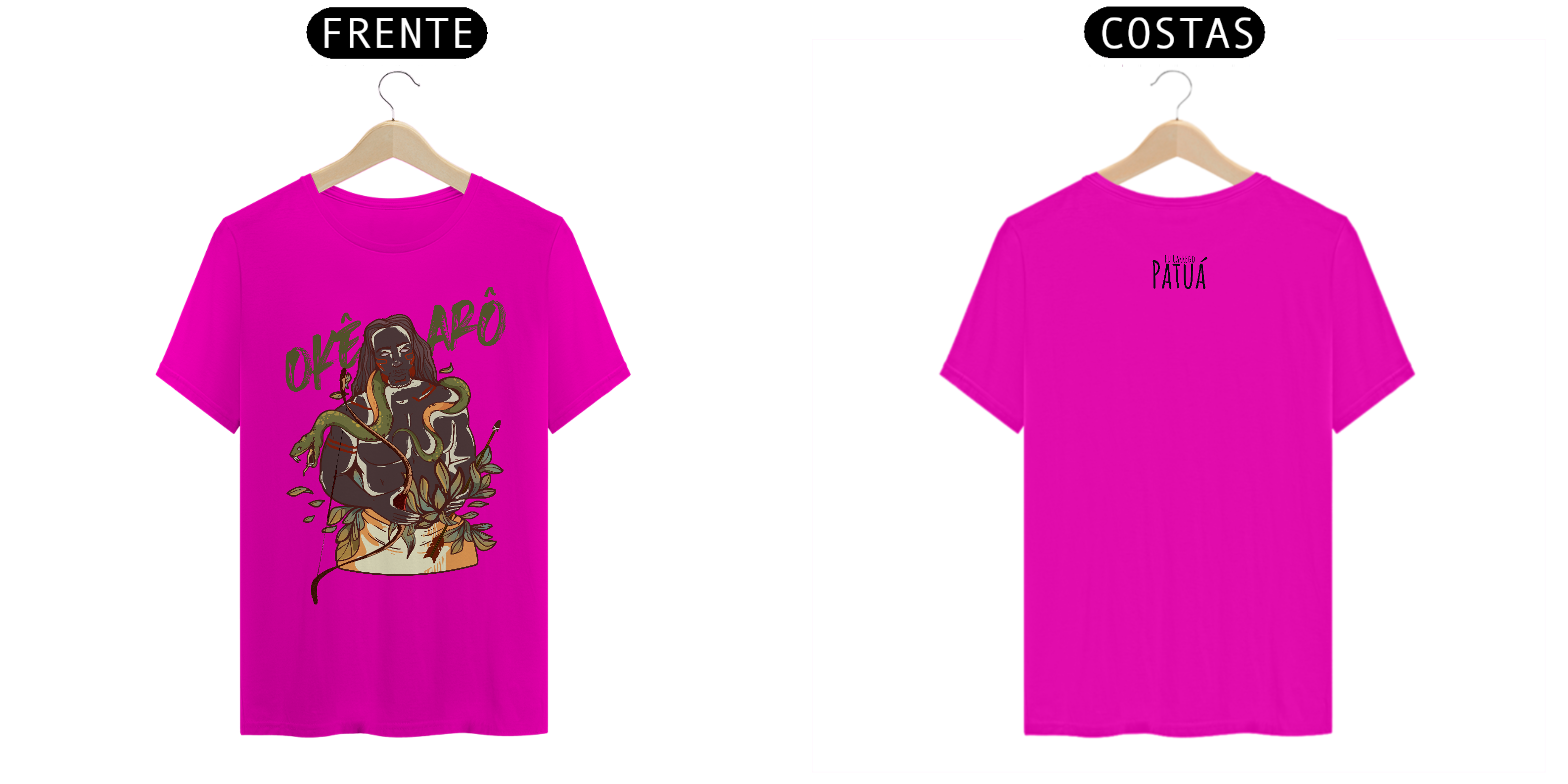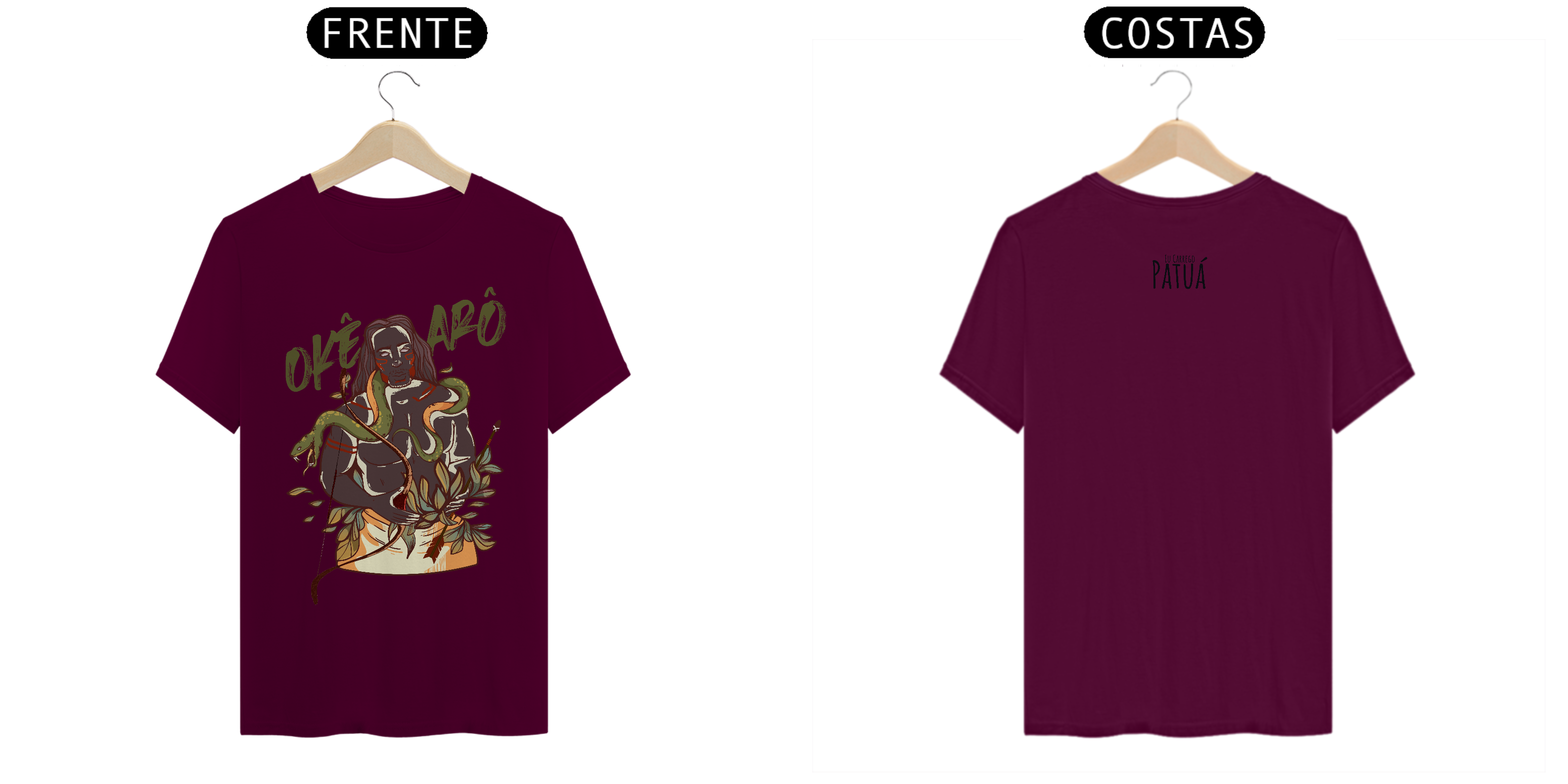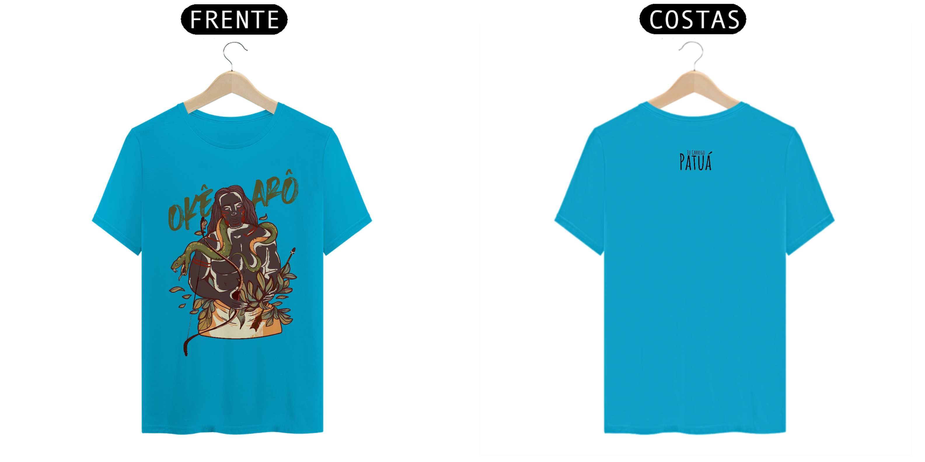Estampa Frente e Verso: A verdadeira essência da Patuá de Axé se revela na estampa frontal e traseira cuidadosamente personalizada. Cada imagem é meticulosamente representada, capturando a energia e a beleza de Orixás e Entidades veneradas na cultura afro-brasileira. A frente da camisa exibe a presença forte e protetora de Oxóssi, enquanto a parte exibe a nossa firmeza "Eu Carrego Patuá".