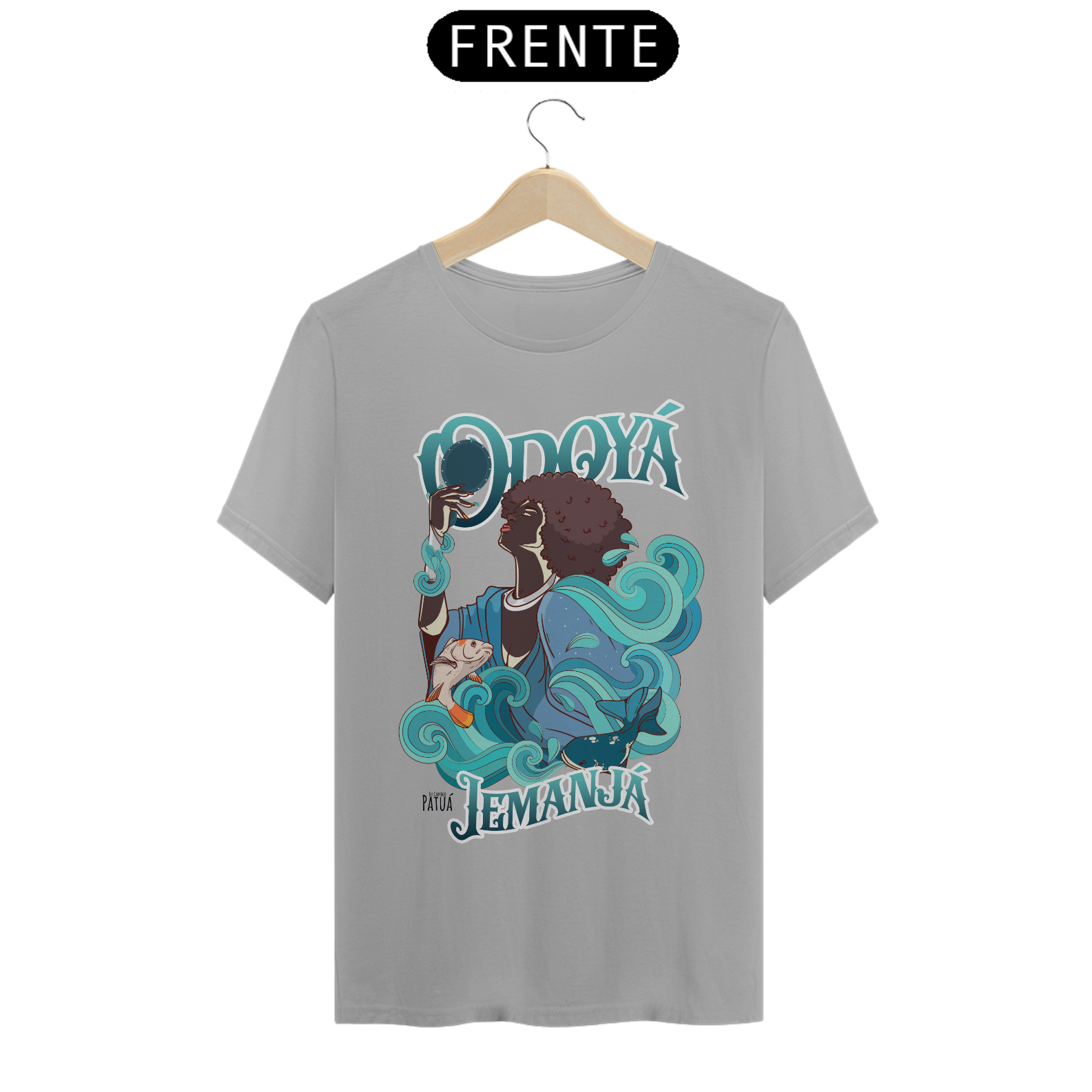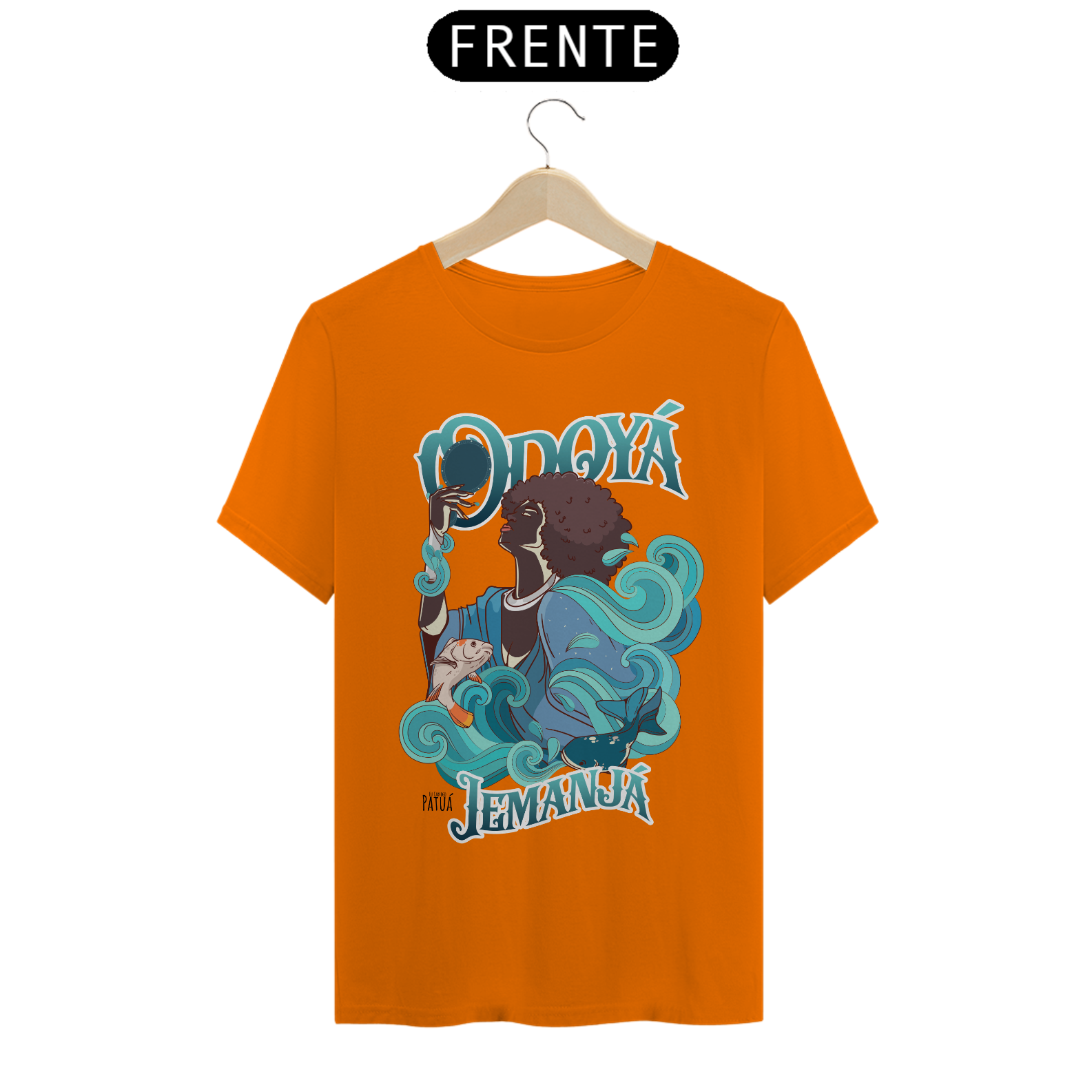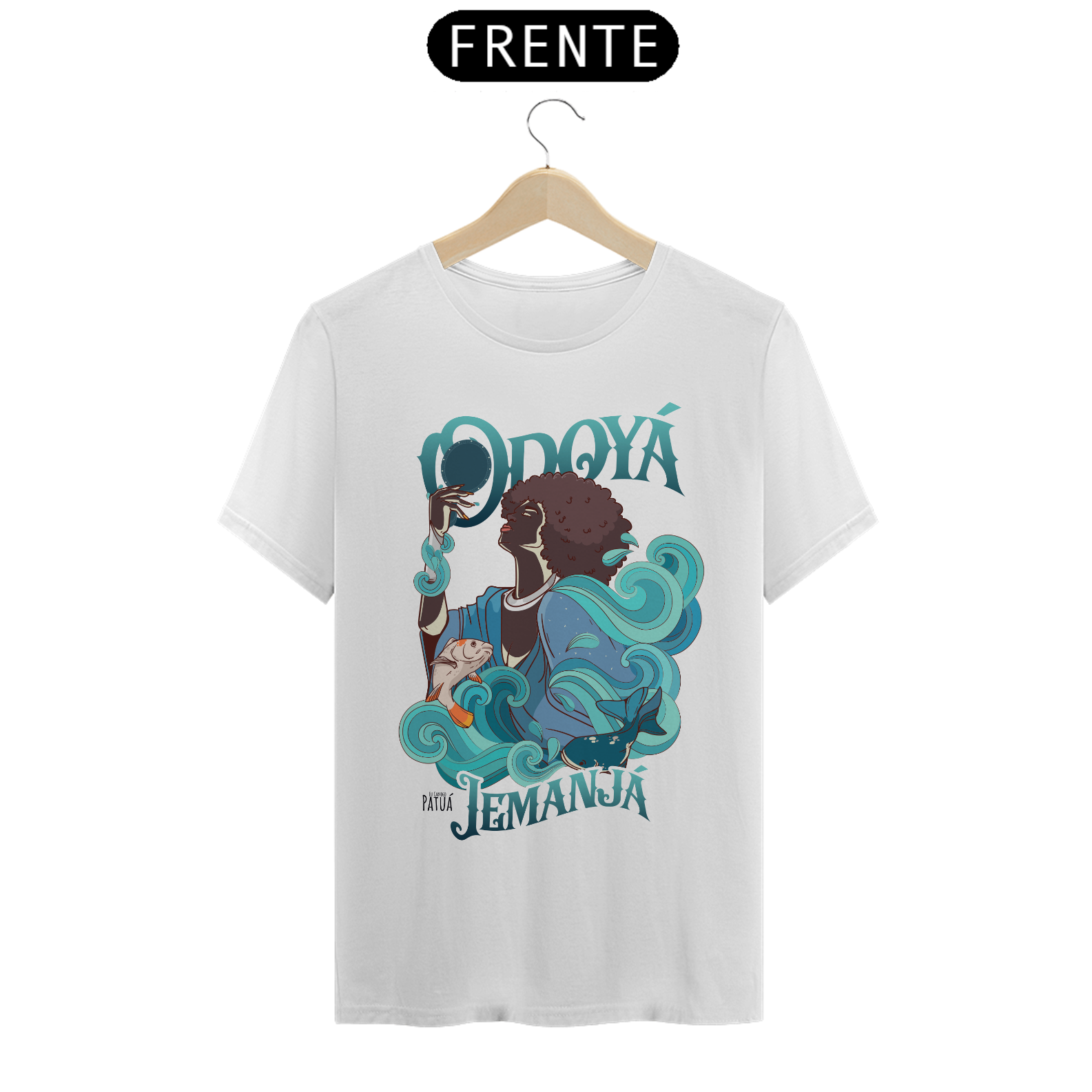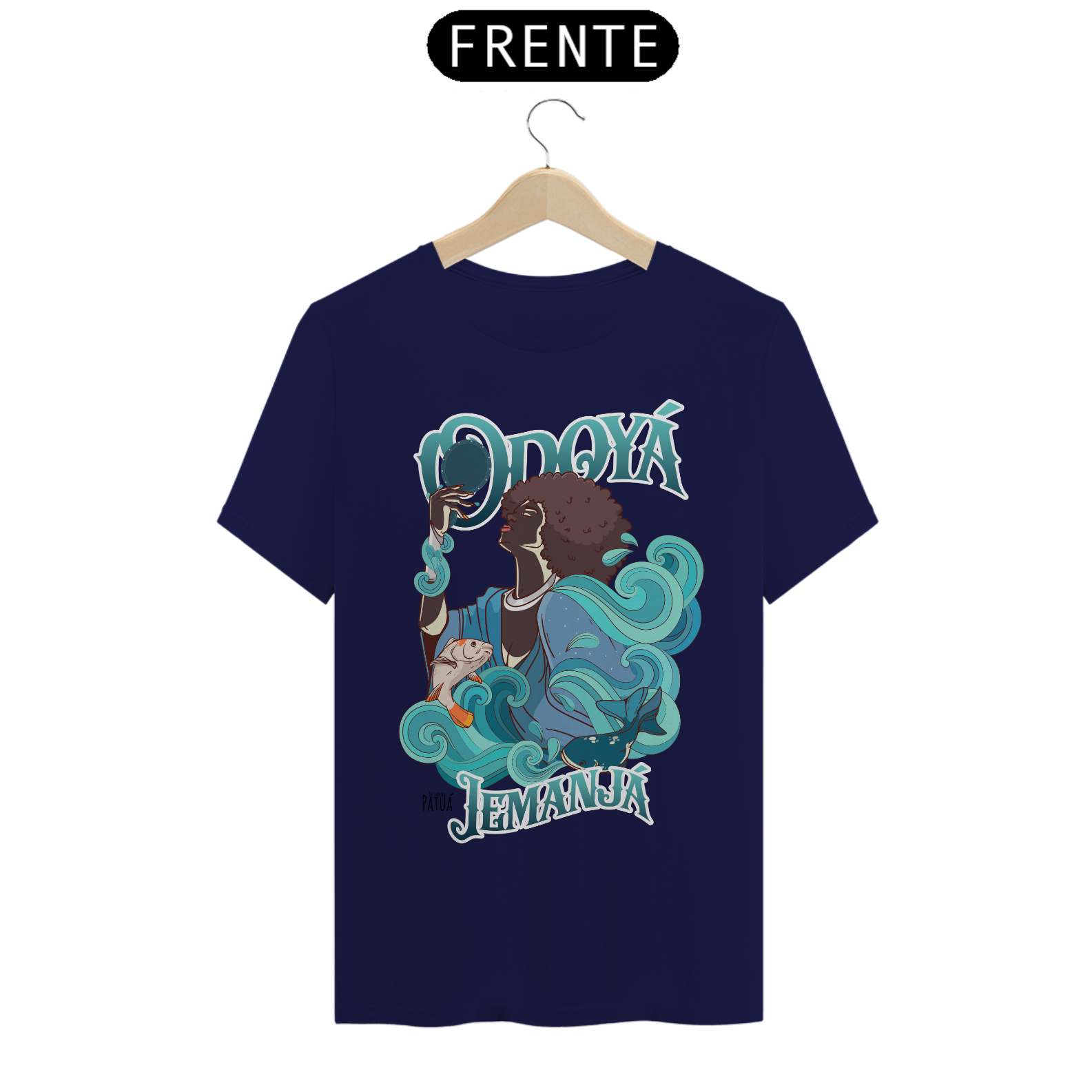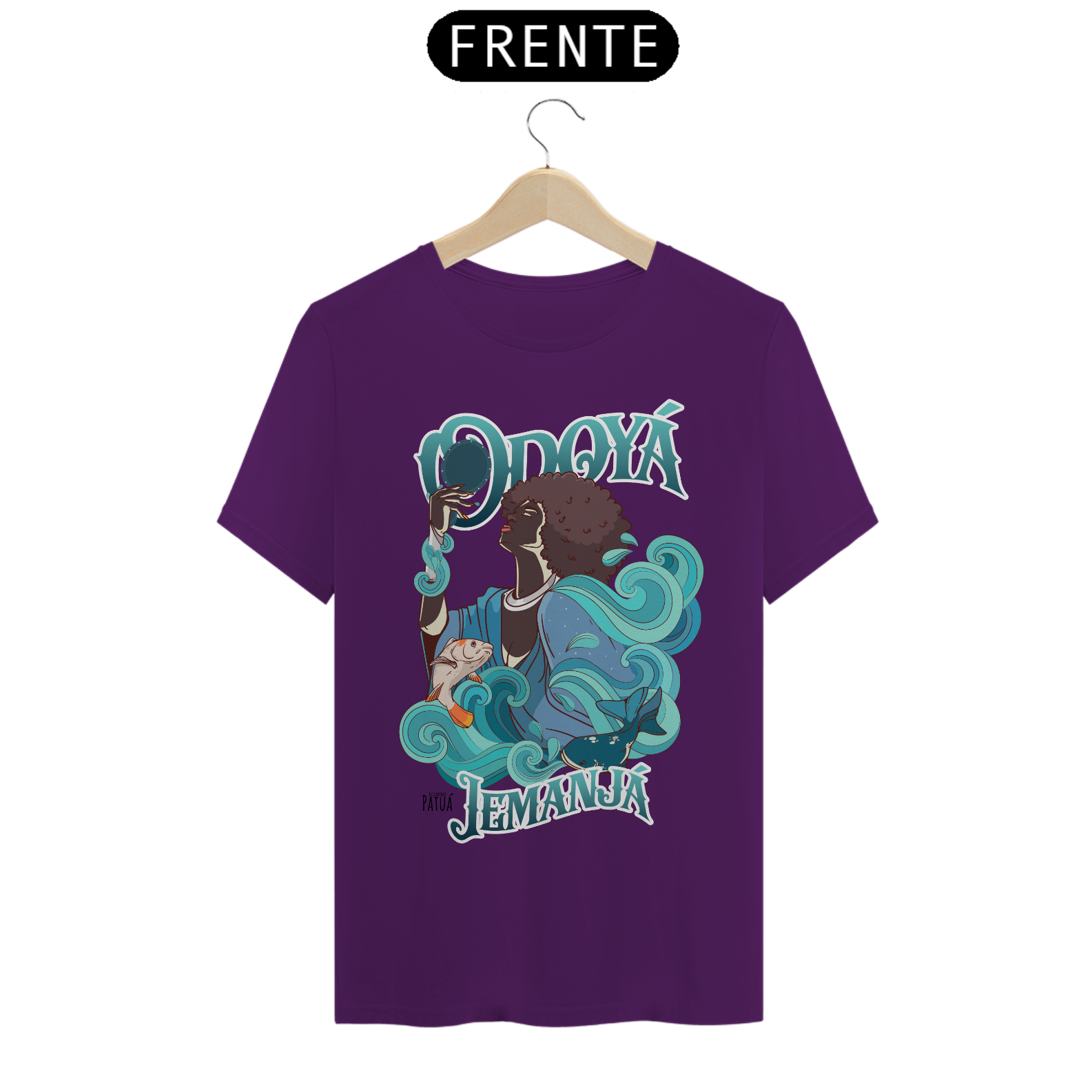 Eu Carrego no Peito: A verdadeira essência da Patuá de Axé se revela na estampa frontal cuidadosamente personalizada. Cada imagem é meticulosamente representada, capturando a energia e a beleza de Orixás e Entidades veneradas na cultura afro-brasileira. A frente da camisa exibe a presença forte e protetora de Iemanjá com a nossa firmeza "Eu Carrego Patuá".