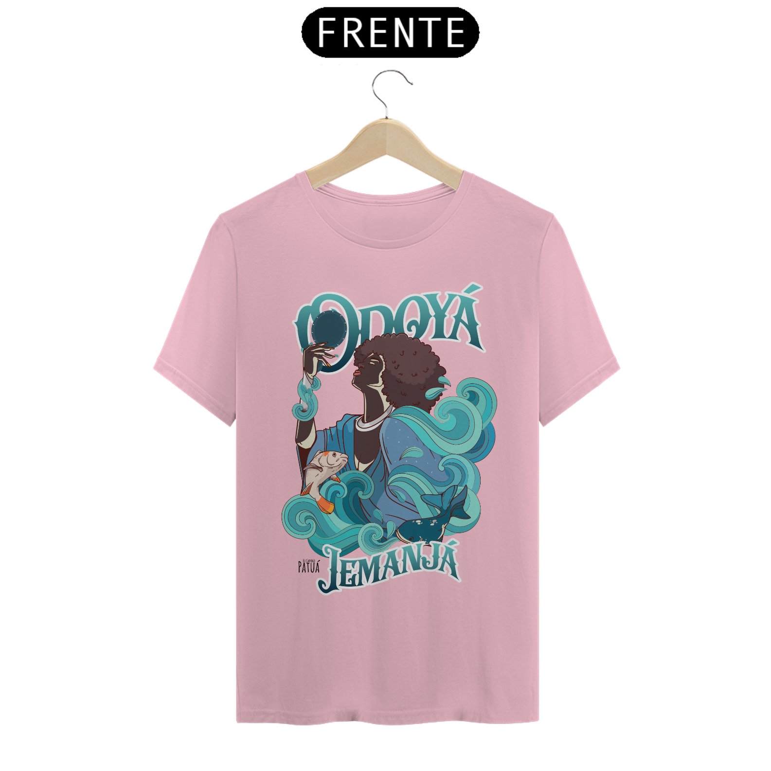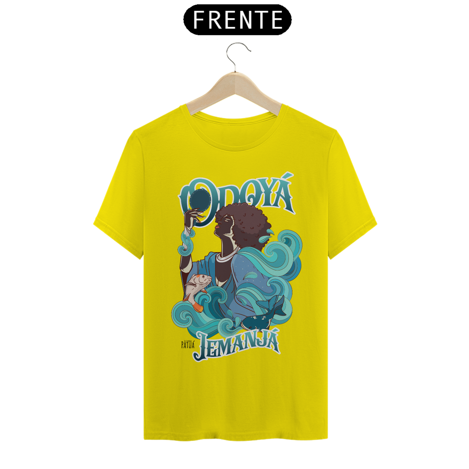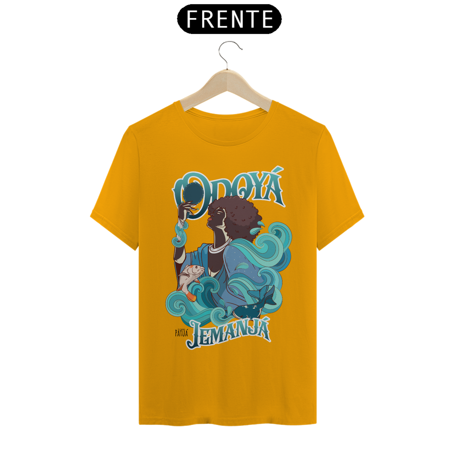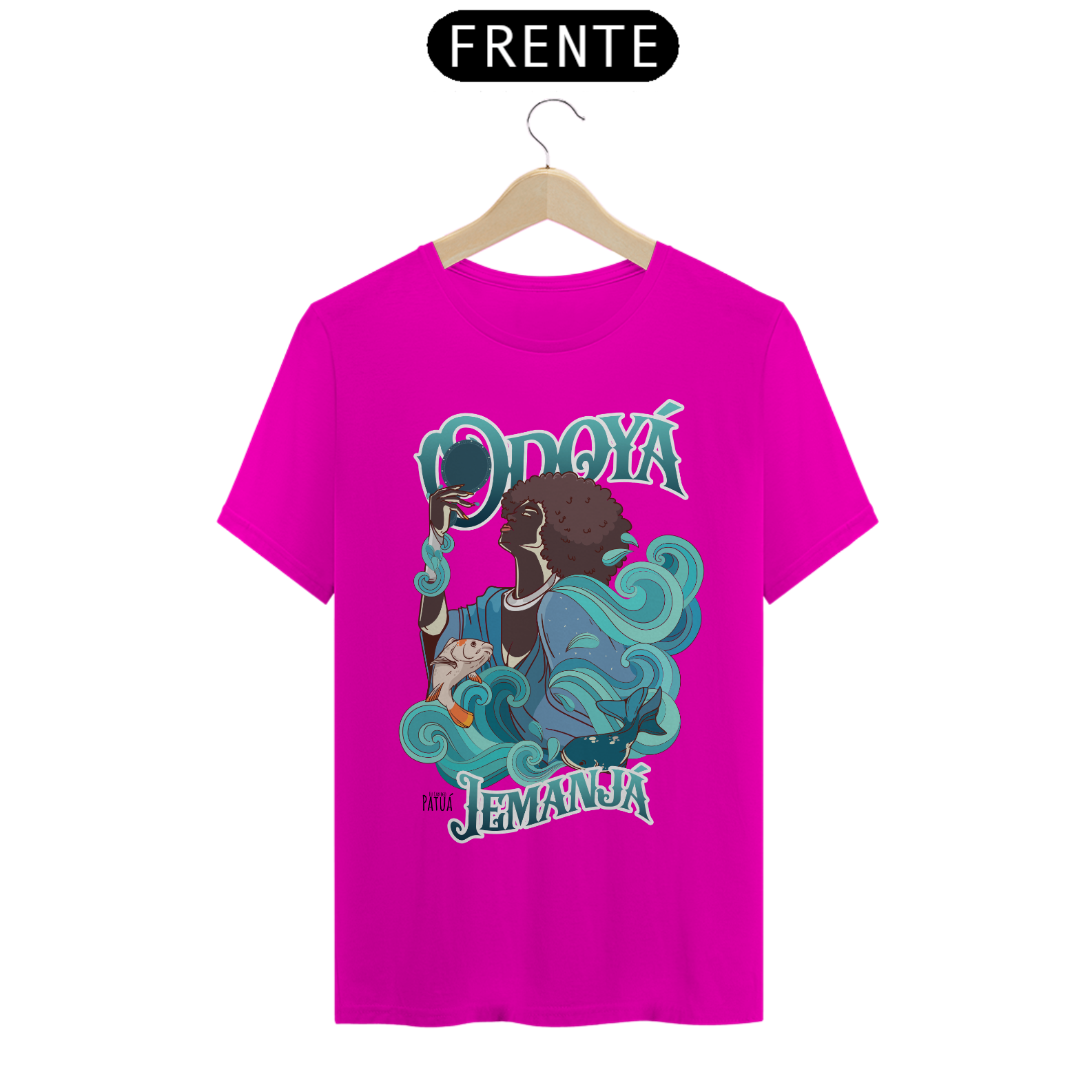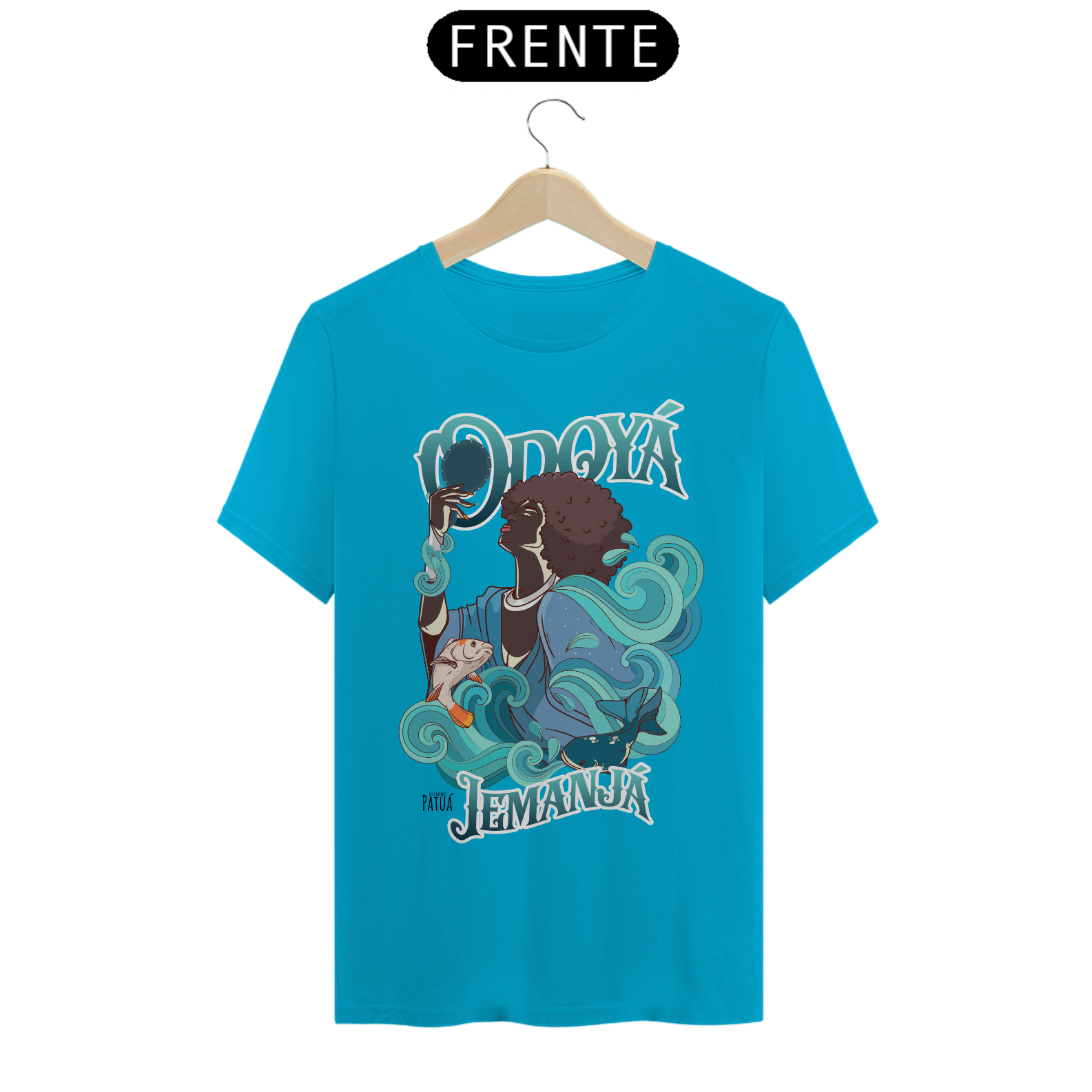 Eu Carrego no Peito: A verdadeira essência da Patuá de Axé se revela na estampa frontal cuidadosamente personalizada. Cada imagem é meticulosamente representada, capturando a energia e a beleza de Orixás e Entidades veneradas na cultura afro-brasileira. A frente da camisa exibe a presença forte e protetora de Iemanjá com a nossa firmeza "Eu Carrego Patuá".