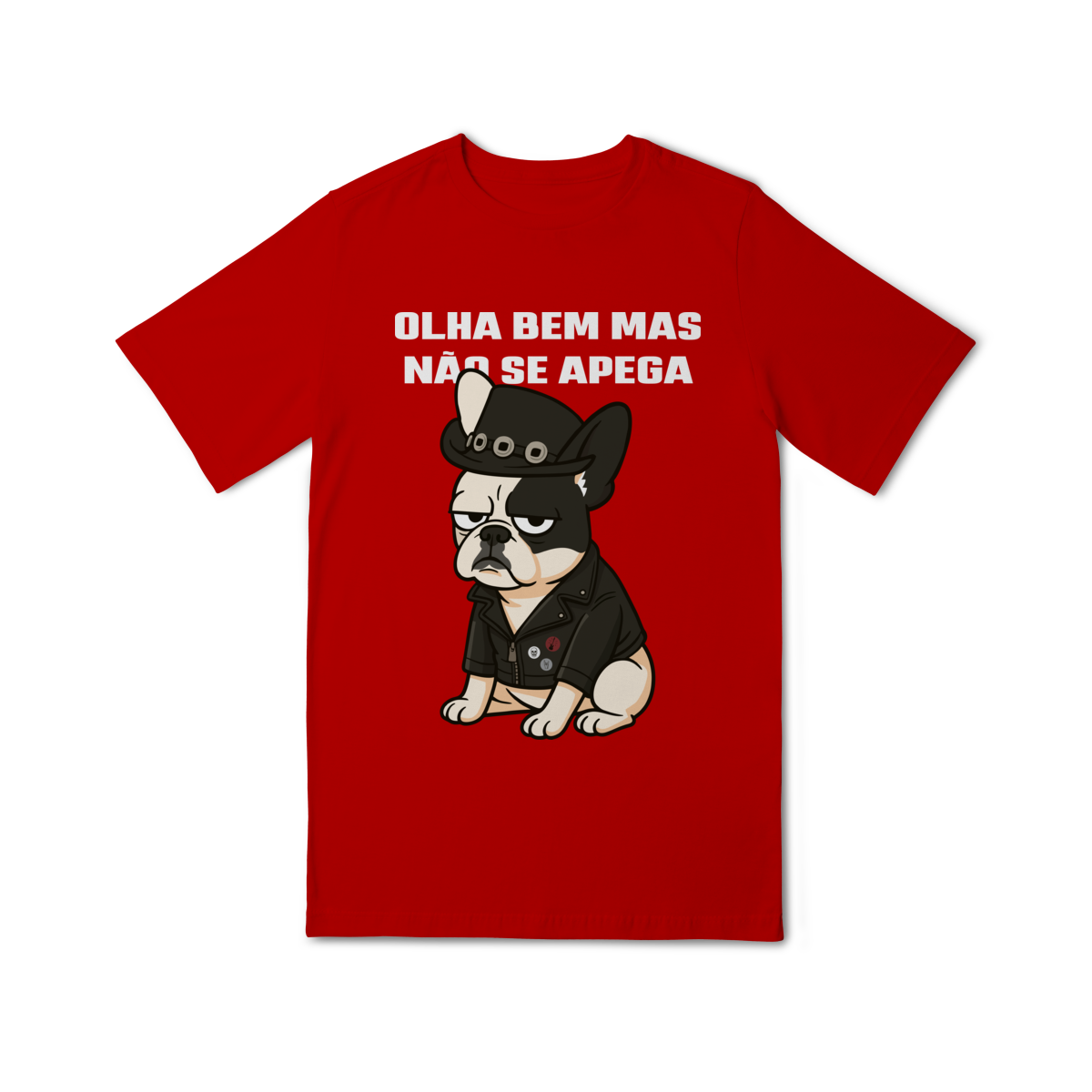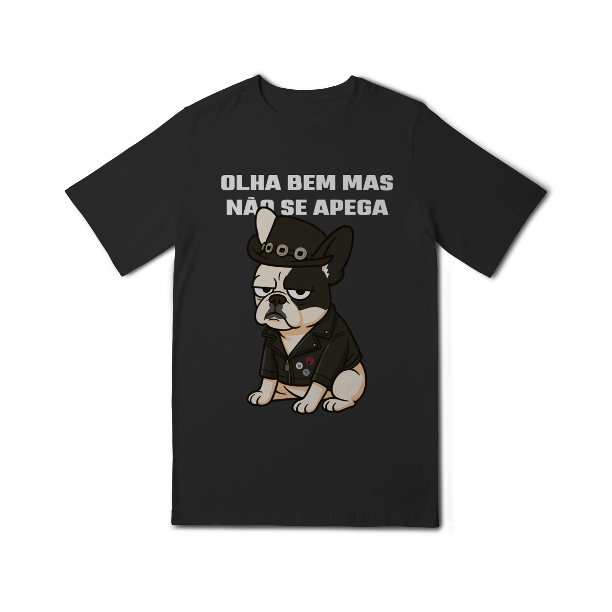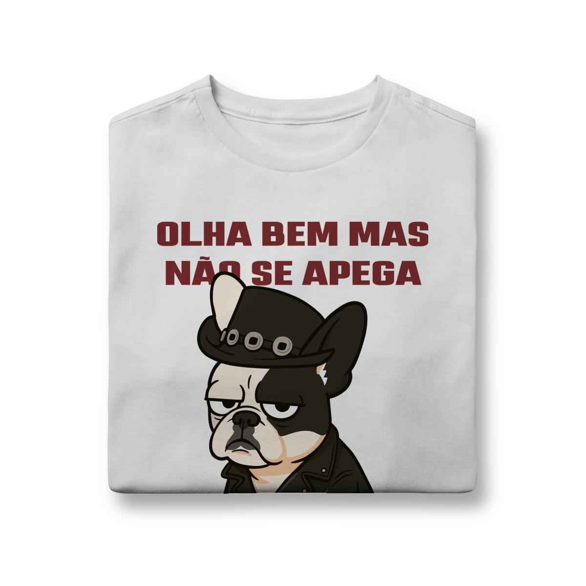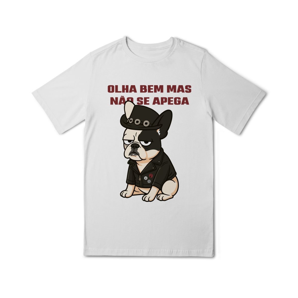 Deixe o look dos pequenos ainda mais estiloso com essa camiseta superconfortável, estampada com um buldog cheio de personalidade e a frase divertida “Olha bem… mas não se apega”.