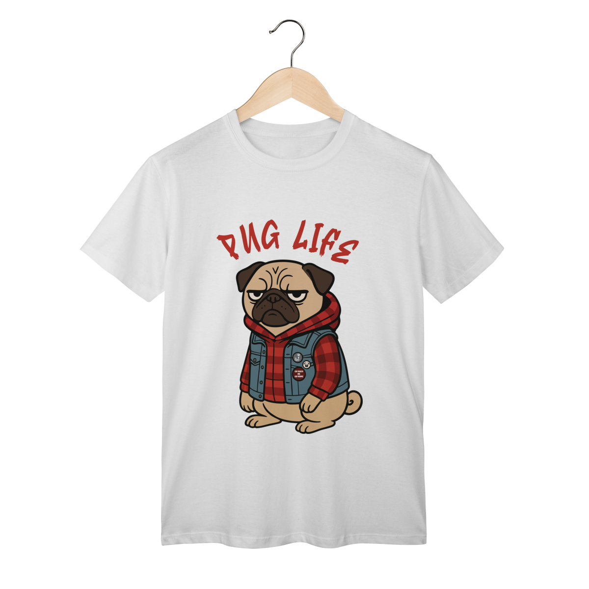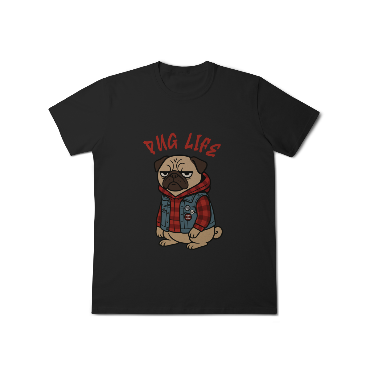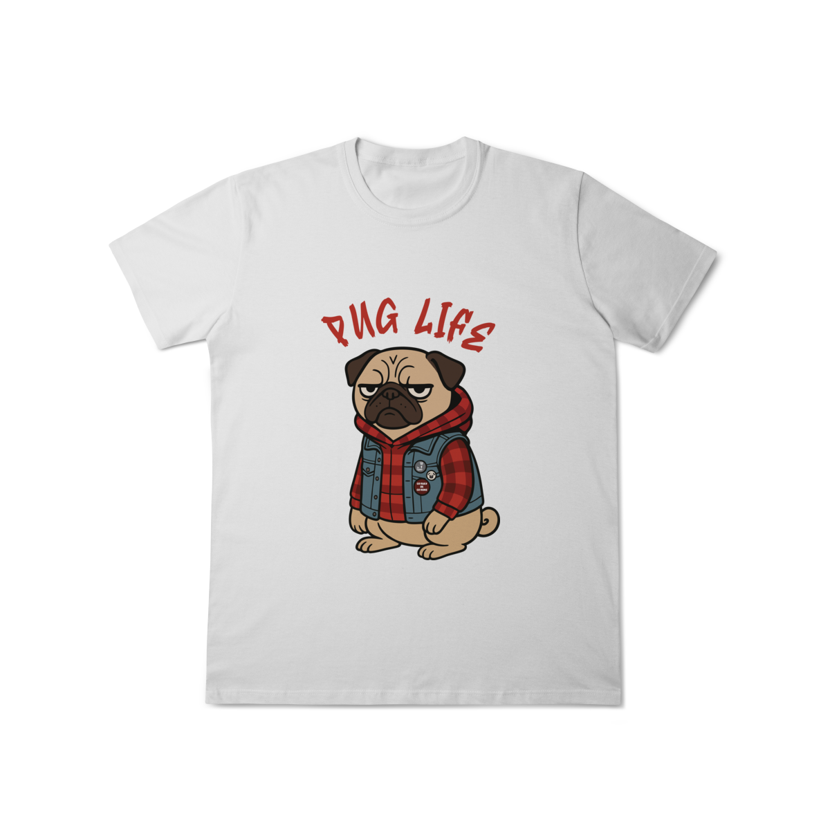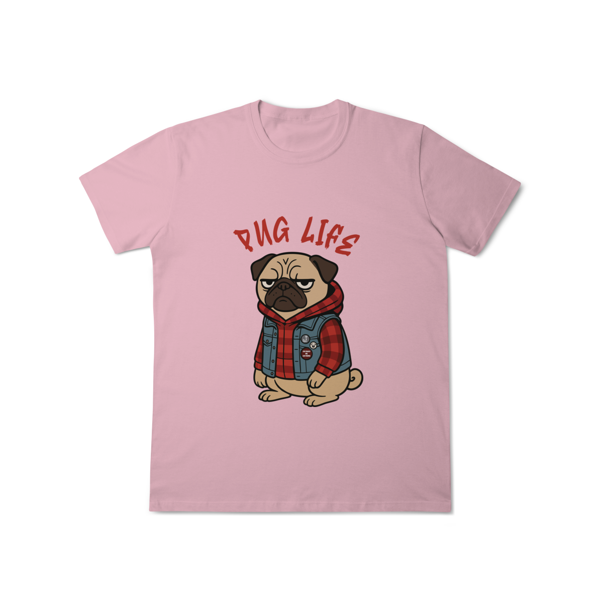 Para os pequenos que já nasceram com atitude, a camiseta “Pug Life” traz um pug cheio de estilo, com vibe séria e aquele look street que transforma qualquer visual. A arte exclusiva combina jaqueta jeans, xadrez e muita personalidade, perfeita para crianças que gostam de peças marcantes e divertidas.