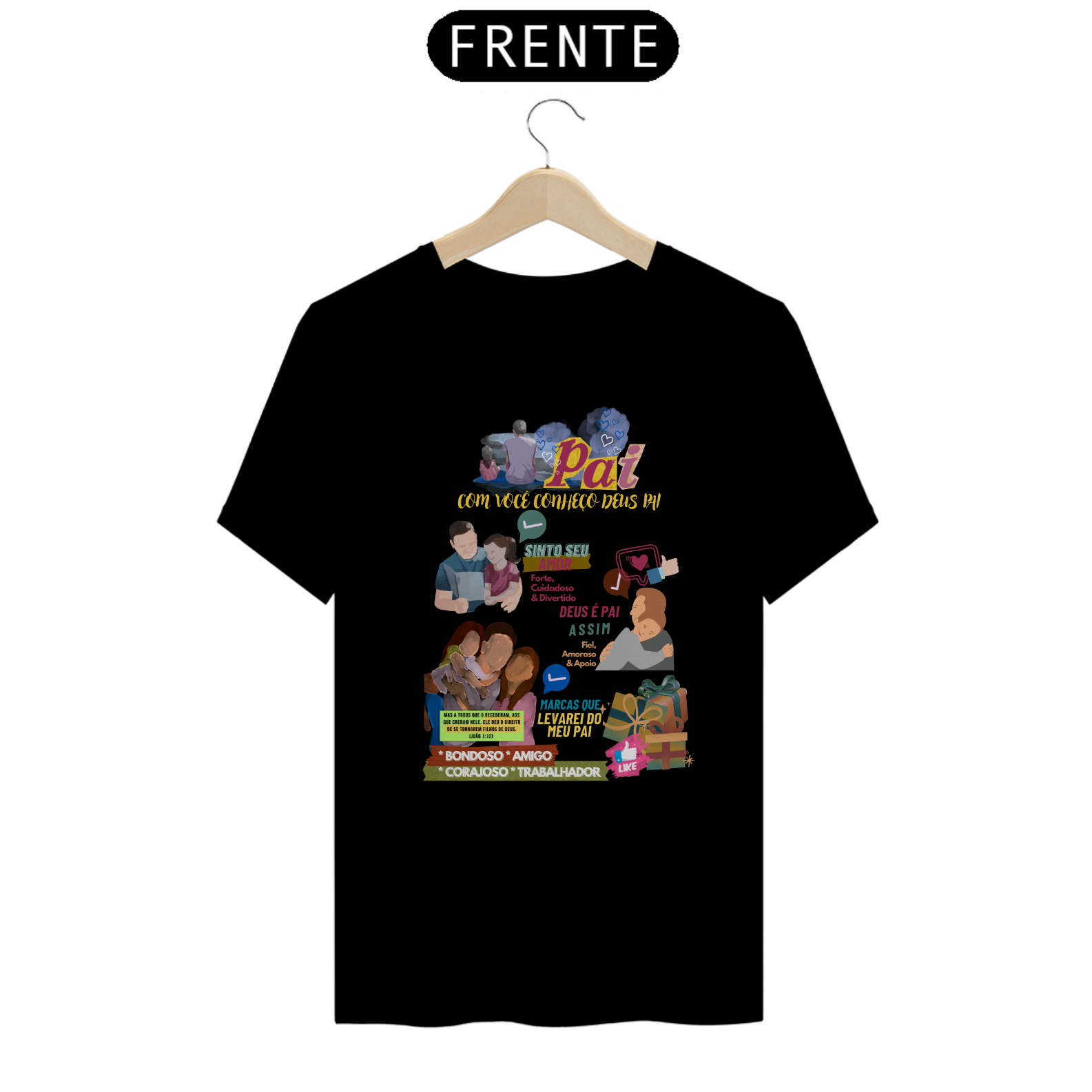 Em nossa vitrine principal, a Percy10 pendura no cabide central, uma Camiseta com Estampa de autoria de @mentebiblicaprismota, com o Tema: Pai, com você, conheço Deus Pai!