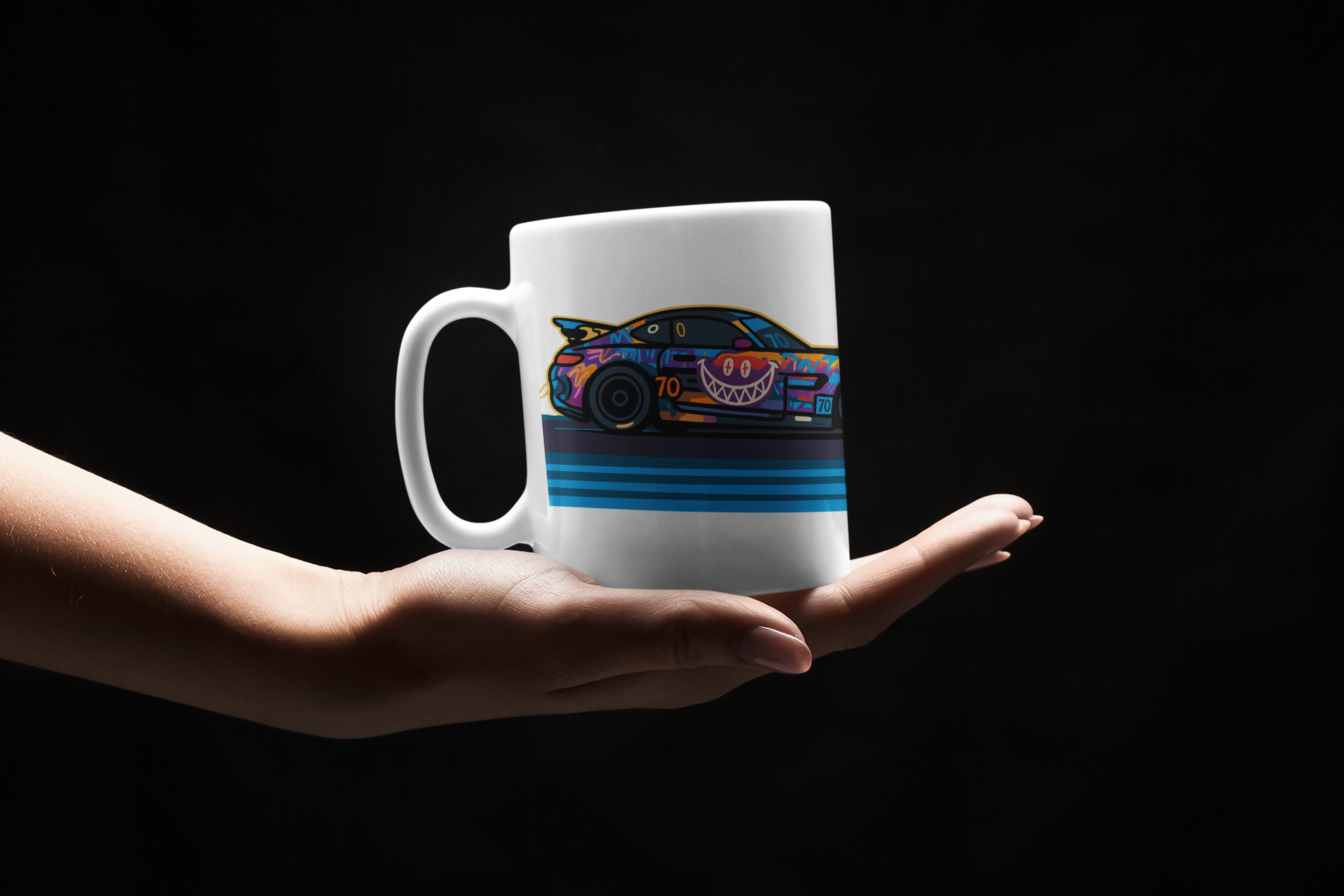 Feita em cerâmica de alta qualidade, com arte exclusiva do carro AMG GT4 Customizada #70 e identidade visual da equipe.