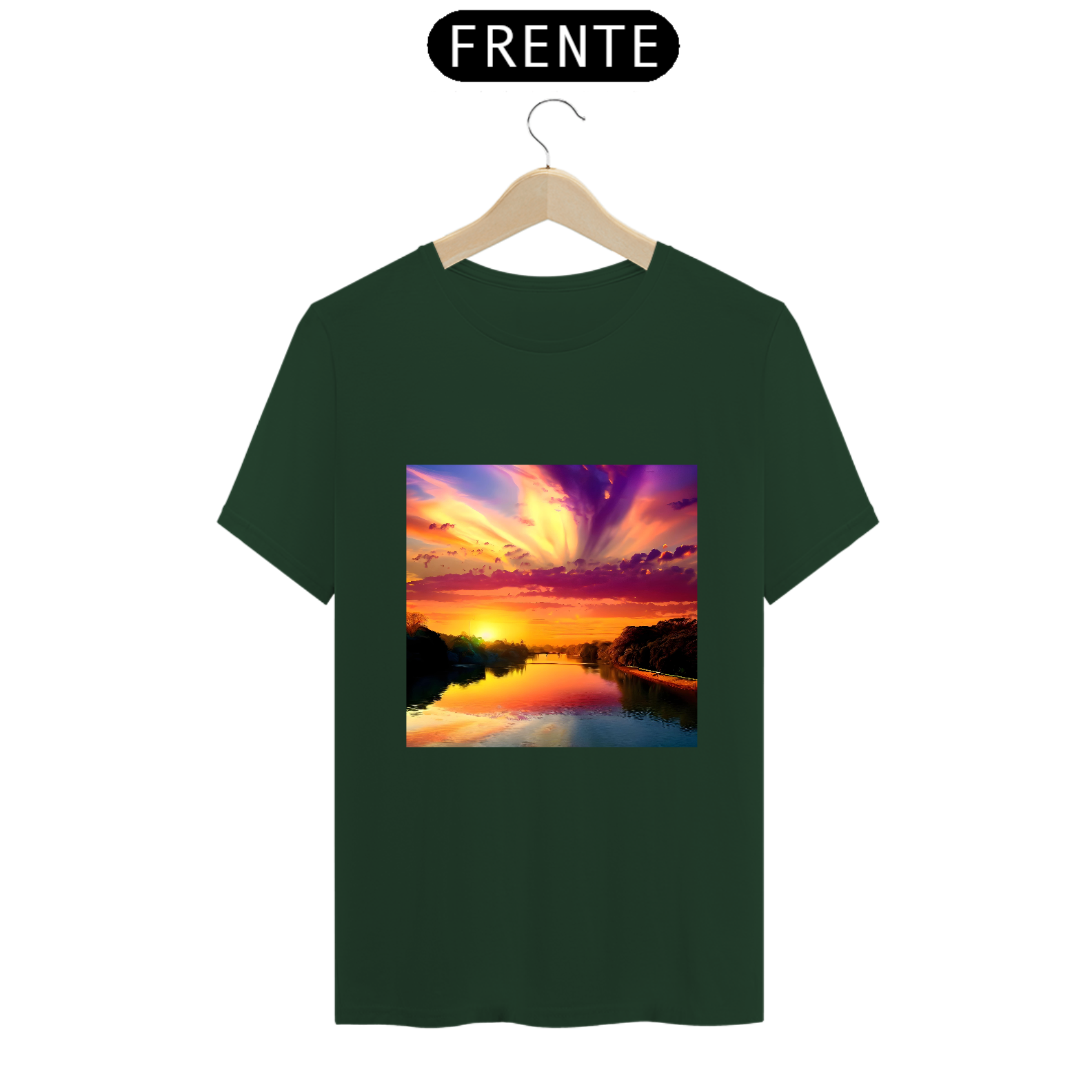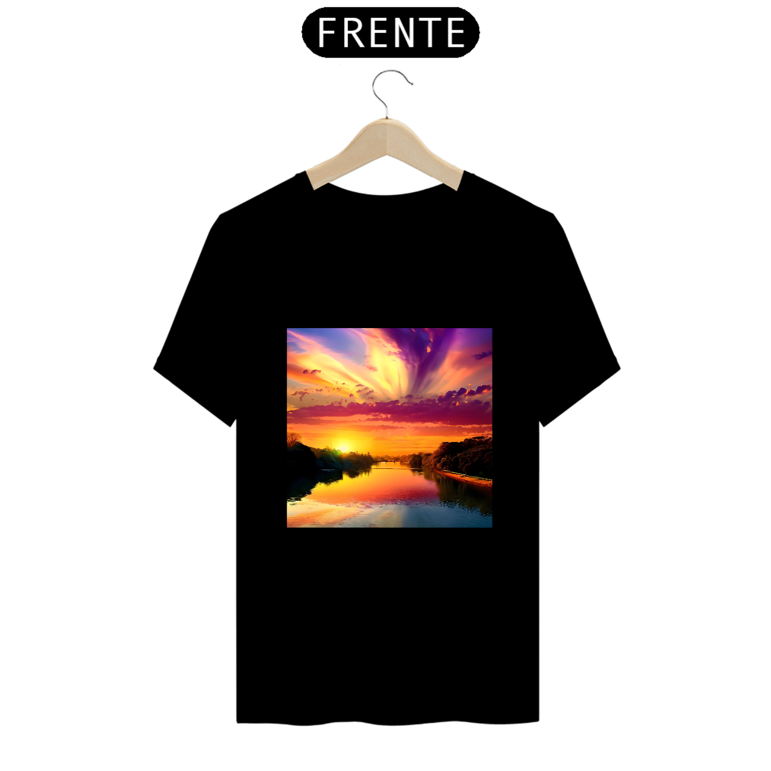 Com um pôr do sol refletindo nas águas do rio e a cidade surgindo em um estilo artístico, essa camiseta captura a serenidade e a poesia da paisagem.