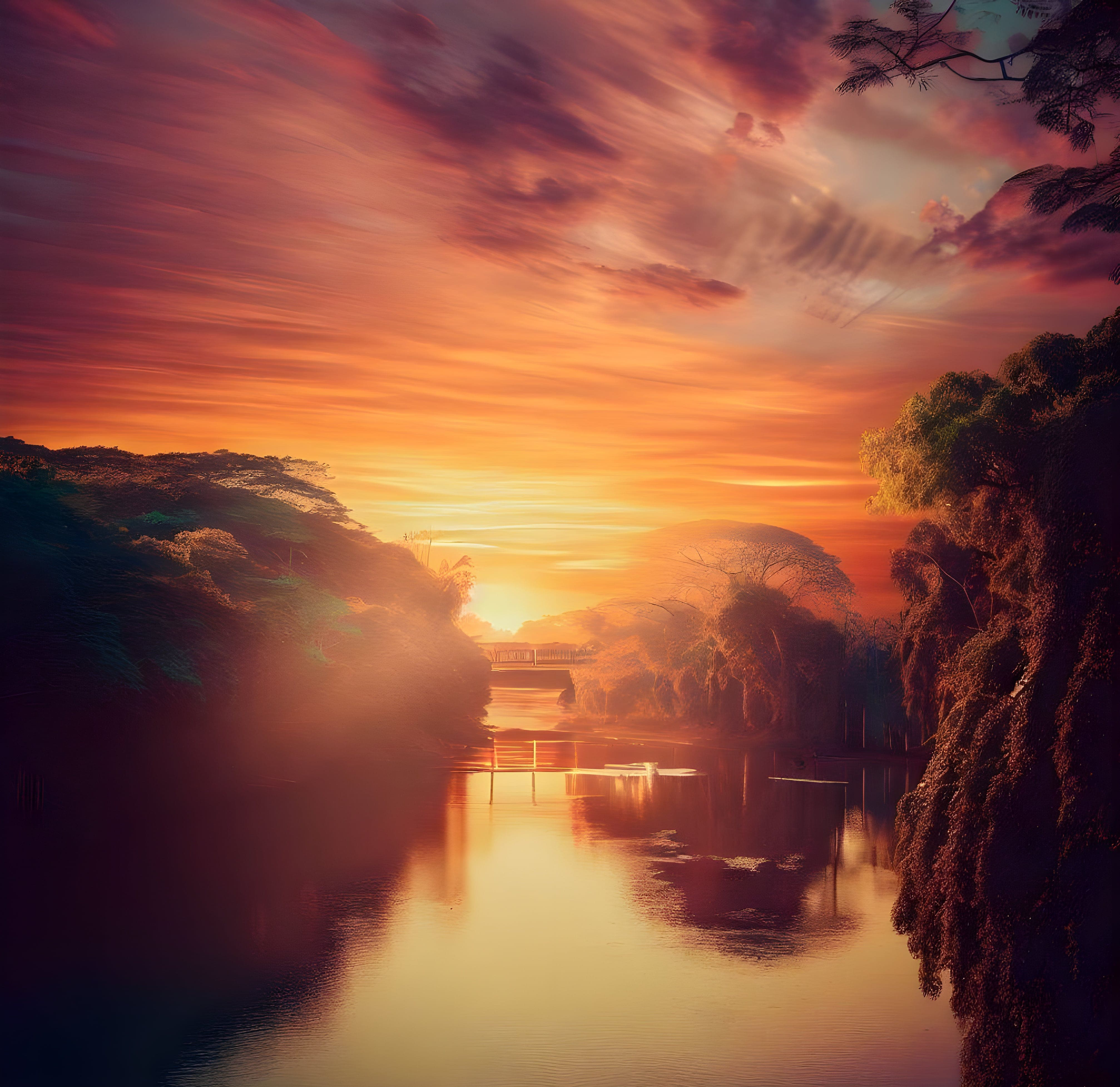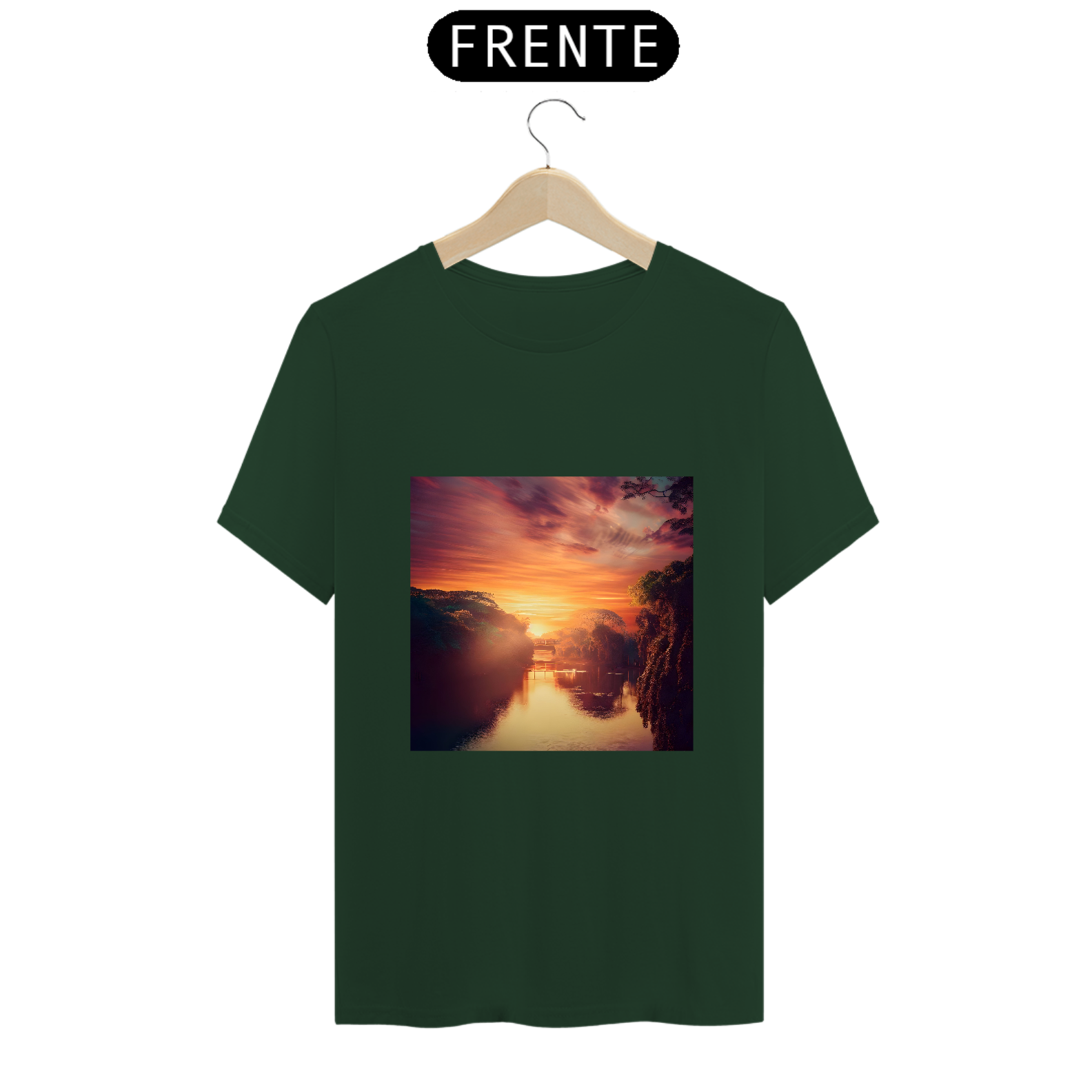 Com um pôr do sol refletindo nas águas do rio e a cidade surgindo em um estilo artístico, essa camiseta captura a serenidade e a poesia da paisagem.