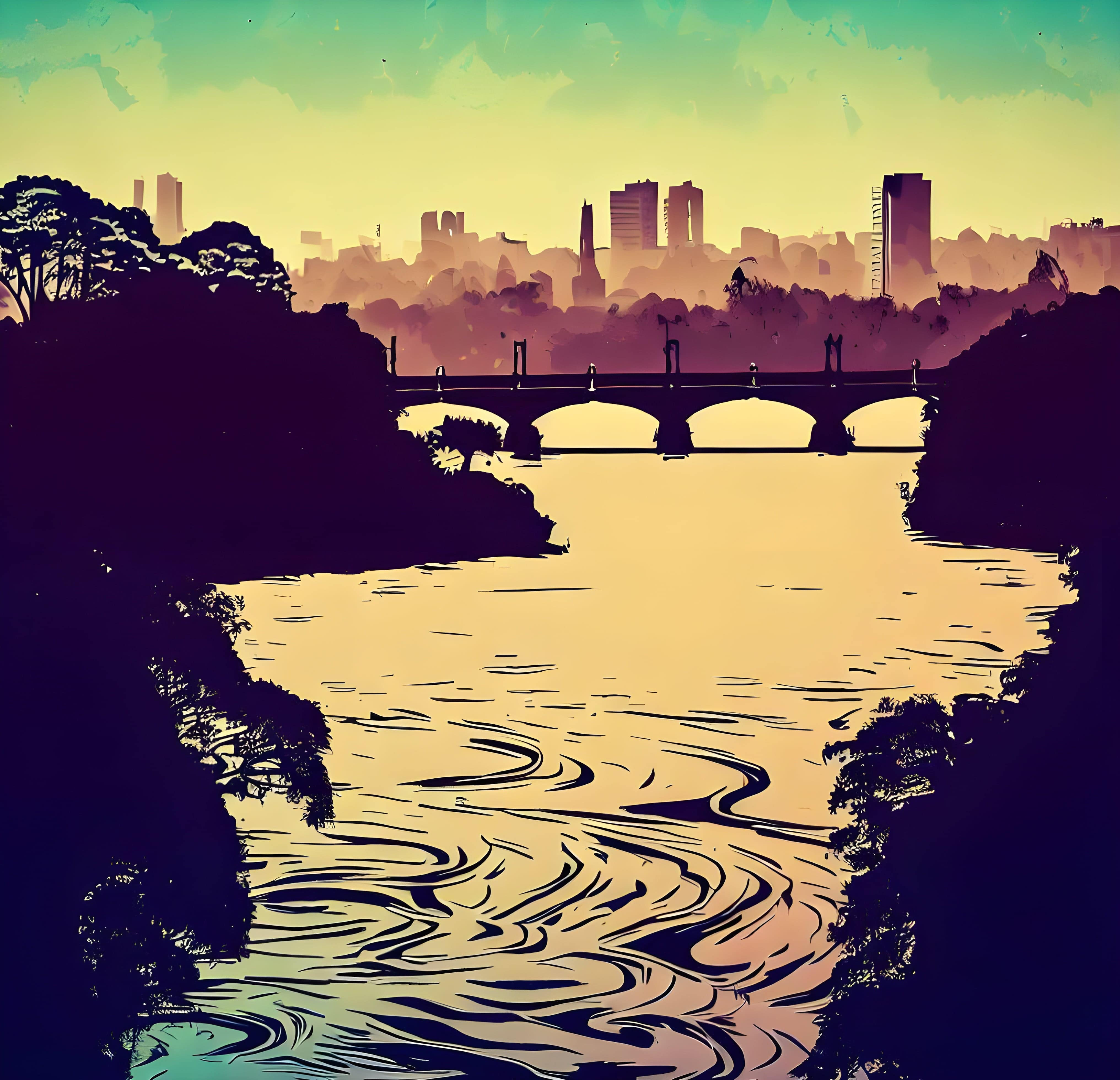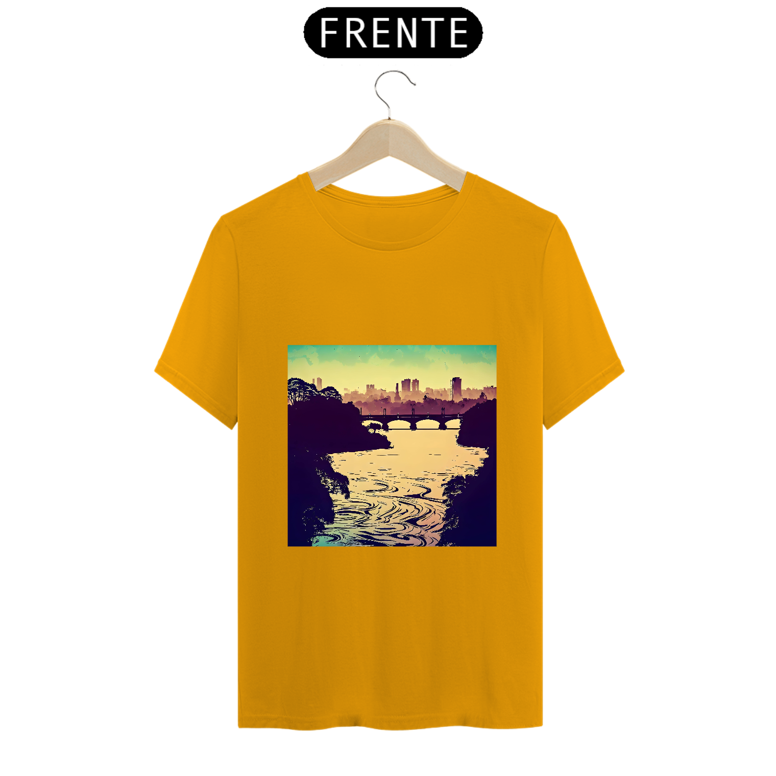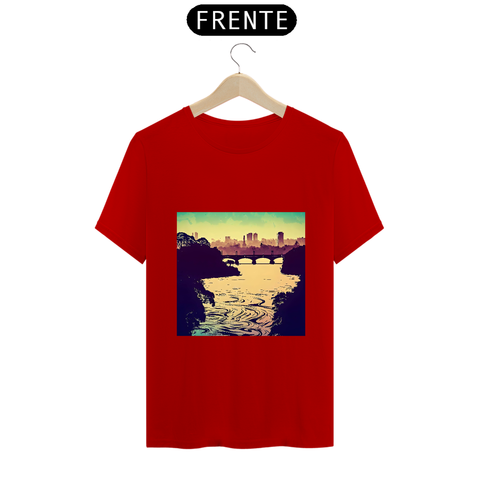 Com um pôr do sol refletindo nas águas do rio e a cidade surgindo em um estilo artístico, essa camiseta captura a serenidade e a poesia da paisagem.