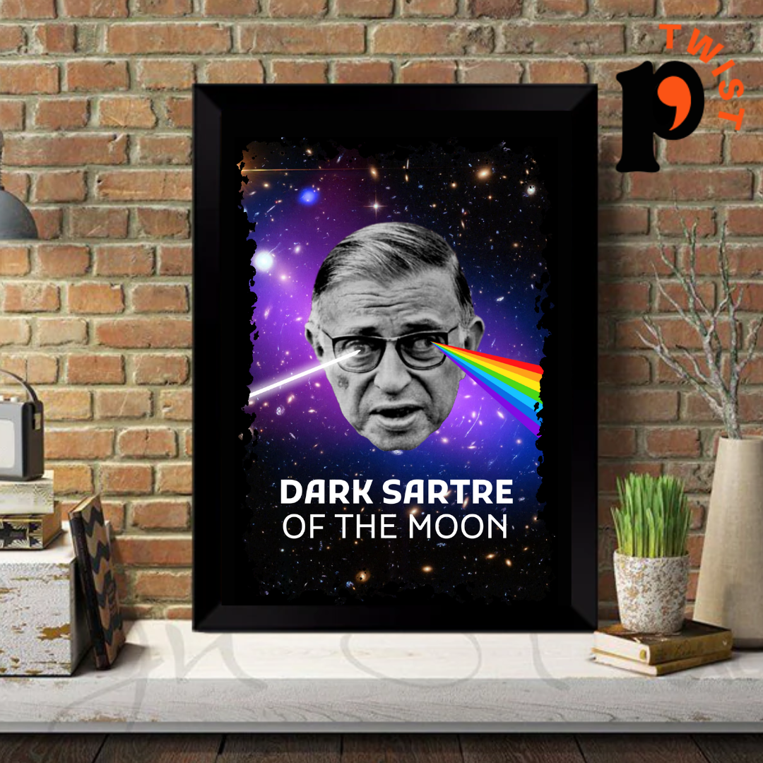 Explore a fusão entre filosofia e música no pôster Dark Sartre of the Moon. Inspirado em Sartre e no icônico álbum Dark Side of the Moon, este design exclusivo é perfeito para amantes de arte, reflexão e cultura pop. Adquira já!