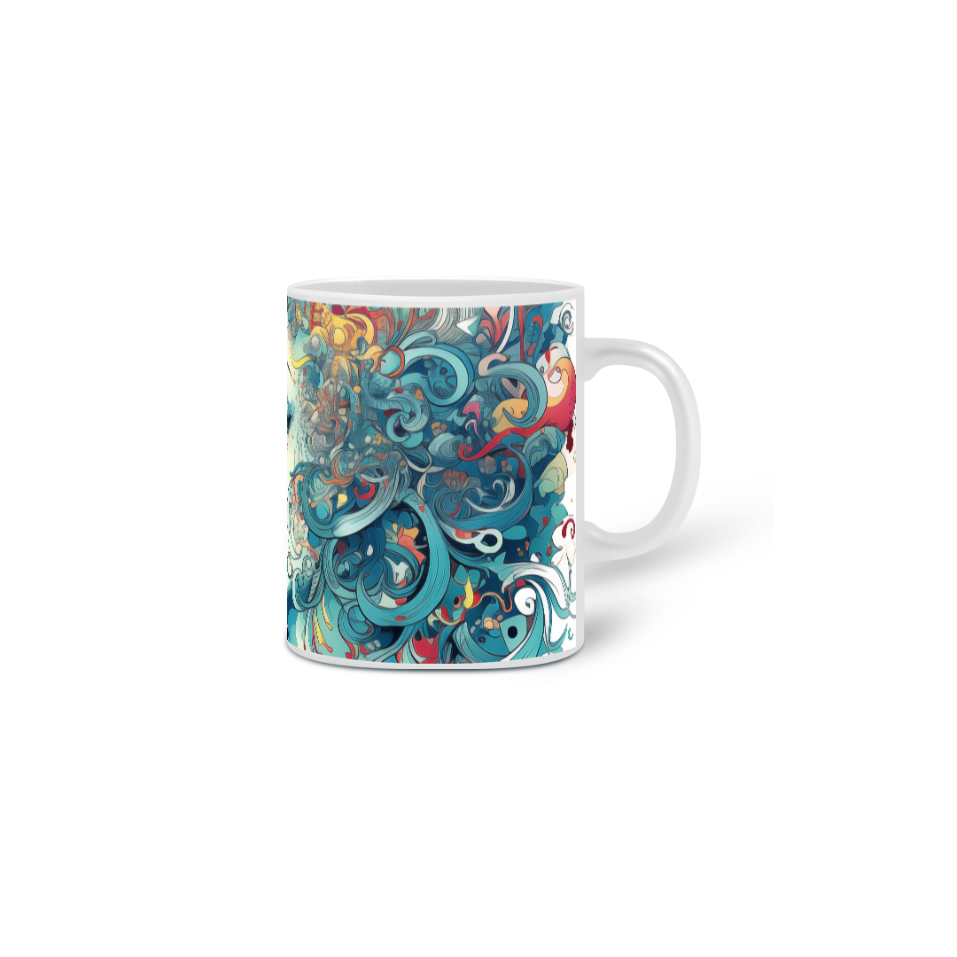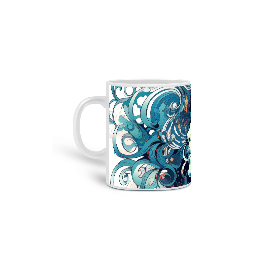 Caneca adornada com a imagem artística de uma mulher com características etéreas e uma paleta de cores que varia entre vários tons de azul e acentos de cores quentes. Seu cabelo flui em cachos estilizados e ondas, mesclando-se com elementos de design abstratos e figuras pequenas, como estrelas e formas fluidas, que criam uma composição harmoniosa em volta de seu perfil. A expressão da mulher é serena, com os olhos fechados, evocando uma sensação de tranquilidade e introspecção. Esta caneca é uma verdadeira peça de arte, ideal para quem aprecia design sofisticado e quer adicionar um toque de beleza e calma ao seu cotidiano.