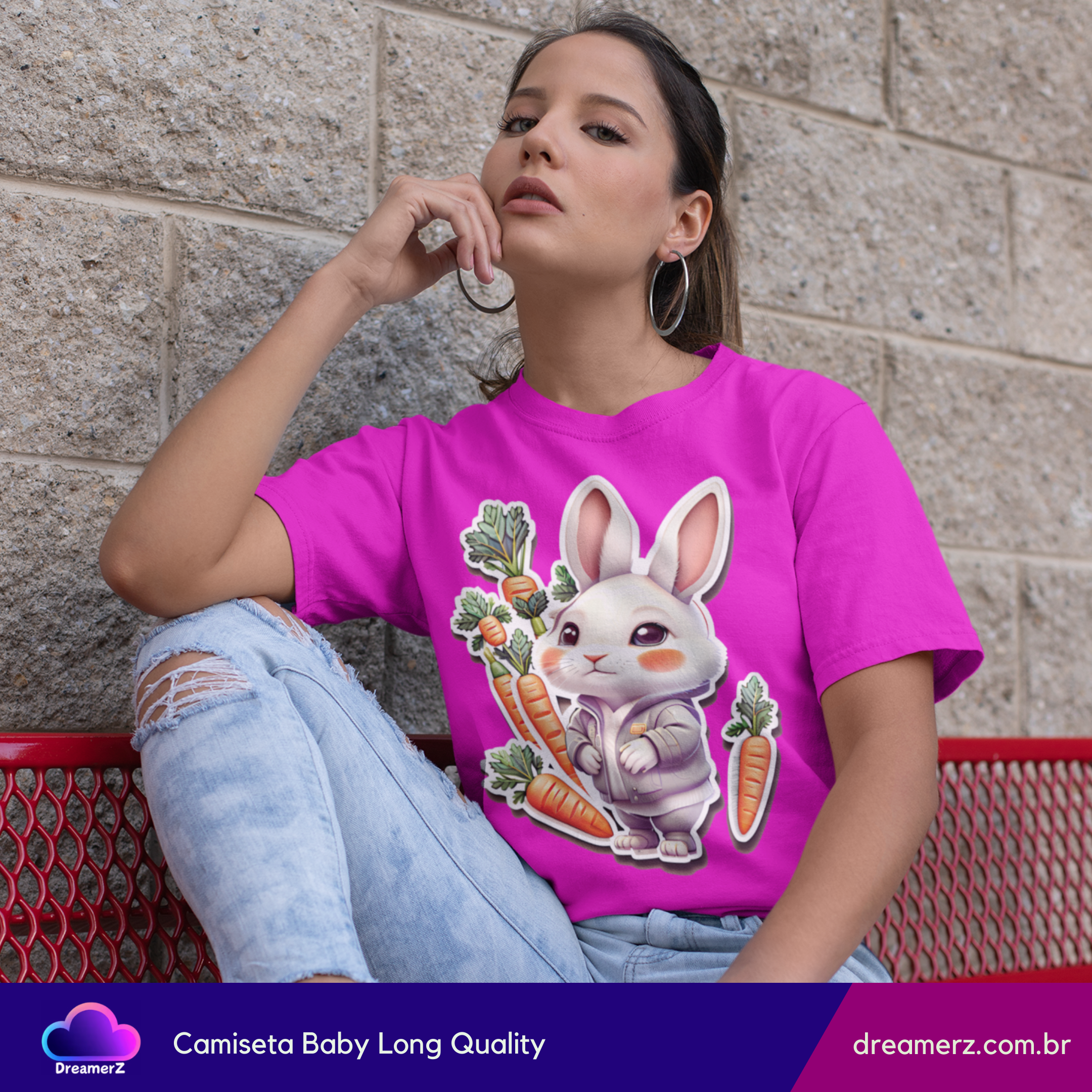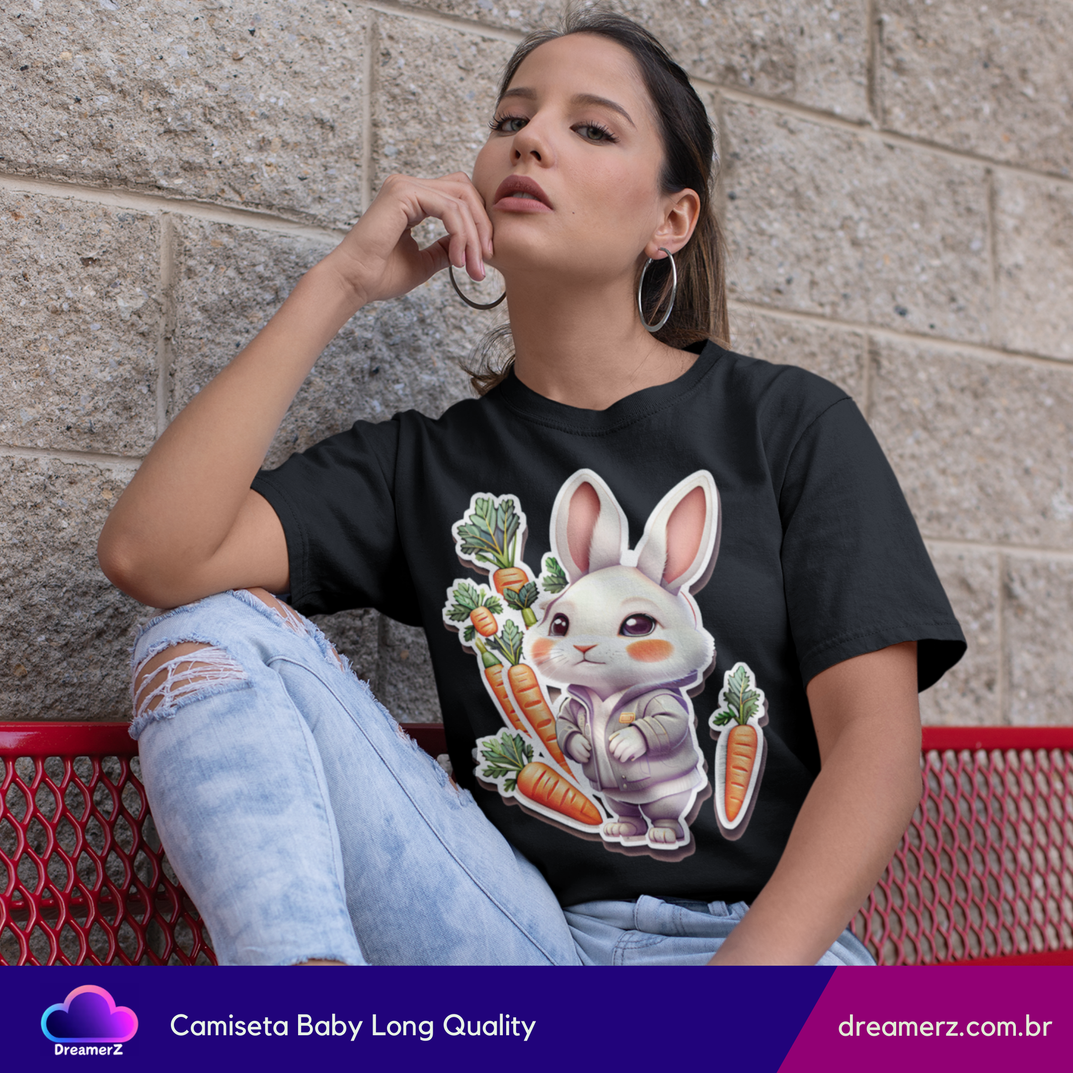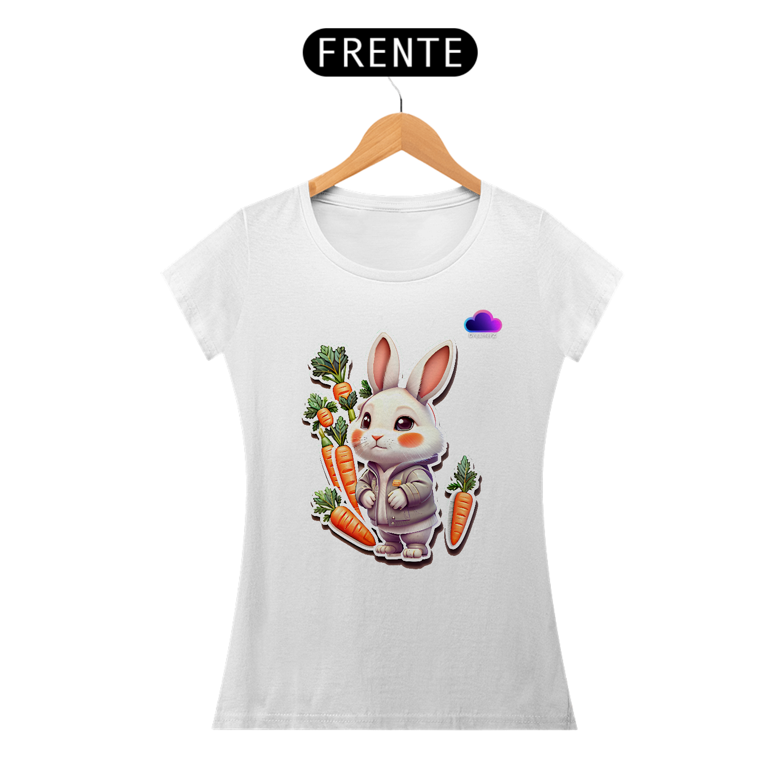 Essa é daquelas camisetas que arrancam sorrisos à primeira vista! Com um coelhinho fofo vestindo moletom e rodeado por cenouras, essa estampa é puro carinho estampado em tecido.