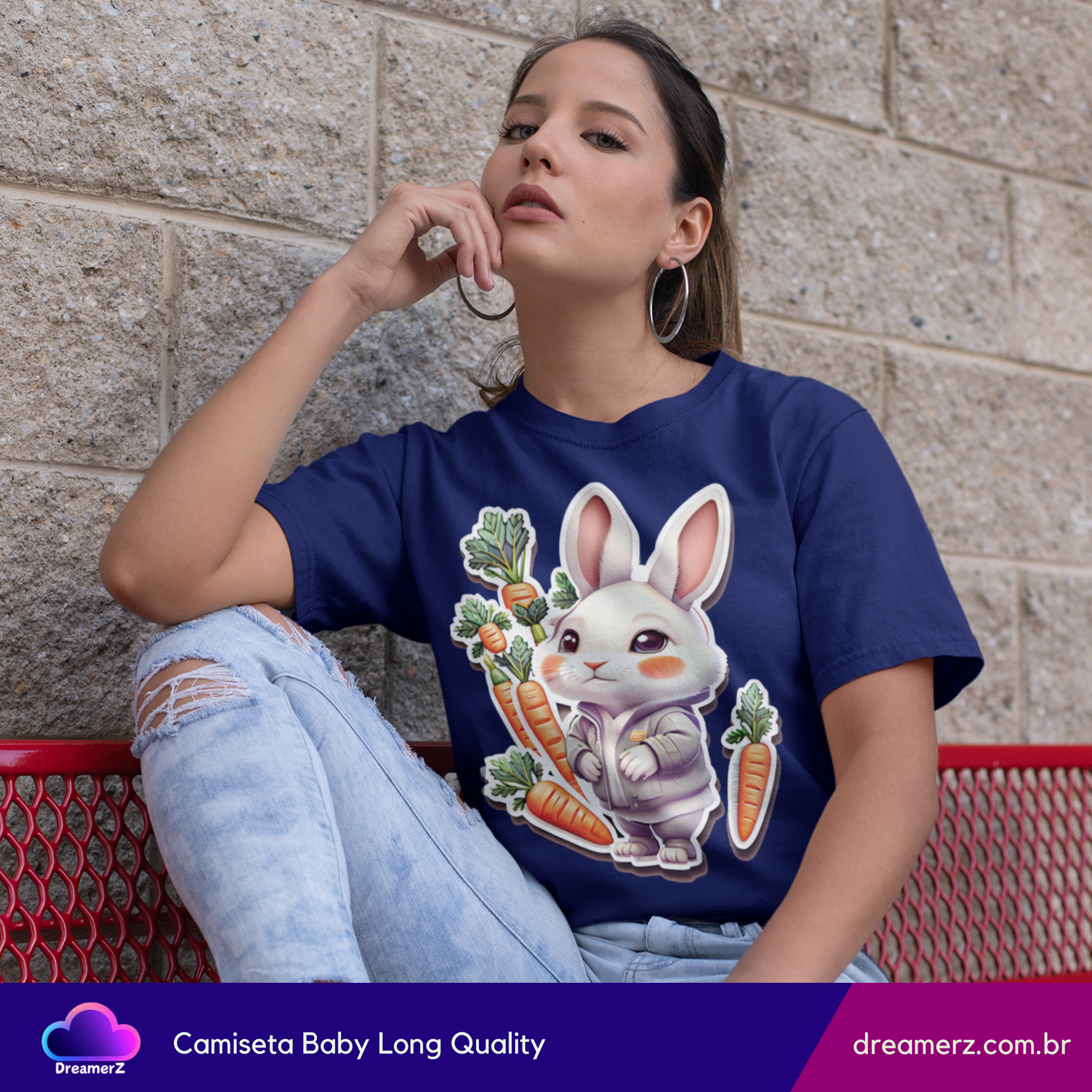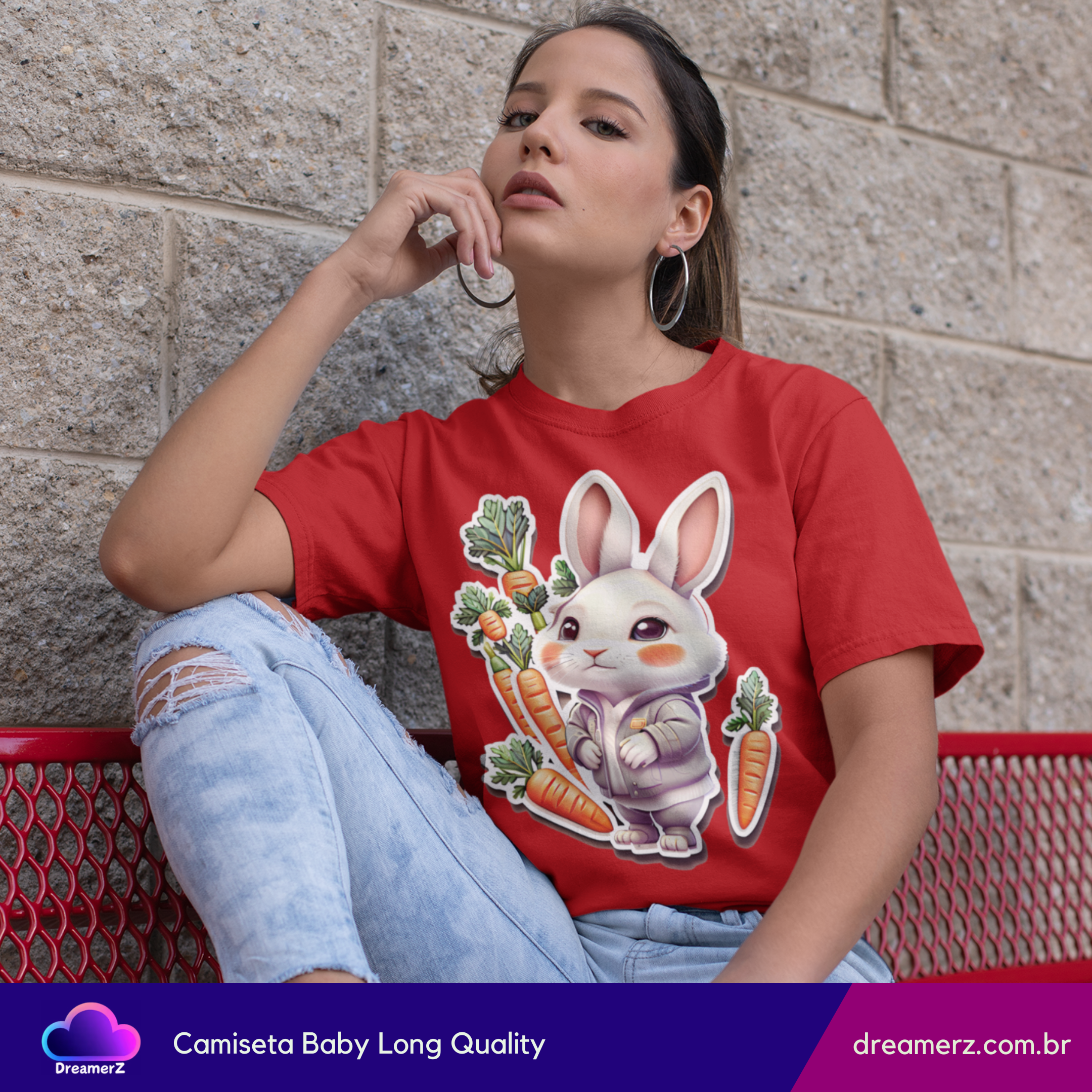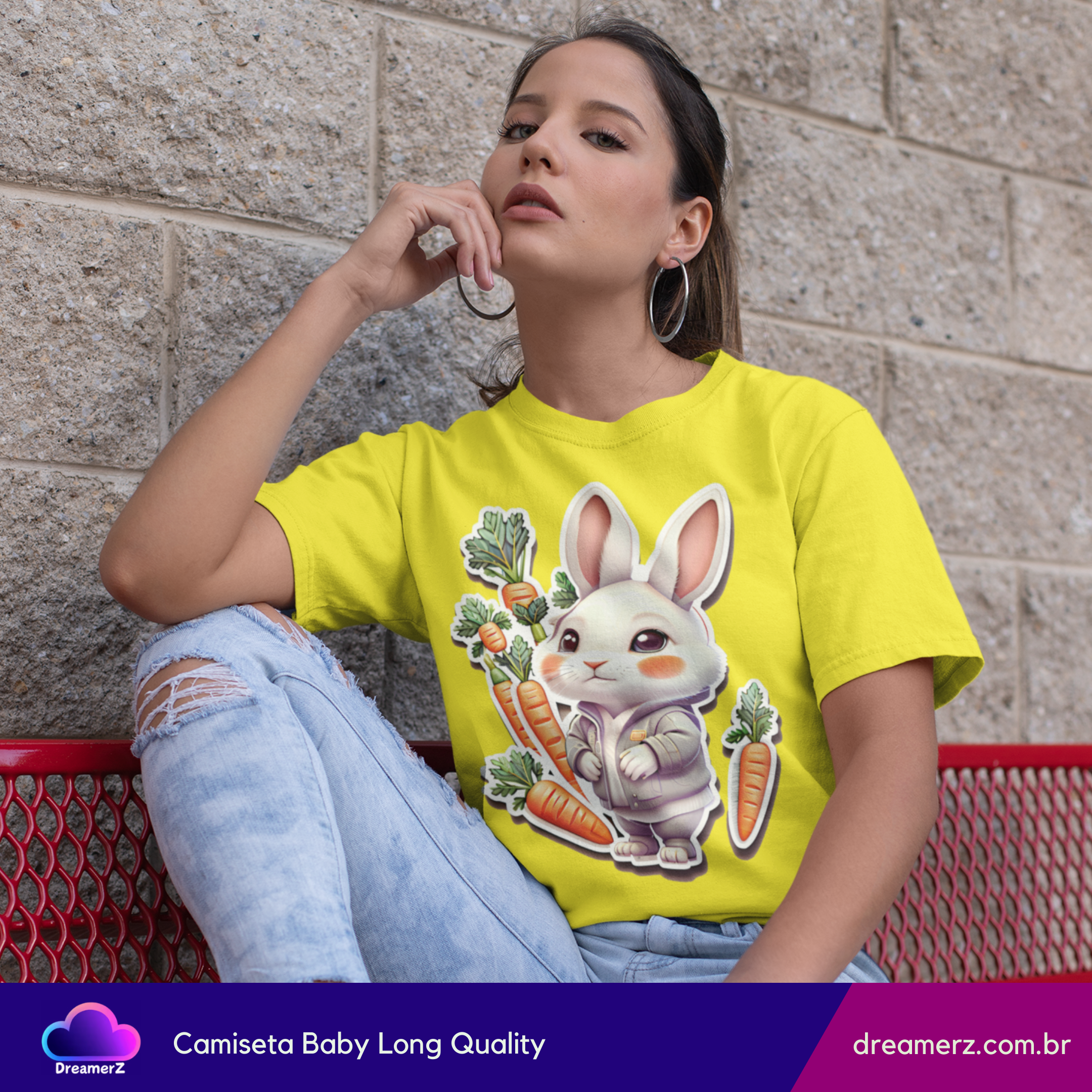 Essa é daquelas camisetas que arrancam sorrisos à primeira vista! Com um coelhinho fofo vestindo moletom e rodeado por cenouras, essa estampa é puro carinho estampado em tecido.