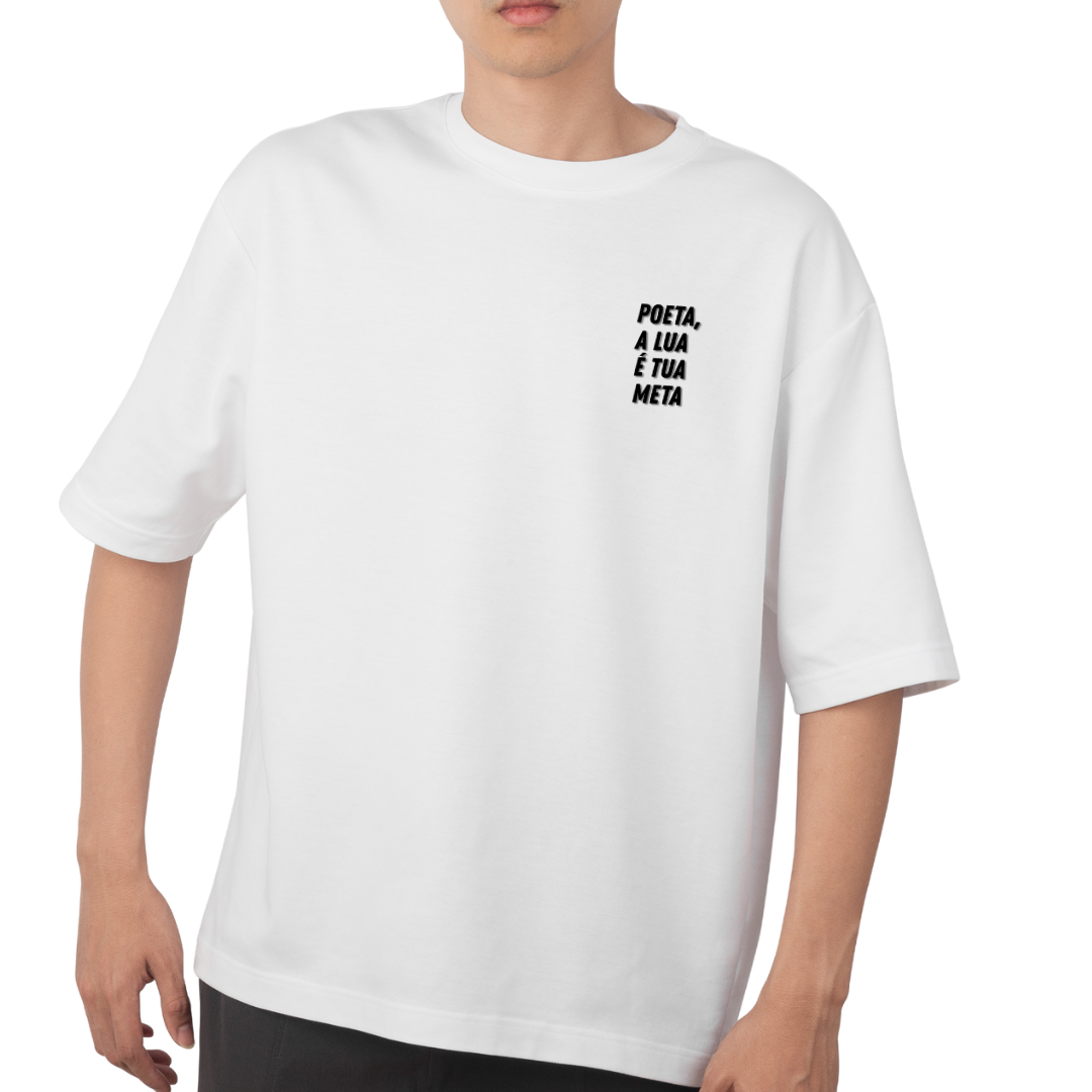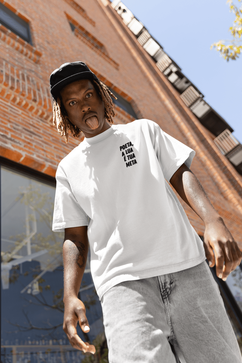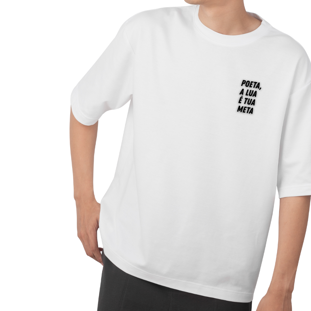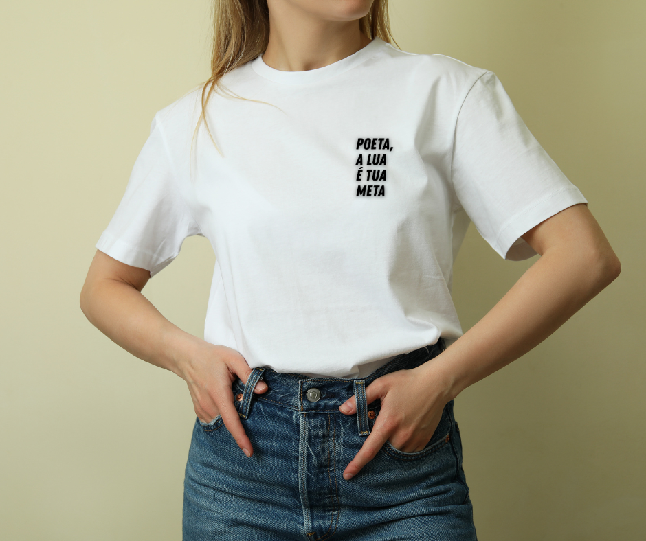 Sabe aquela inspiração do nada? Aquela agitação que você sente em certas noites? É a lua! E a estampa “Poeta” traz o verso final do poema que abre o livro “poêmio”, primeira inspiração para essa coleção de camisetas.